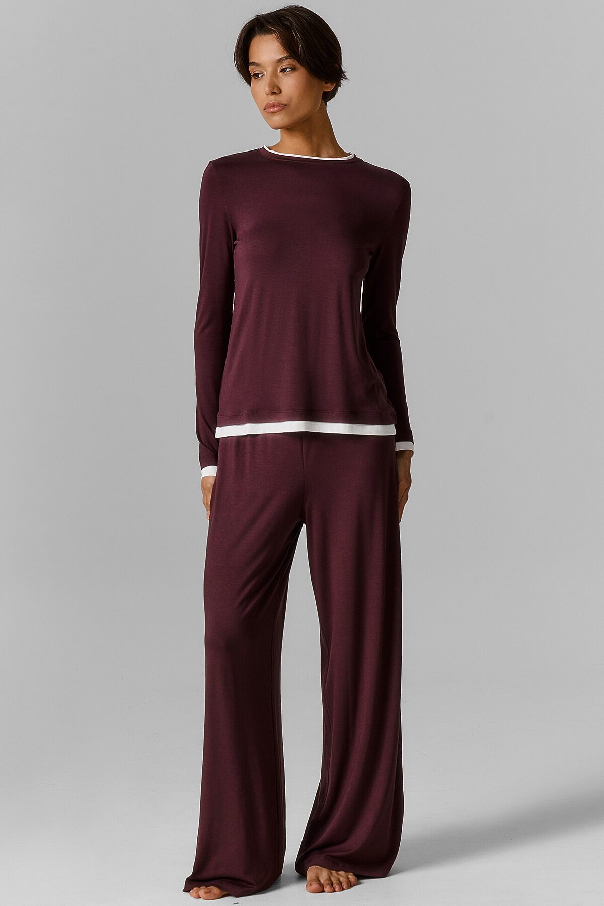 Комплект состоит из джемпера и брюк. Джемпер полуприлегающего силуэта. Горловина круглой формы обработана обтачкой из основного полотна, с имитацией двойной обтачки. Рукава втачные длинные. По низу рукава и джемпера отрезная деталь имитация поддетого джемпера. Брюки прямые свободные. Посадка средняя. Пояс цельнокроеный с эластичной тесьмой внутри (внутр 20мм 20RV). Нижний срез обработан швом вподгибку.