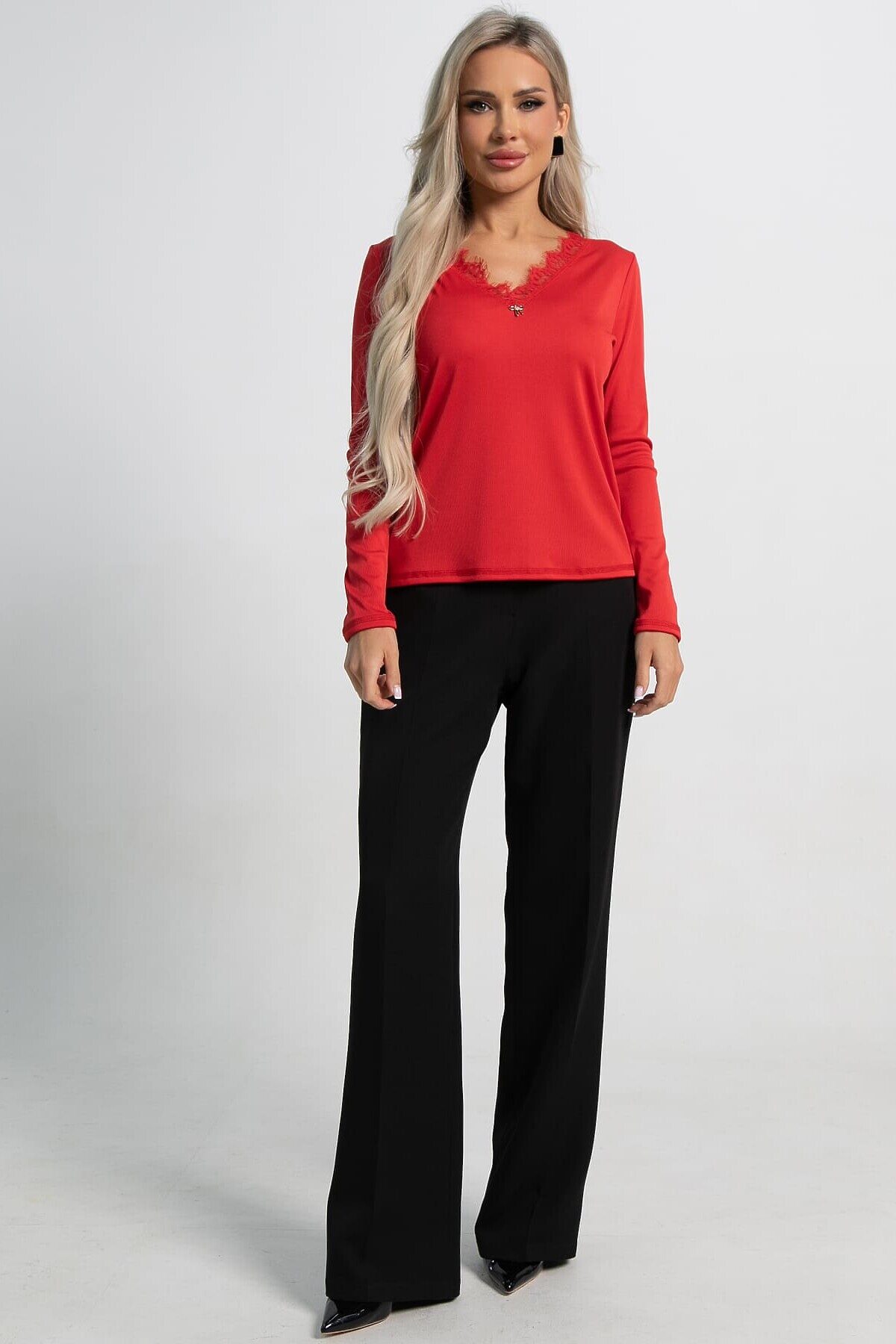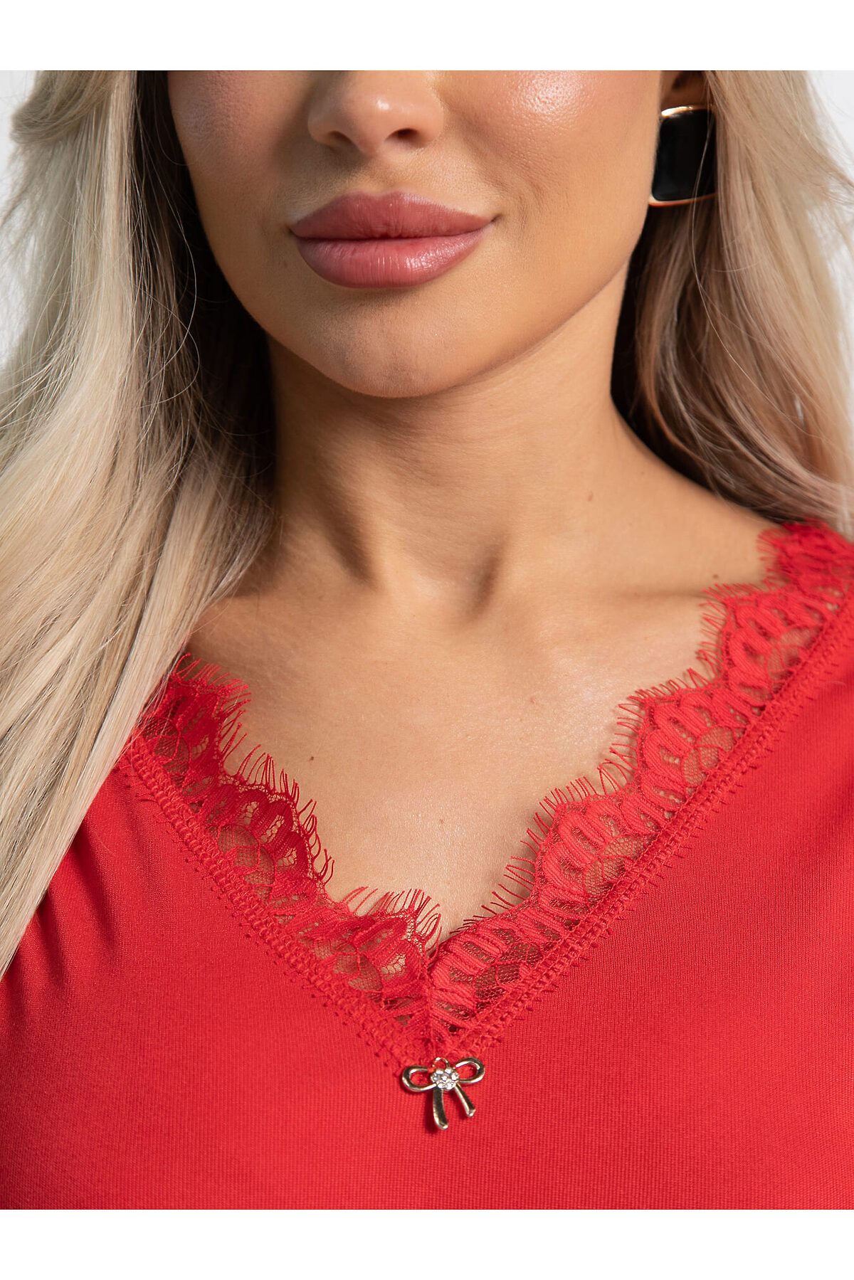 Пополните свой гардероб стильной новинкой — блузой из трикотажа в красивом красном цвете. Эта модель — идеальное сочетание элегантности, комфорта и универсальности, что делает её незаменимой как для повседневного ношения, так и для особых случаев. V-образный вырез элегантно удлиняет шею и придаёт образу женственности. Вырез украшен нежным кружевом, что превращает простую блузу в изысканный элемент гардероба, добавляя утонченности и шарма. Небольшая, но выразительная металлическая подвеска в форме бантика золотистого цвета, аккуратно пришитая к блузе, придаёт ей дополнительную изюминку и завершает образ. Носите её с джинсами для повседневного стиля, сочетайте с юбкой или брюками для офисного ансамбля или для встреч с друзьями. Эта блуза станет стильным дополнением к любому вашему наряду.