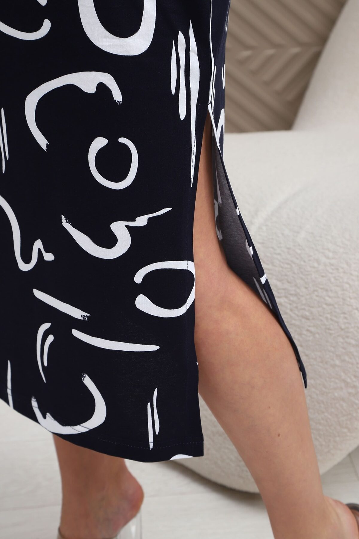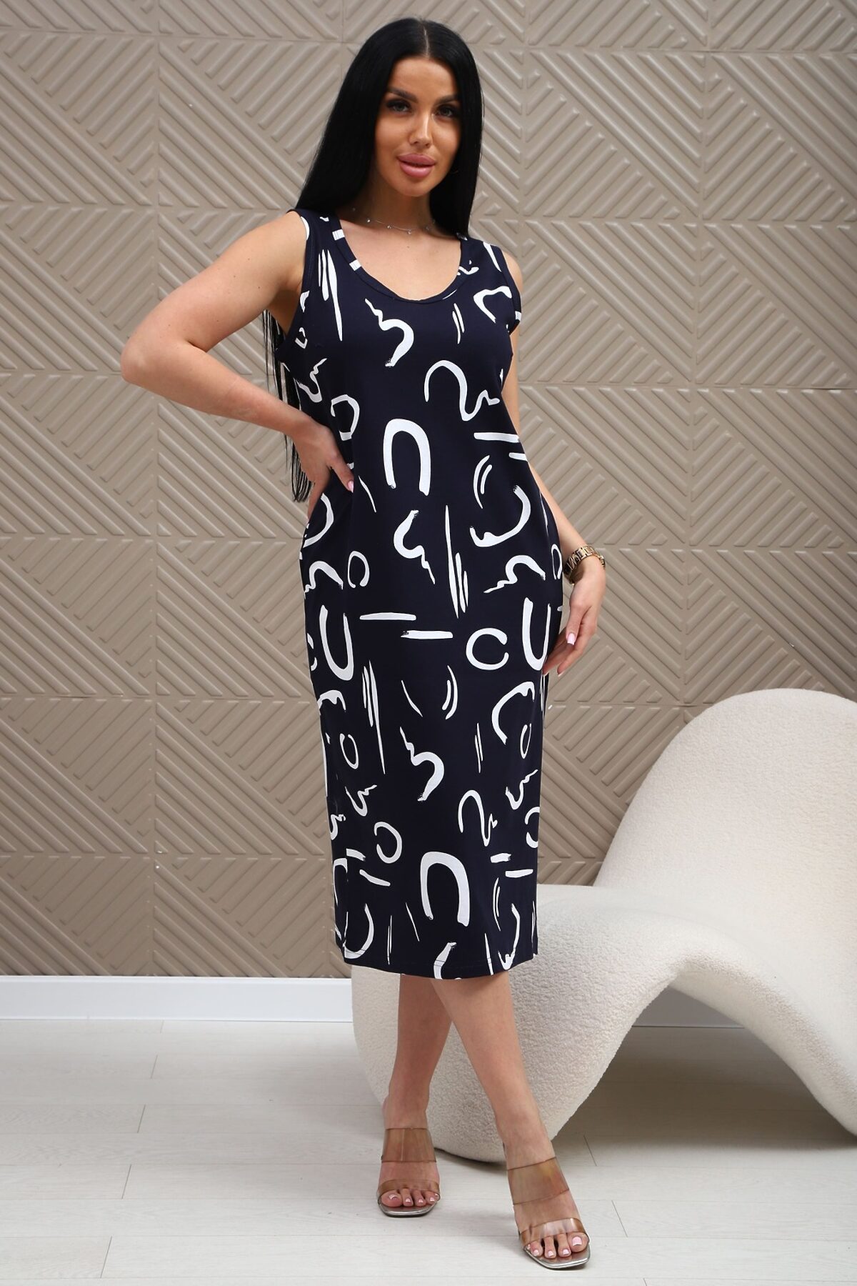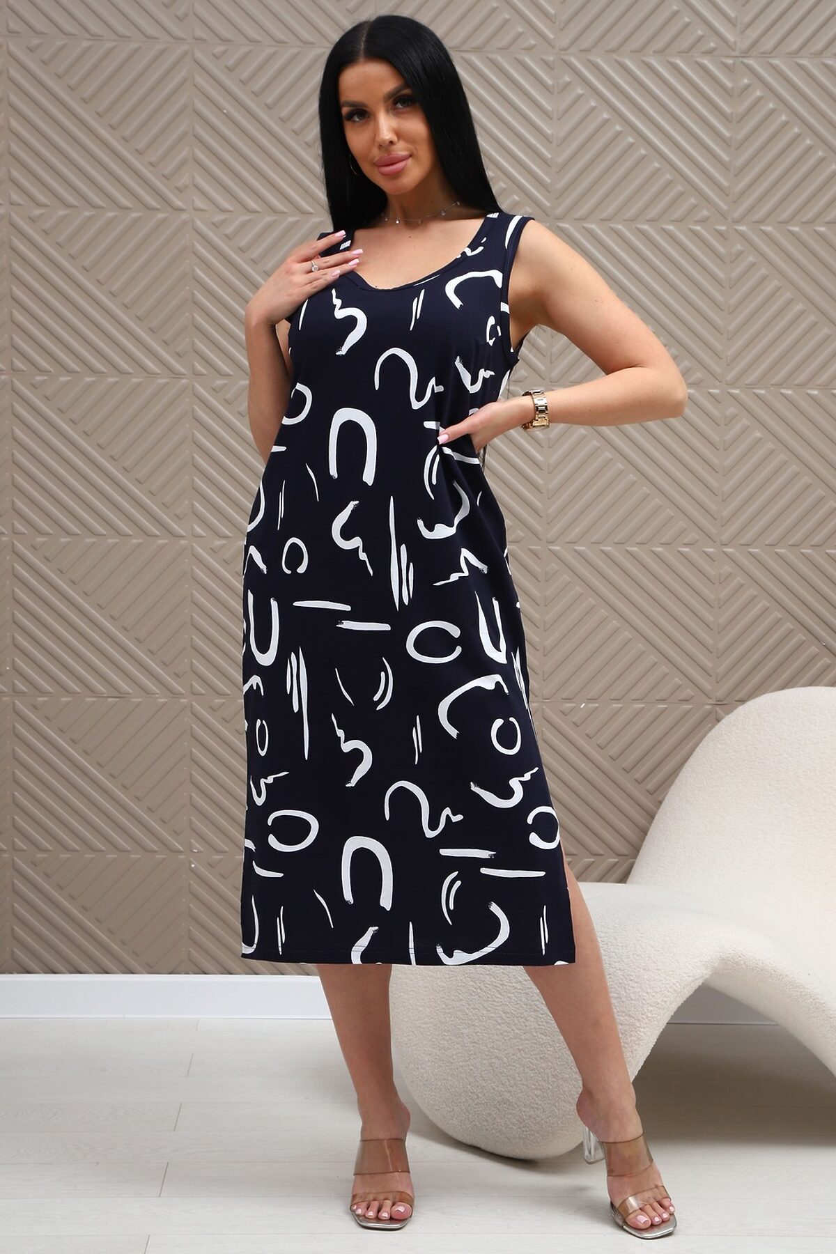 Сарафан из натурального трикотажного полотна. Силуэт прямой, слегка приталенный. Горловина V-образной формы. Без рукава. Спинка и перед гладкие, без рельефов. В боковых швах карманы. Разрезы по низу с двух сторон. Низ изделия прямой.