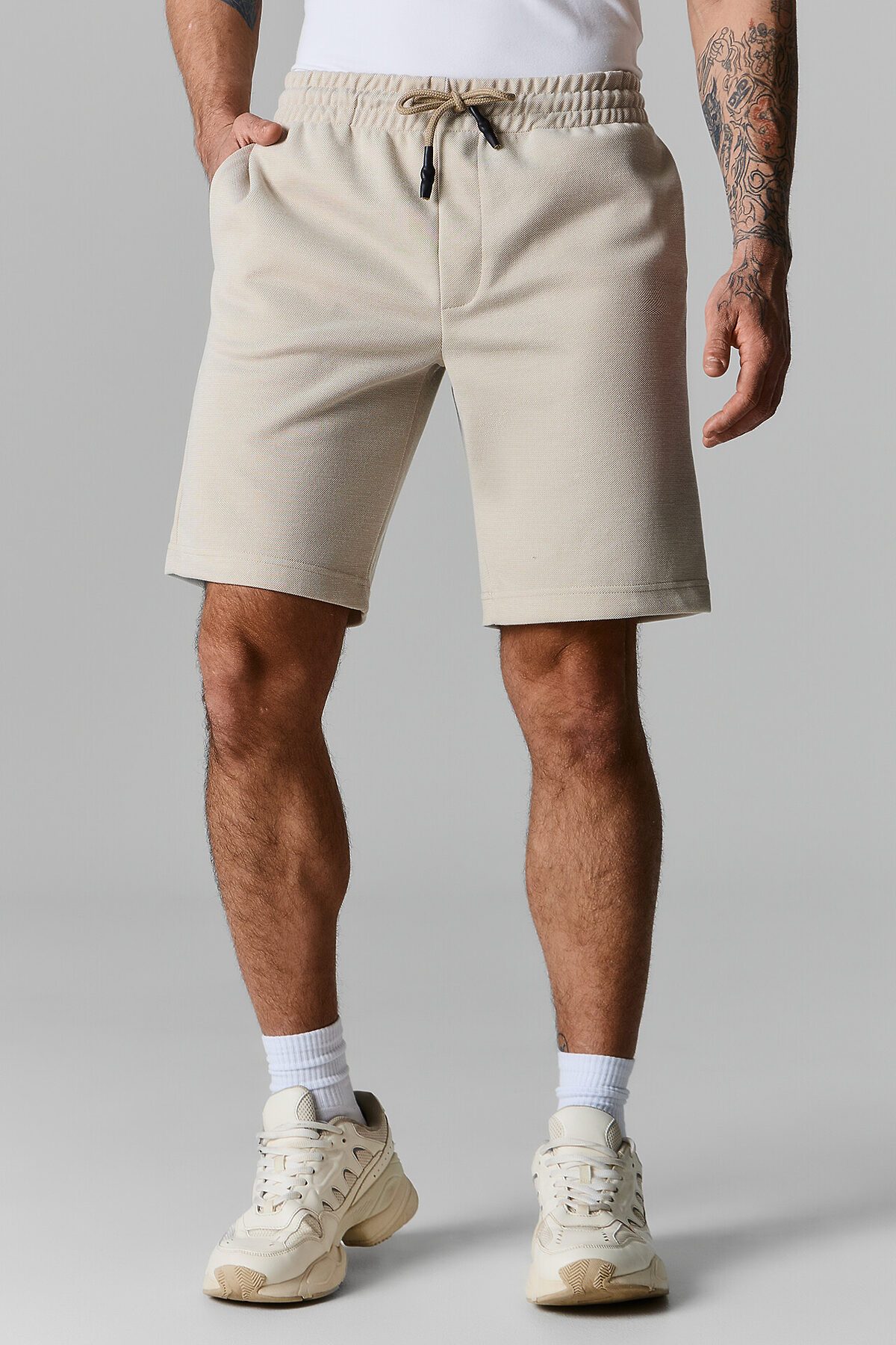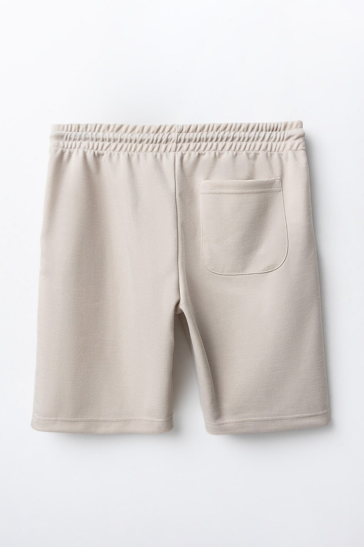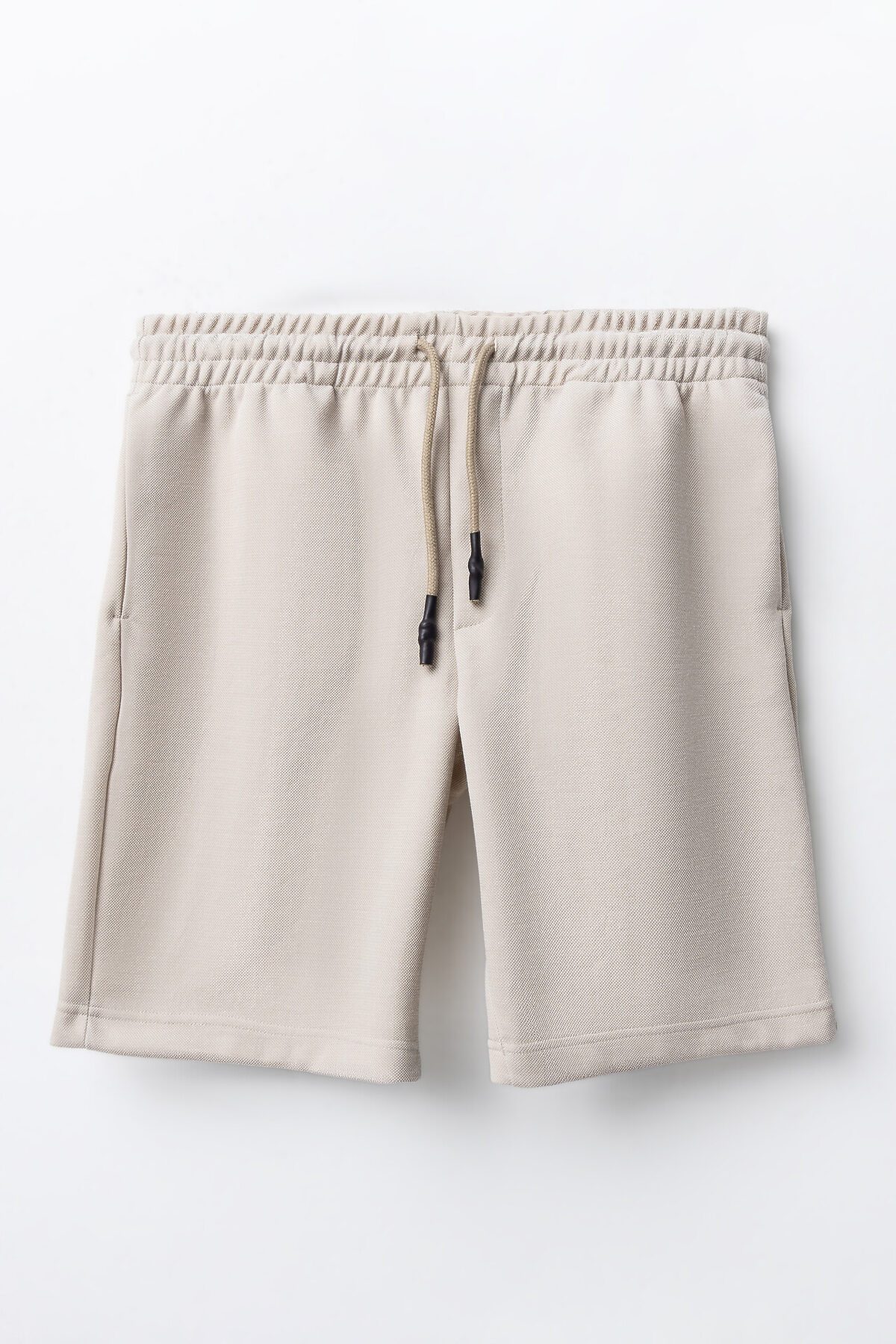 Шорты изготовлены из трикотажного полотна интерлок. Шорты прямого силуэта. Пояс цельнокроеный с эластичной тесьмой внутри. С внешней стороны пояса пробиты петли и втянут шнур с узлом на концах и с термоусадочной трубкой . В боковых швах обработаны карманы, подкладка кармана из основного полотна. На левой передней половинке проложена декоративная строчка - имитация гульфика. Низ шорт с отворотами.
