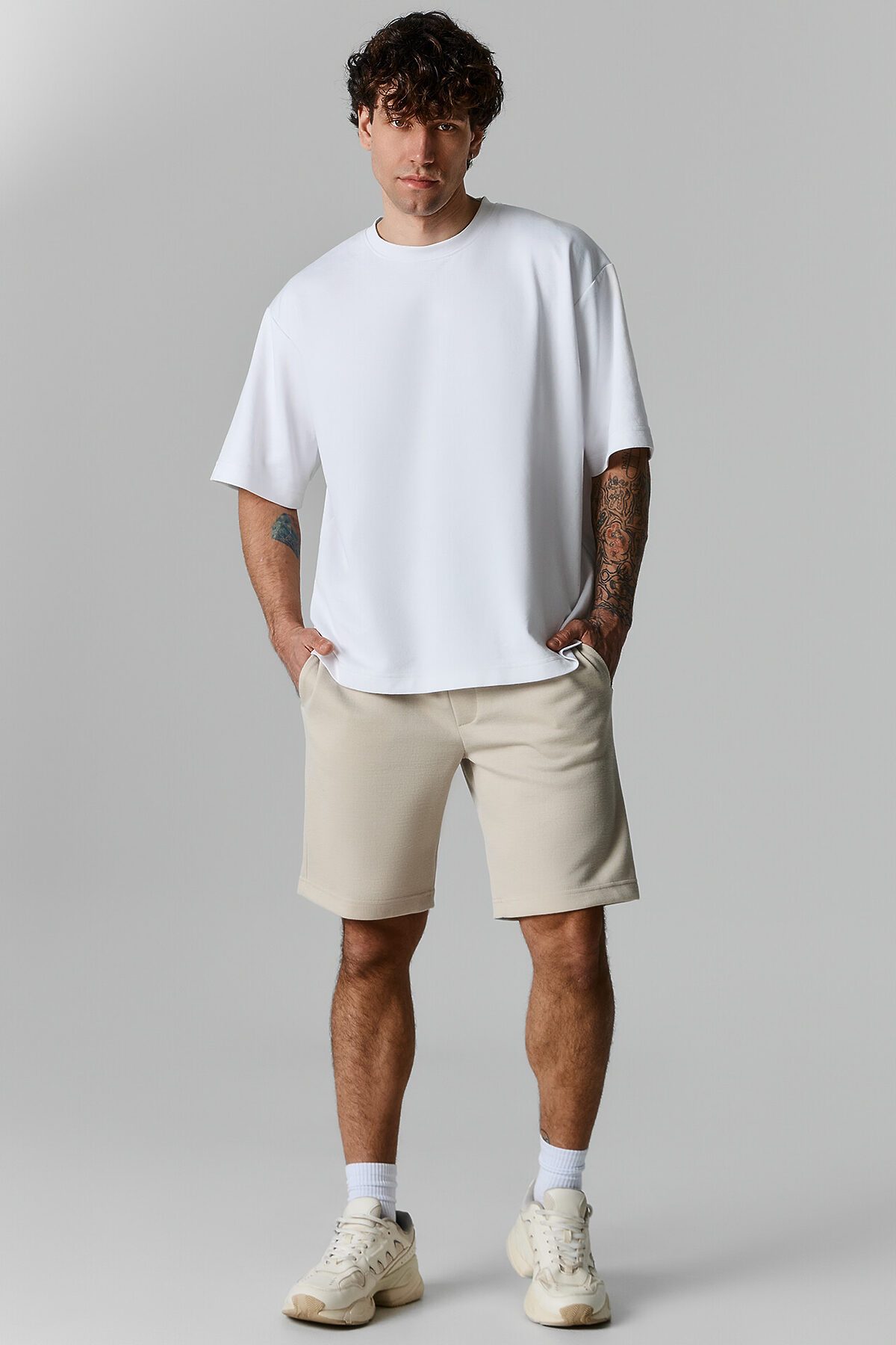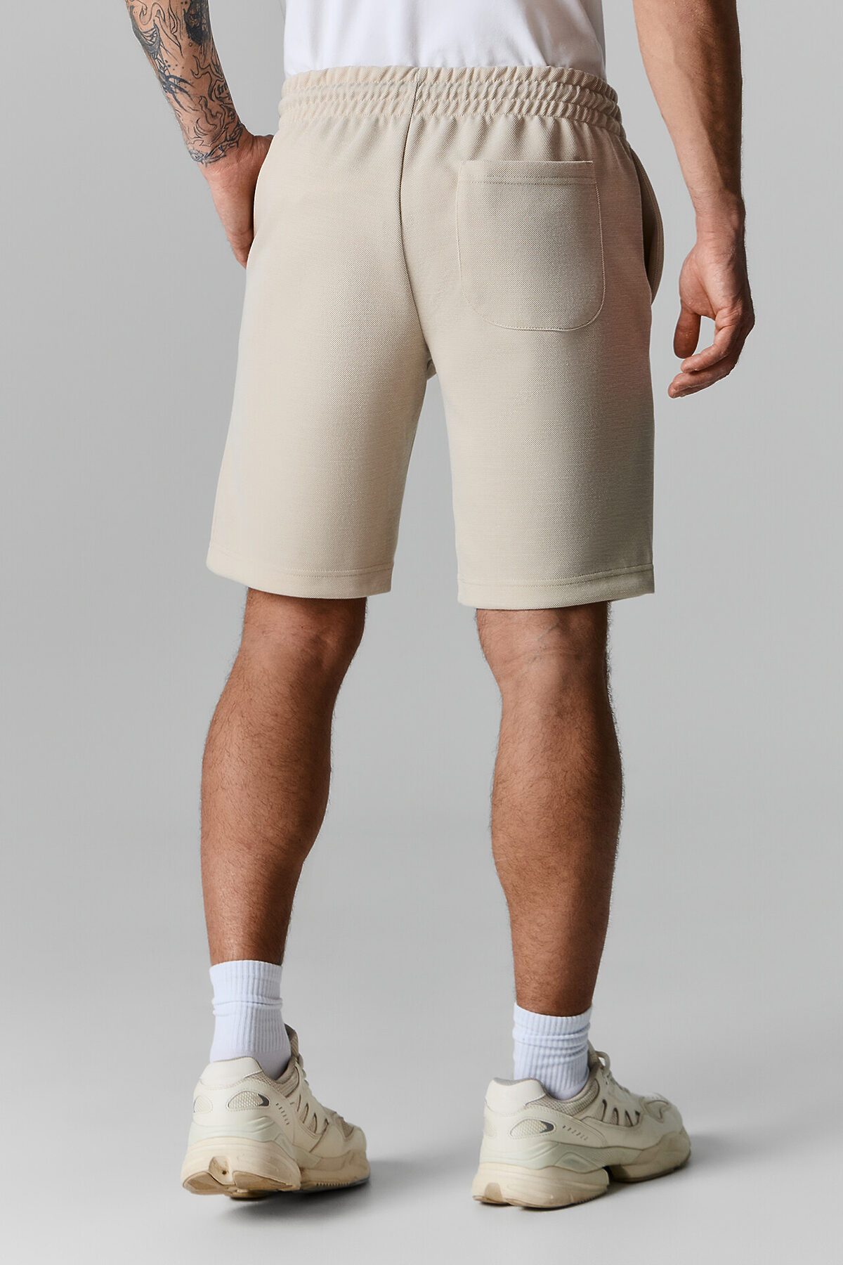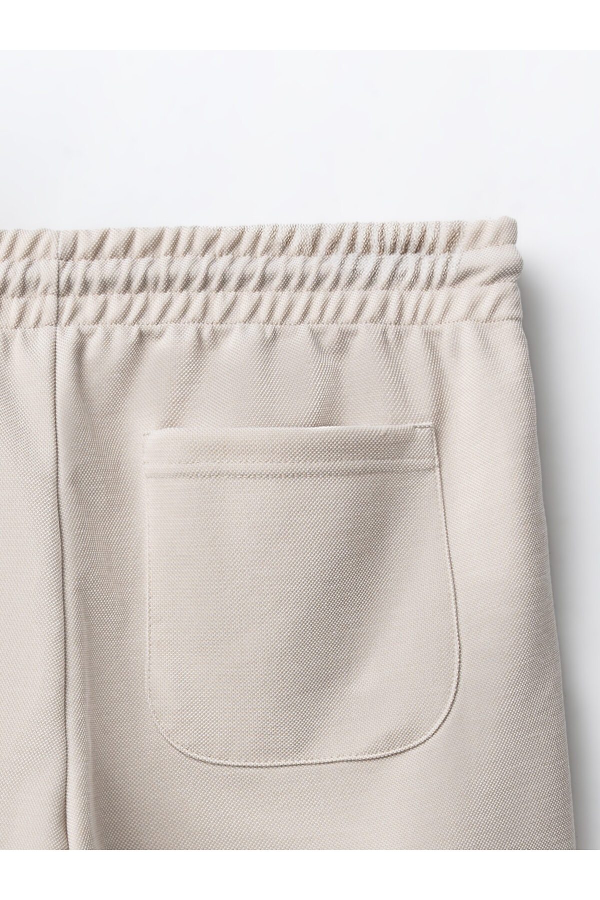Шорты изготовлены из трикотажного полотна интерлок. Шорты прямого силуэта. Пояс цельнокроеный с эластичной тесьмой внутри. С внешней стороны пояса пробиты петли и втянут шнур с узлом на концах и с термоусадочной трубкой . В боковых швах обработаны карманы, подкладка кармана из основного полотна. На левой передней половинке проложена декоративная строчка - имитация гульфика. Низ шорт с отворотами.