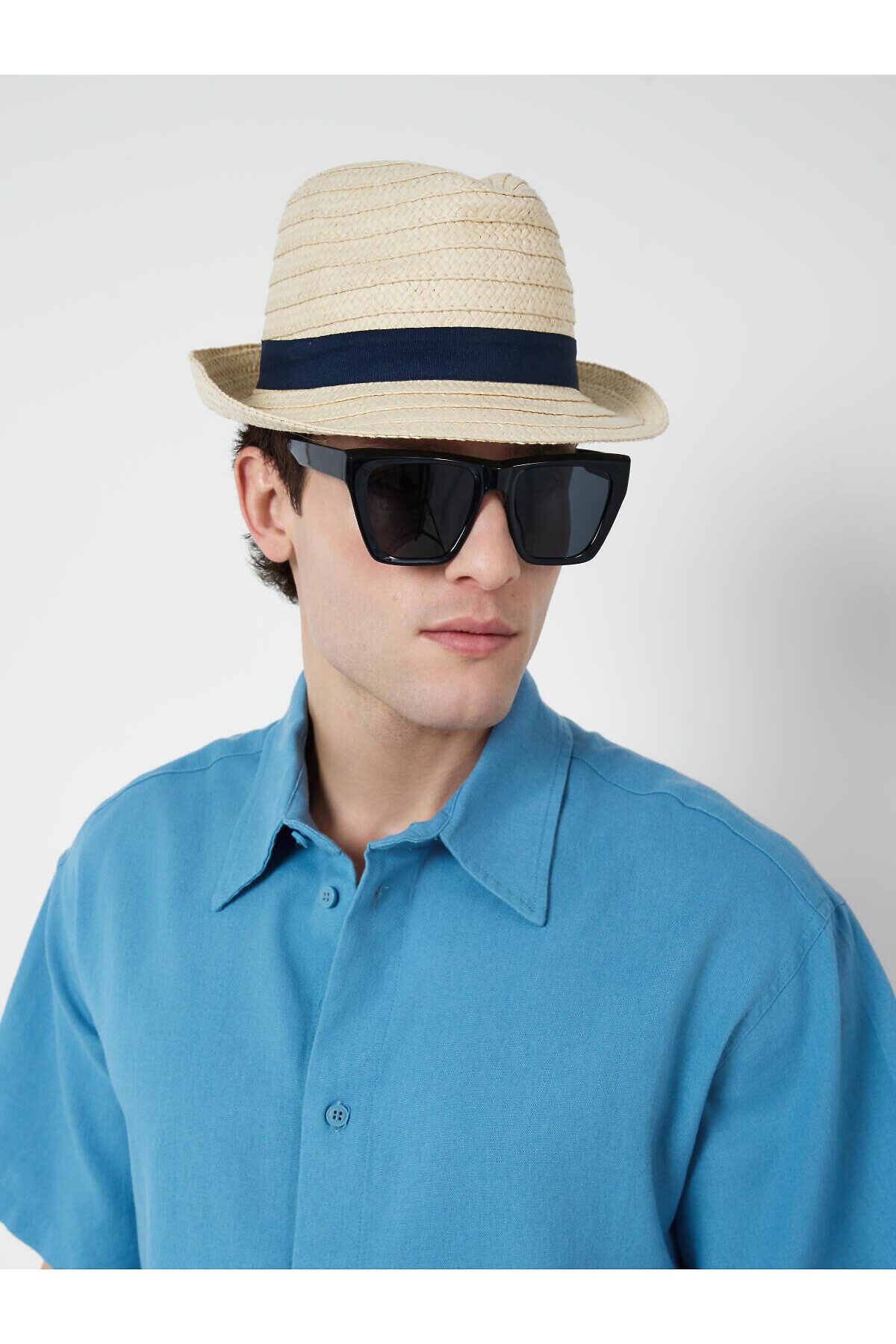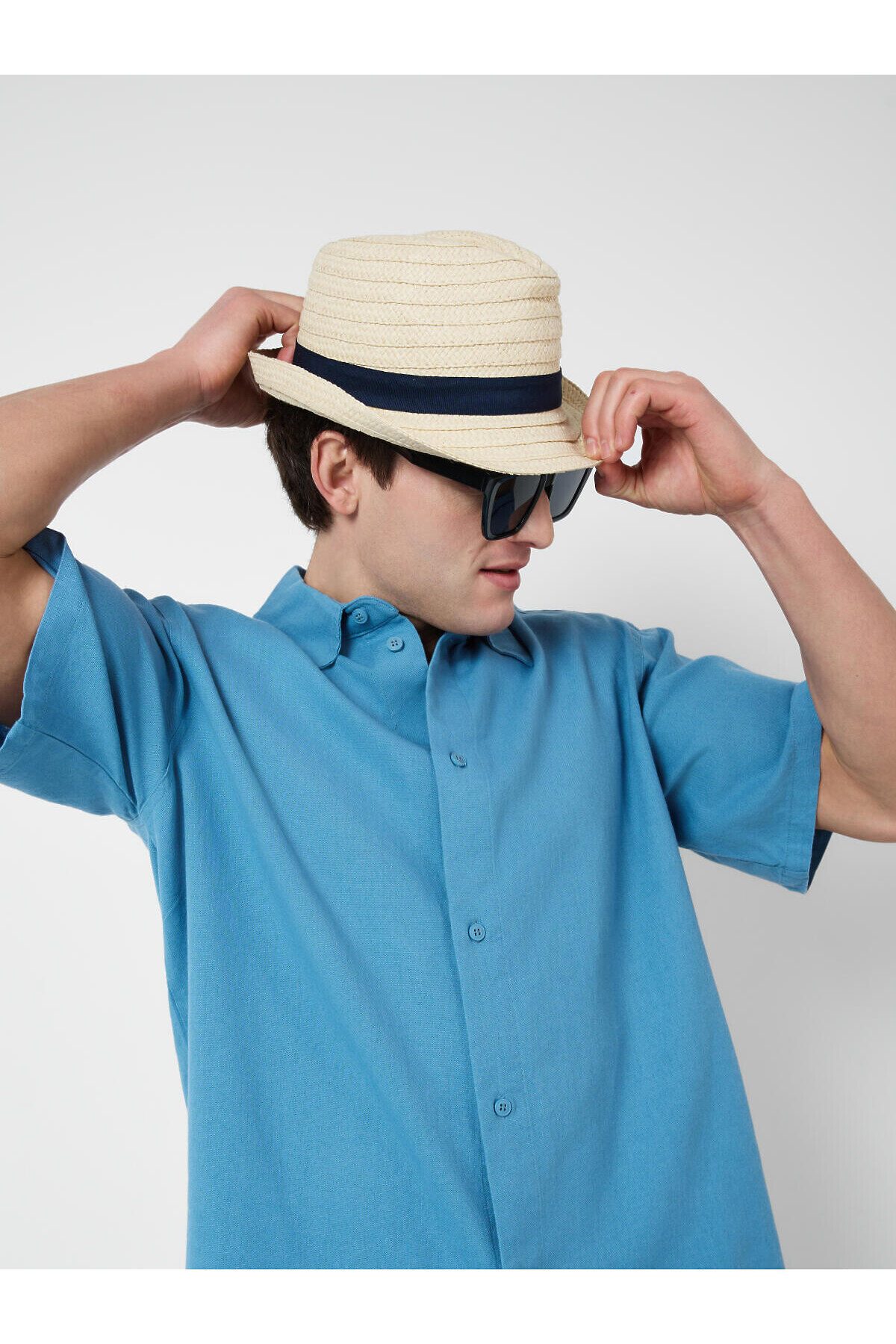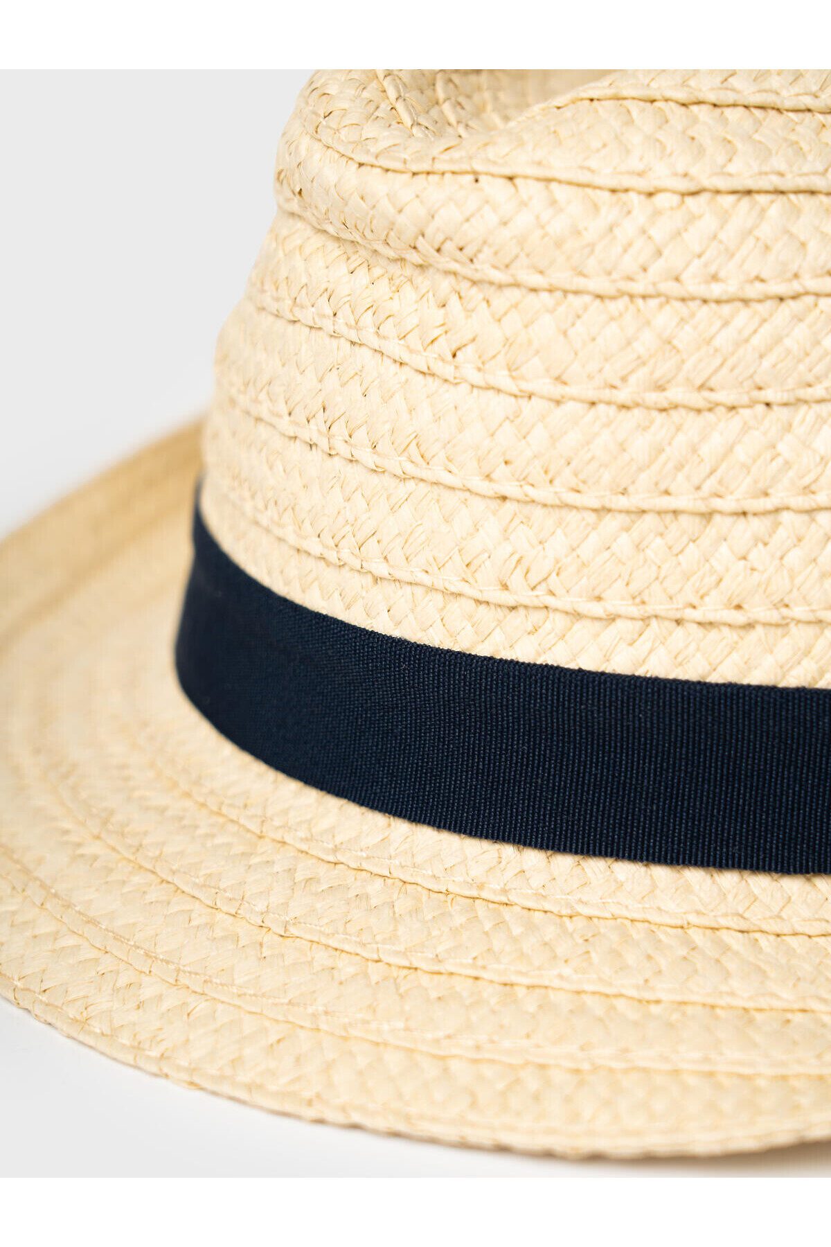Мужская соломенная шляпа. Модель классической формы, выполнена из натурального плетёного материала. В качестве декора пришита тёмно-синяя лента, придающая изделию аккуратный и стильный вид.