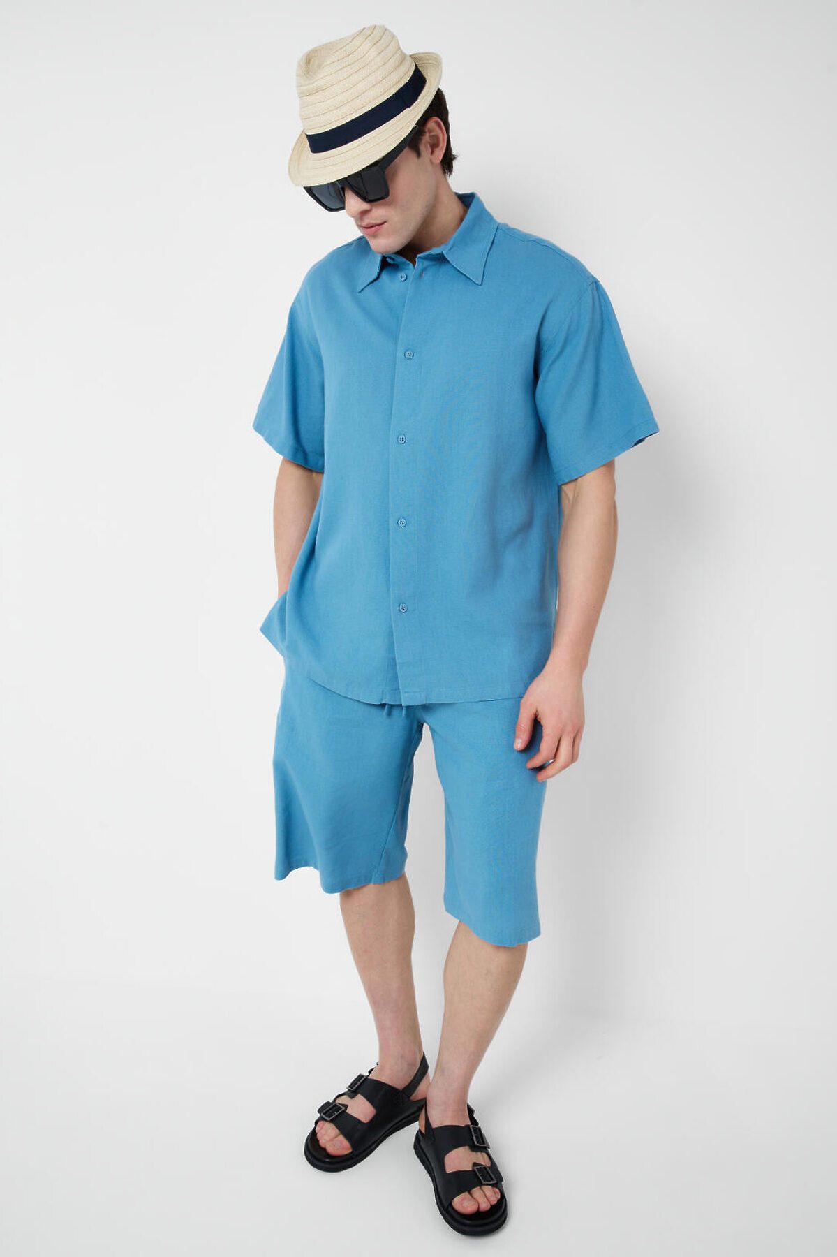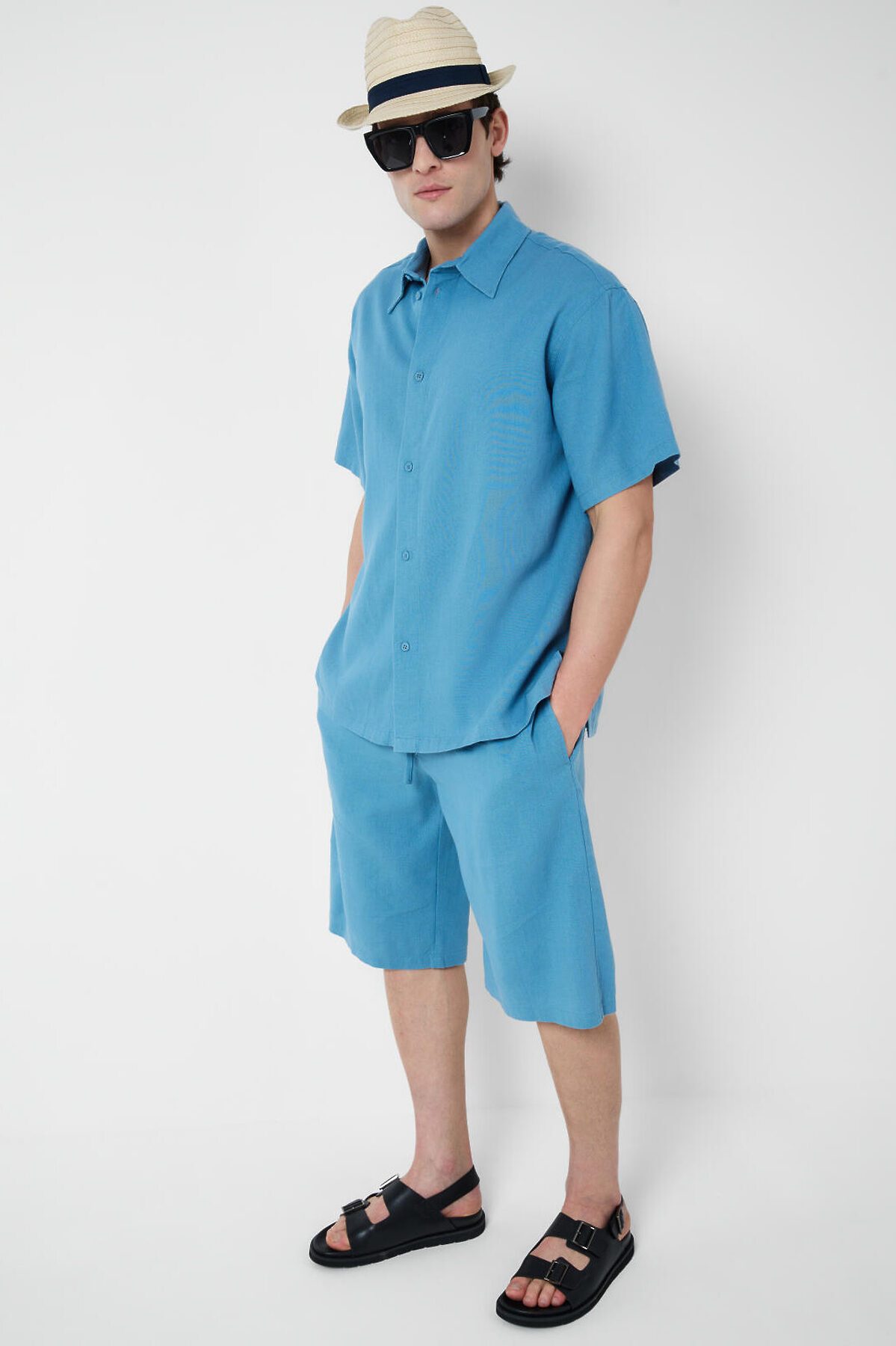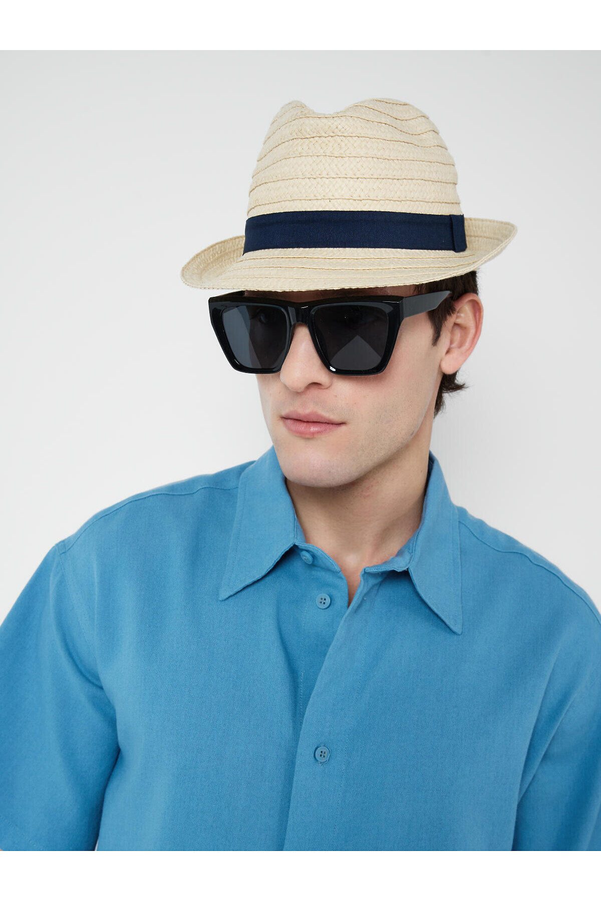 Мужская соломенная шляпа. Модель классической формы, выполнена из натурального плетёного материала. В качестве декора пришита тёмно-синяя лента, придающая изделию аккуратный и стильный вид.