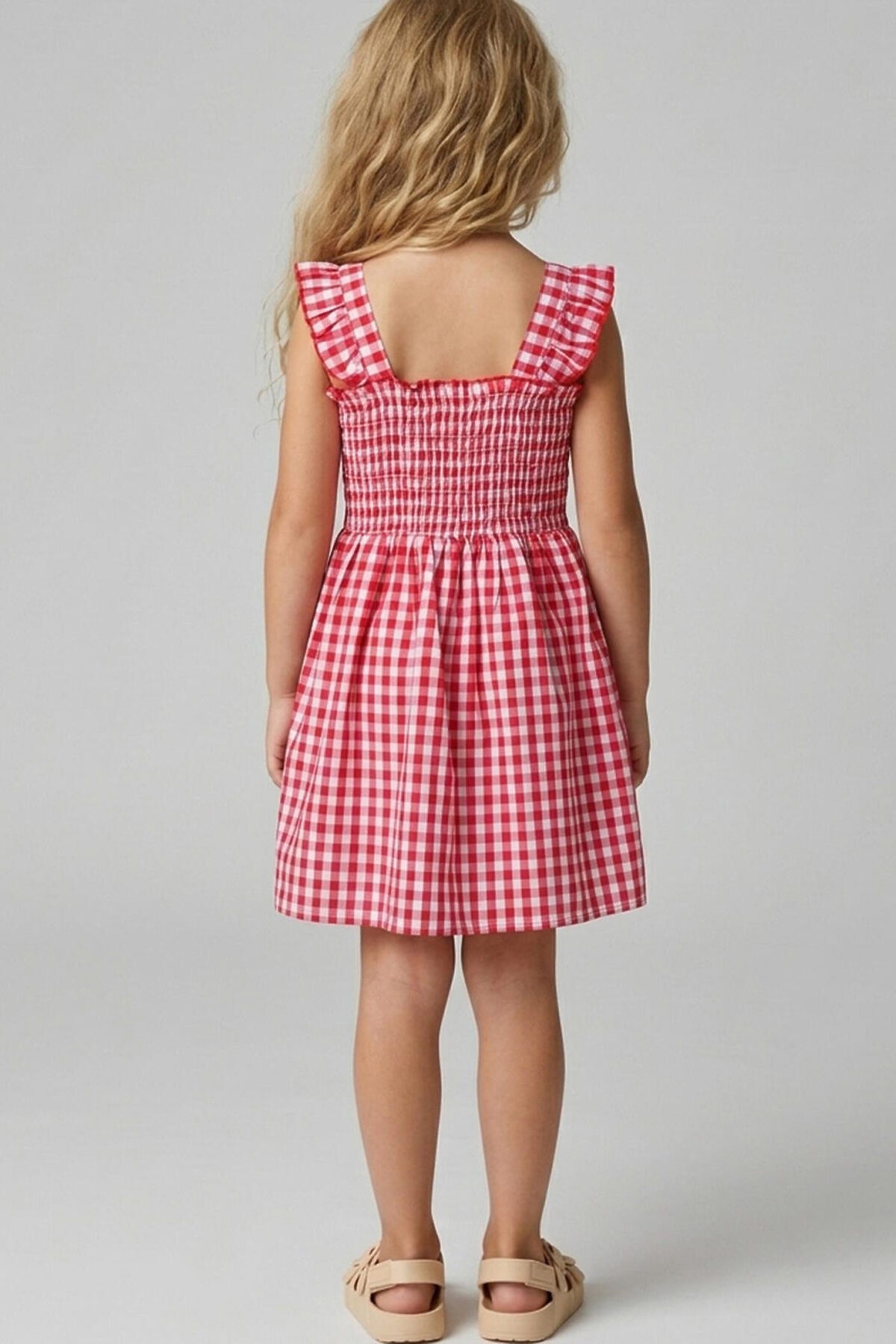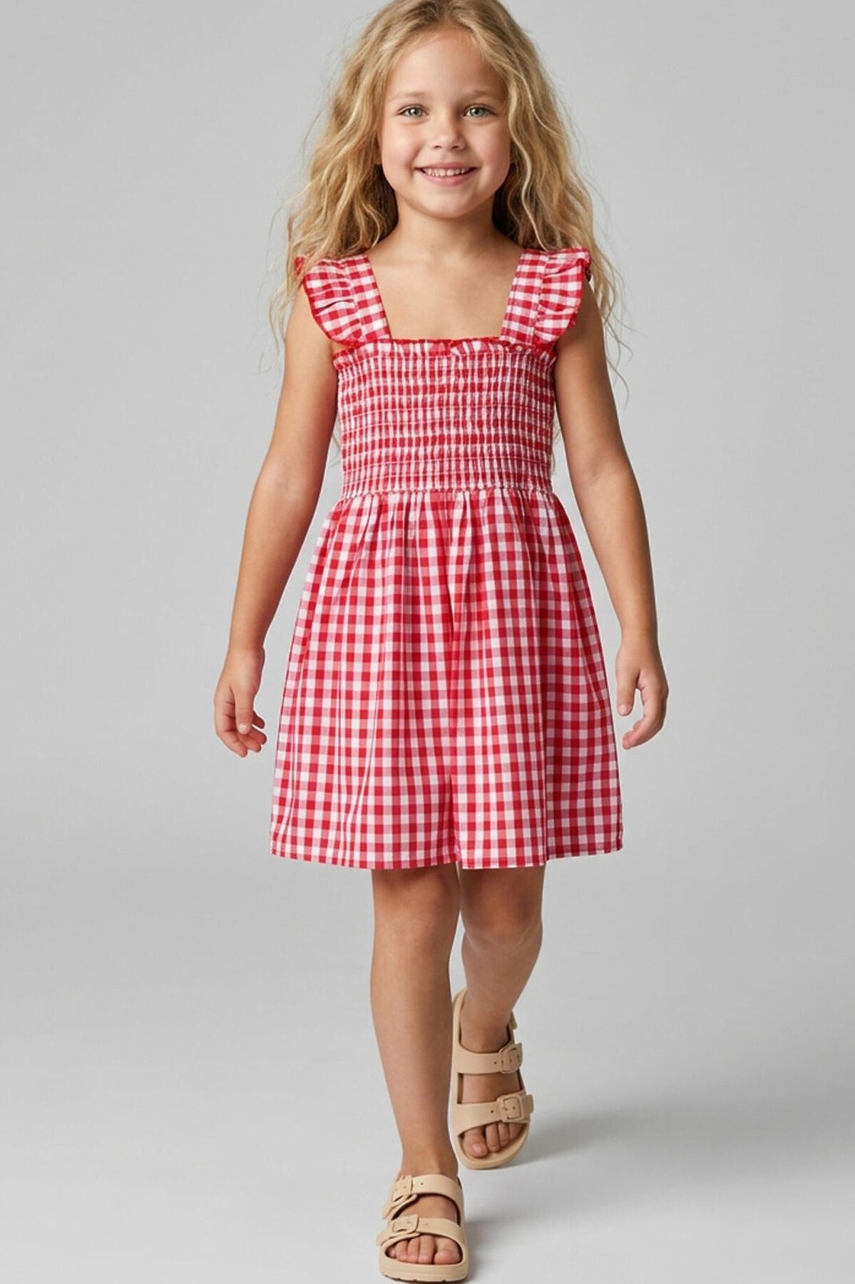 Детский летний сарафан на широких бретелях для девочки. Выполнен из хлопковой ткани поплин. Верх изделия собран на эластичную резинку, благодаря чему он плотно прилегает к телу и хорошо держится. Бретели украшены небольшими рюшами, которые придают образу нарядность. По линии груди — декоративная рюша. Юбка мягко присборена и расширяется к низу. Край подола фигурный, с плавными волнами. Модель длиной до колена.