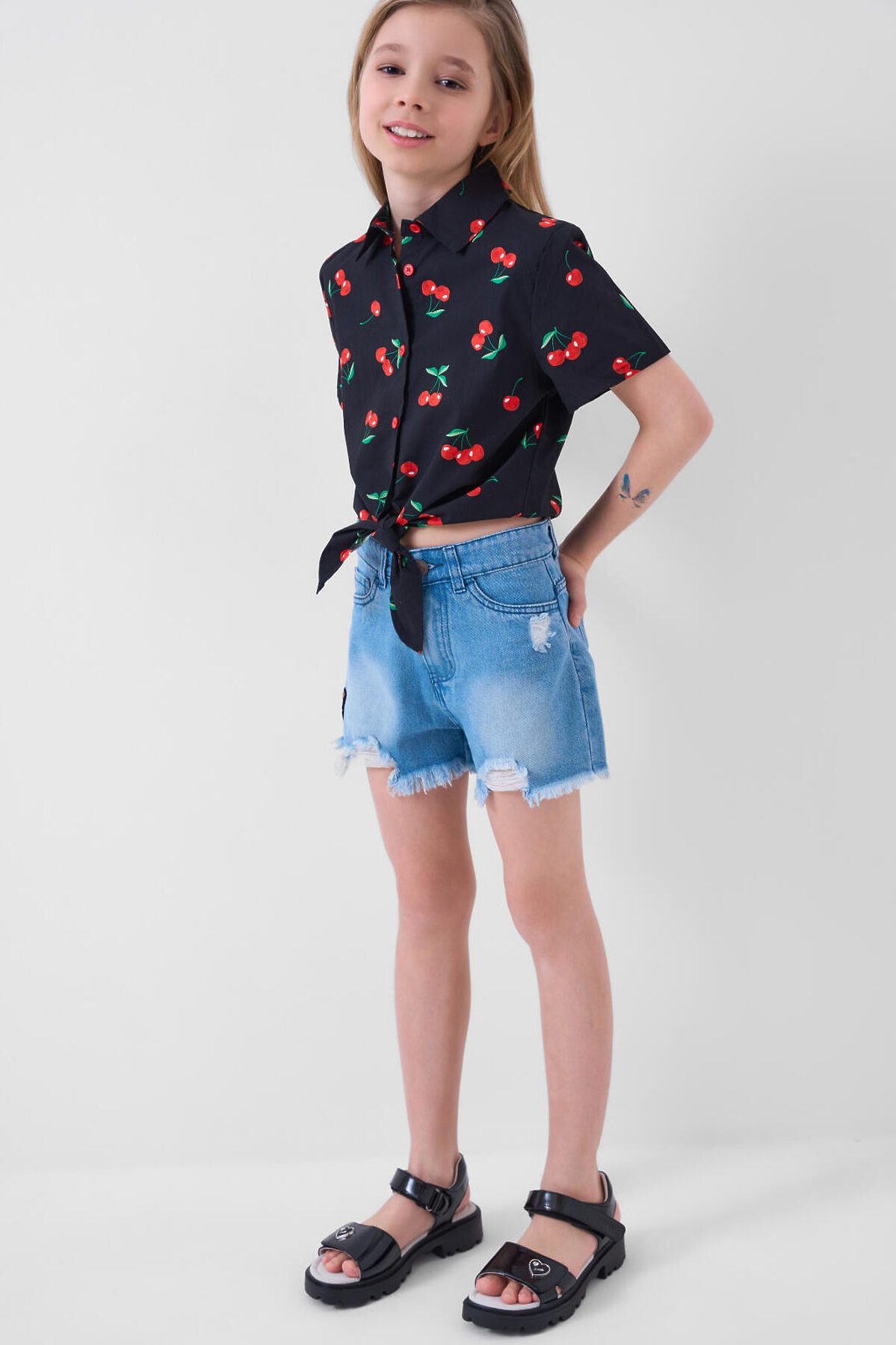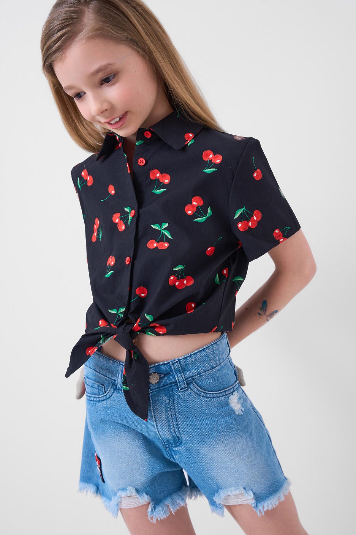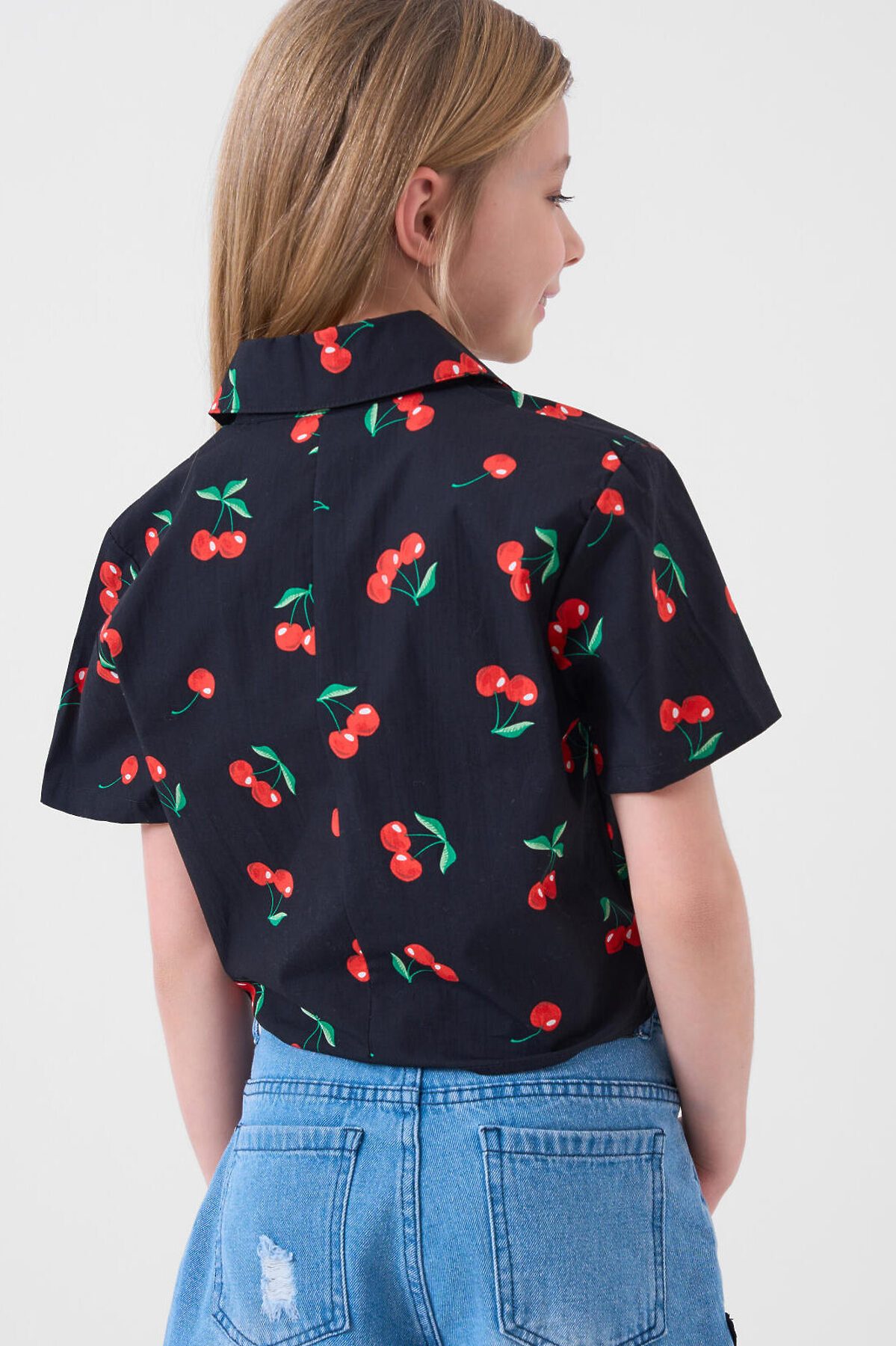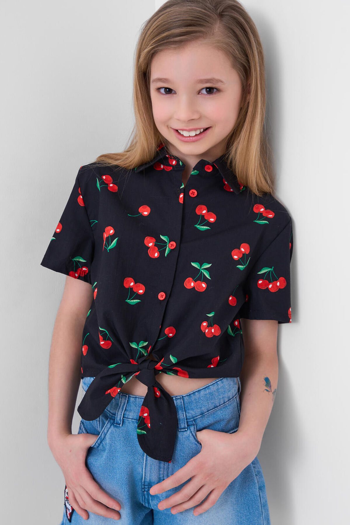 Легкая укороченная рубашка для девочки подростка. Выполнена из хлопковой ткани поплин. Укороченный фасон с короткими рукавами и завязками спереди создает стильный образ. Милый принт с вишнями. Рубашка застегивается на пуговицы и имеет классический воротник. Завязки на талии позволяют регулировать посадку.