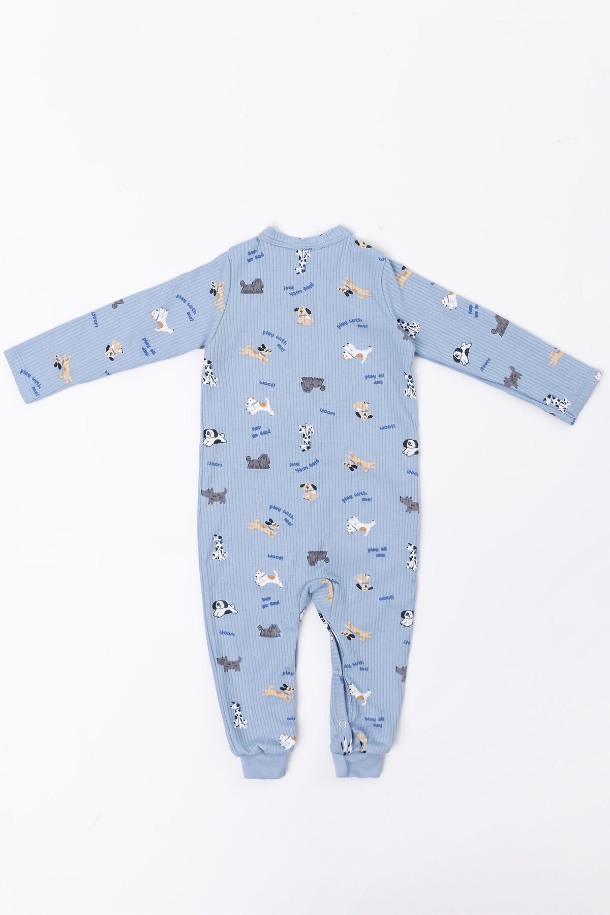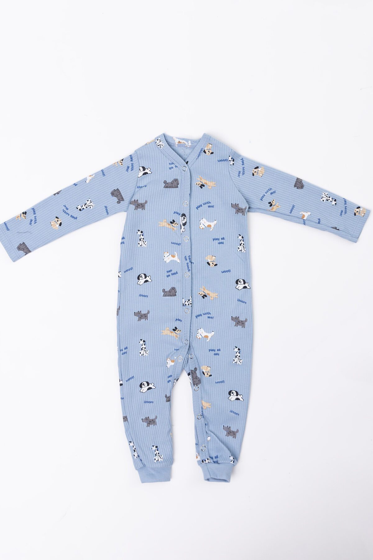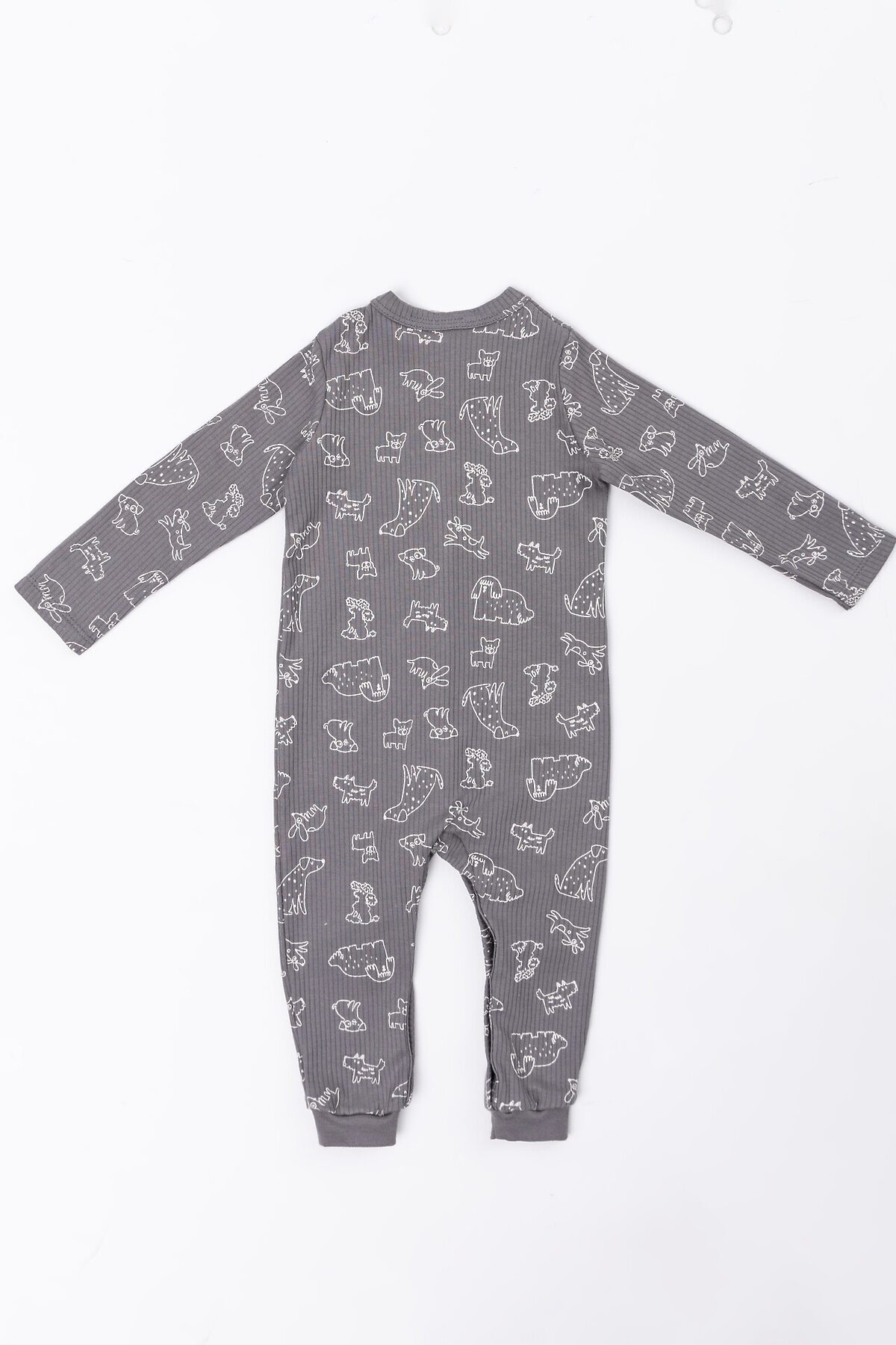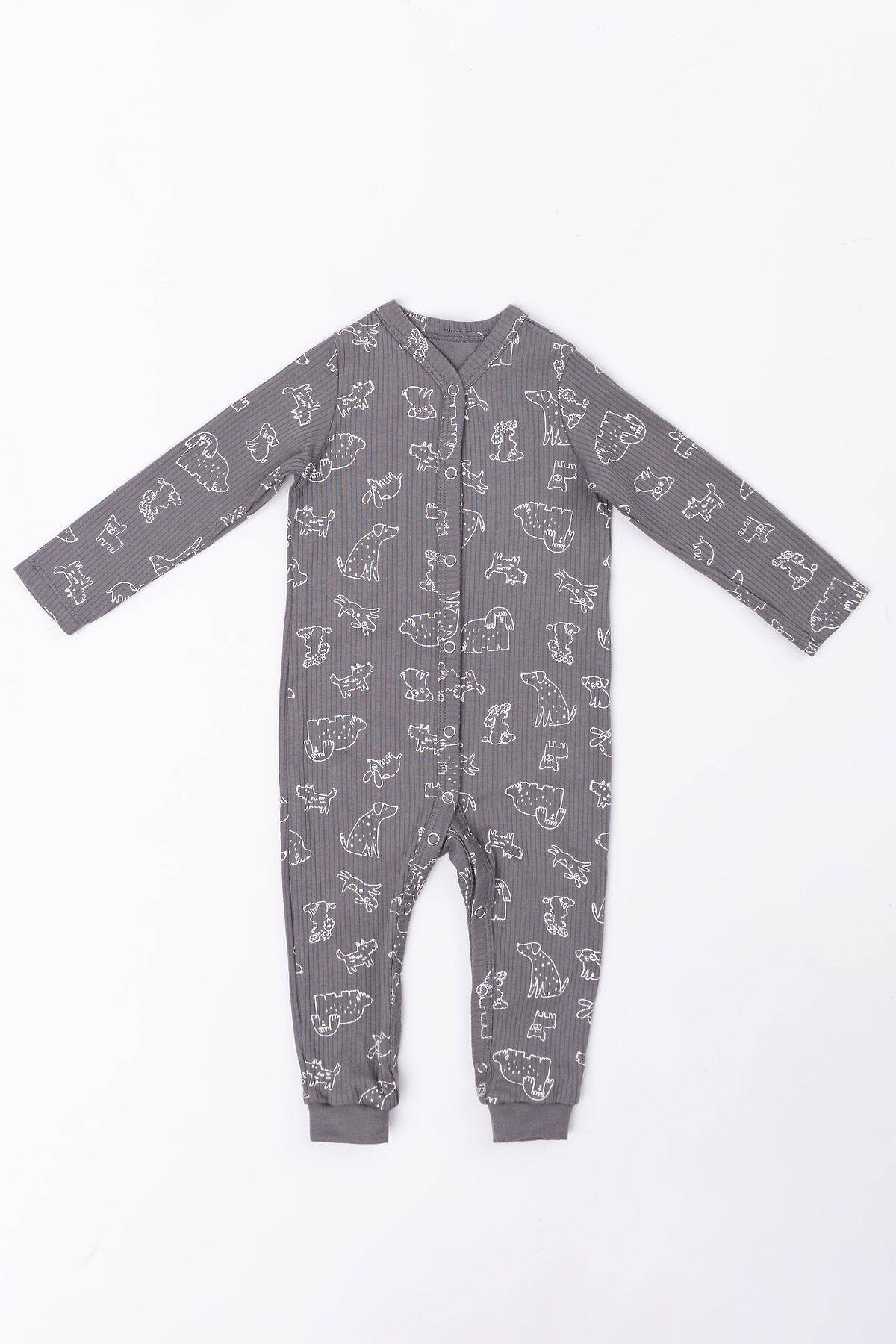 Модель имеет спинку без швов, что делает её поверхность гладкой и удобной. Передняя часть застёгивается по всей длине и на обеих ножках на кнопки, что делает переодевание быстрым и простым. Длинные рукава и низ штанин аккуратно обработаны, а края горловины и застёжки отделаны дополнительными деталями из основной ткани для мягкости и прочности. Эластичные манжеты на ножках помогают комбинезону сохранять форму.
