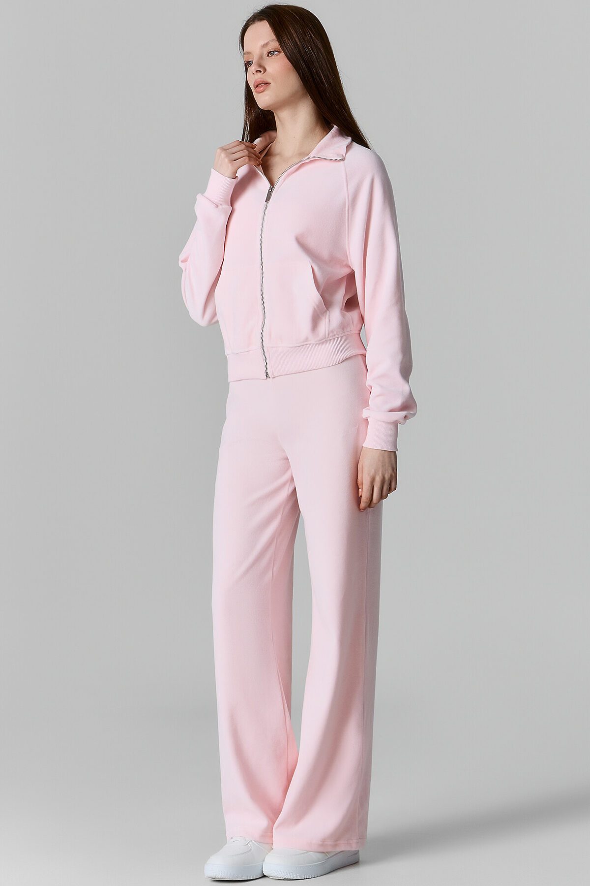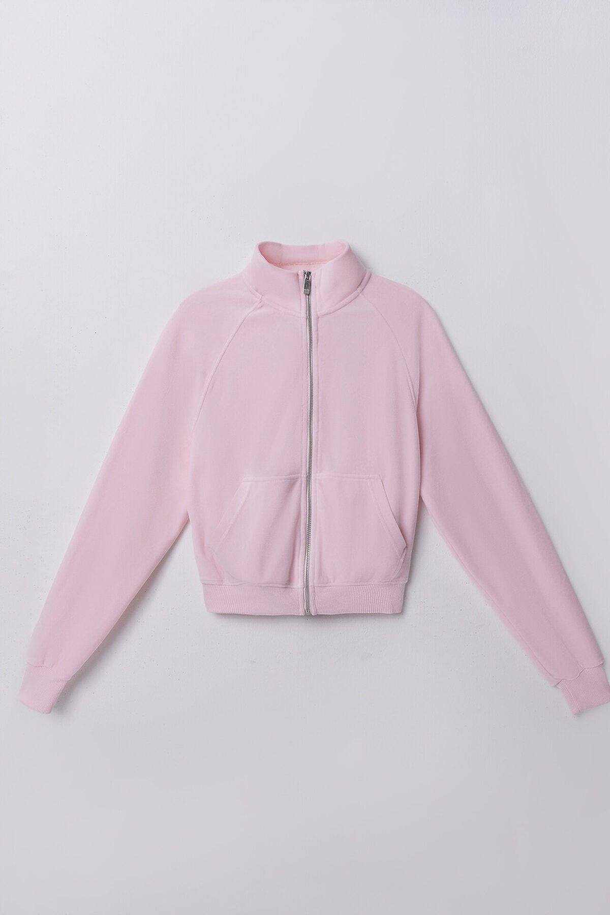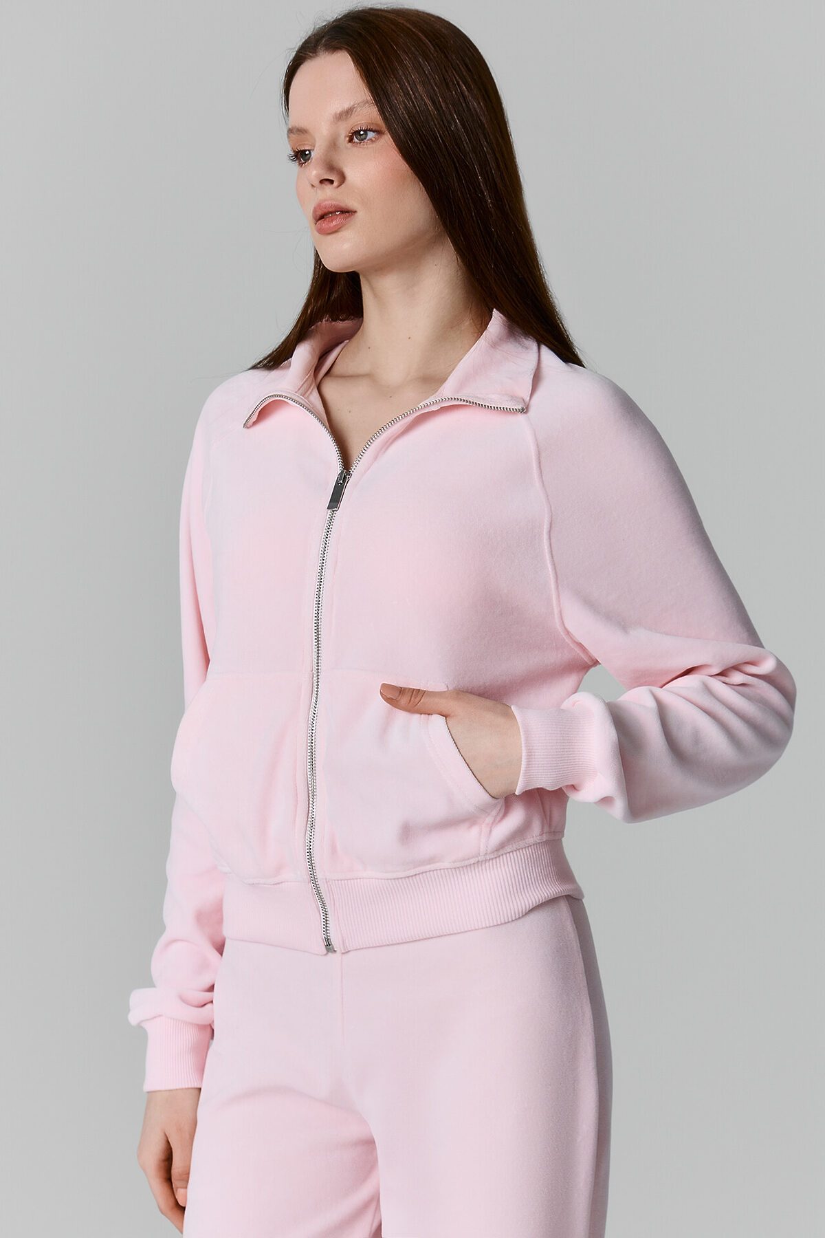Толстовка женская свободного силуэта из трикотажного полотна махровое. Горловина из основного полотна обработана воротником-стойкой. Воротник и замок обработаны хб тесьмой 10мм. Рукава реглан, длинные. Низ рукавов обработан манжетой из рибаны, по низу изделия притачной пояс из рибаны. По переду центральная застежка на металлическую молнию (OpenEnd, StandartMetal №5, 5,9mm) и накладные карманы.