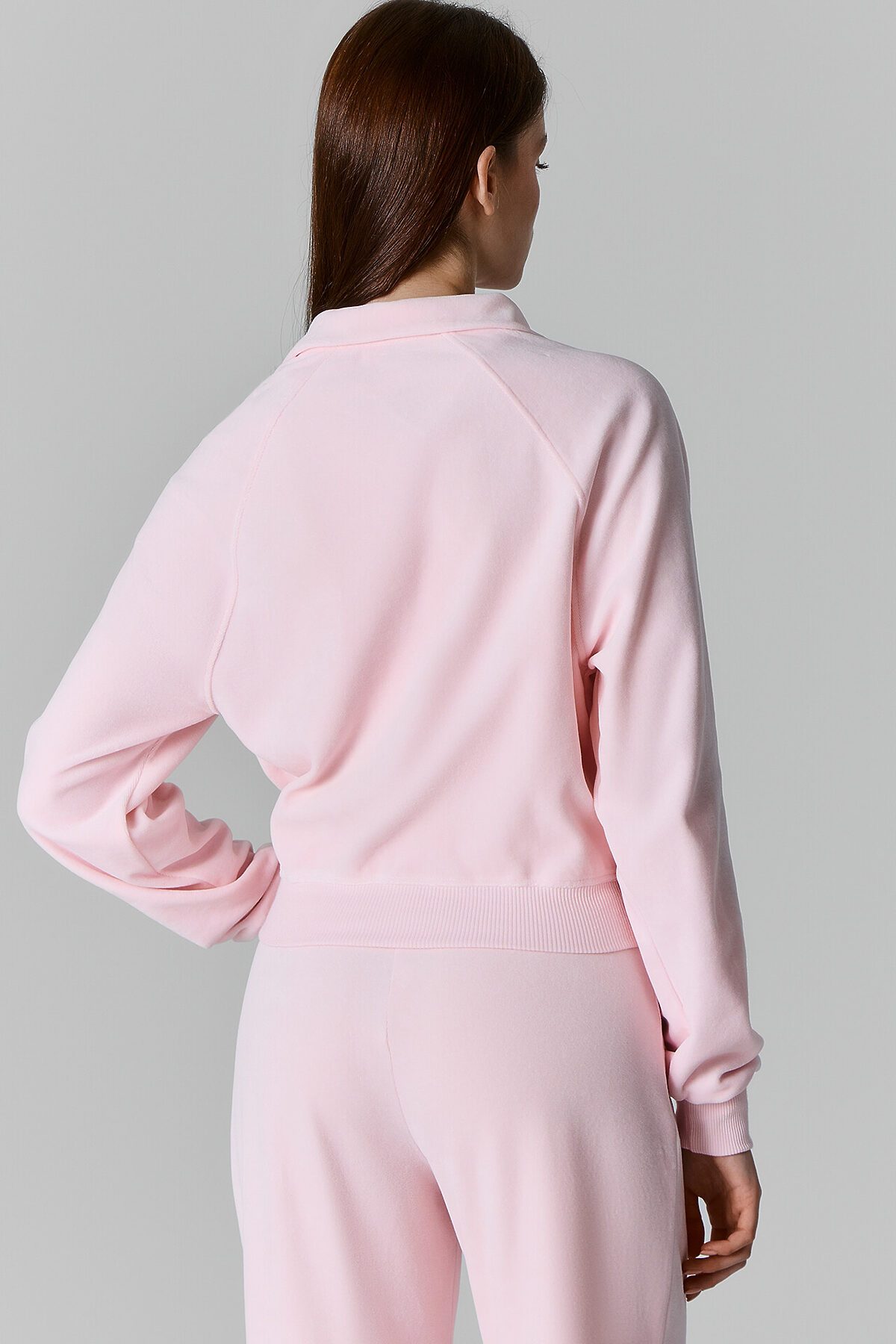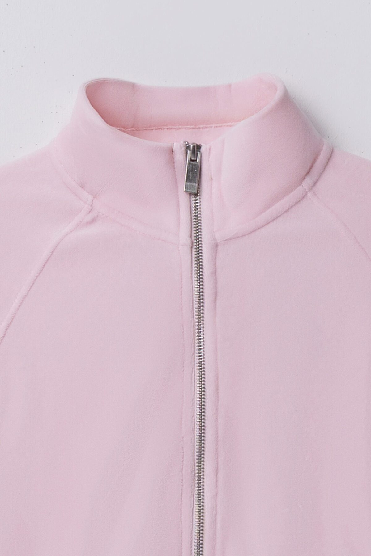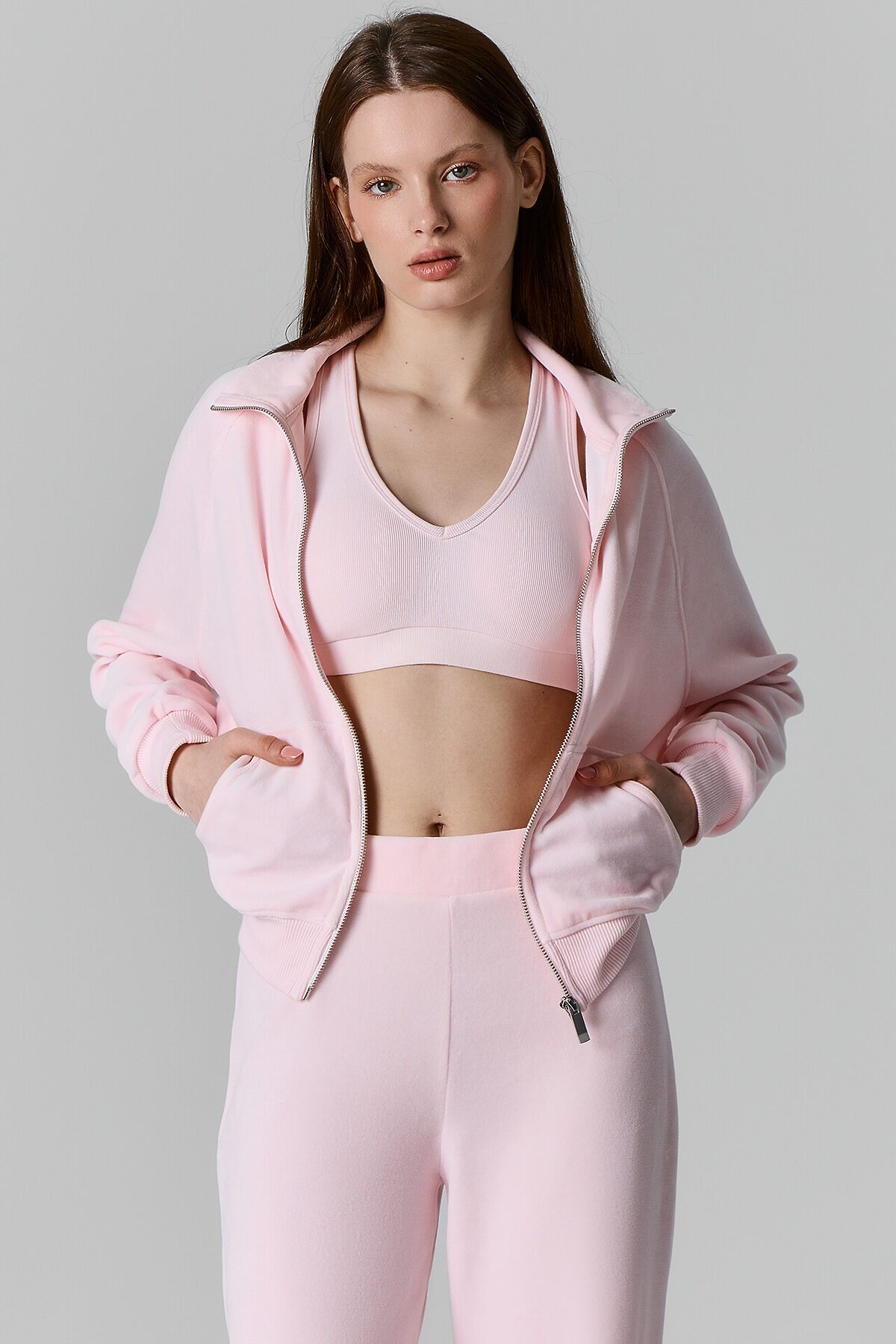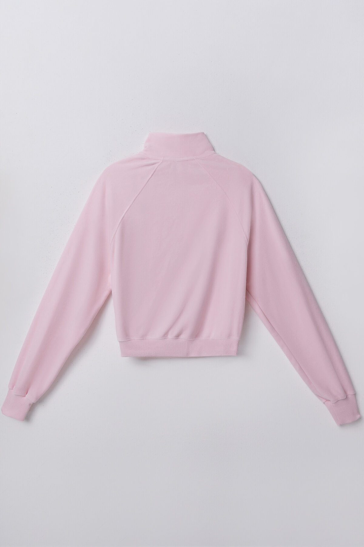 Толстовка женская свободного силуэта из трикотажного полотна махровое. Горловина из основного полотна обработана воротником-стойкой. Воротник и замок обработаны хб тесьмой 10мм. Рукава реглан, длинные. Низ рукавов обработан манжетой из рибаны, по низу изделия притачной пояс из рибаны. По переду центральная застежка на металлическую молнию (OpenEnd, StandartMetal №5, 5,9mm) и накладные карманы.