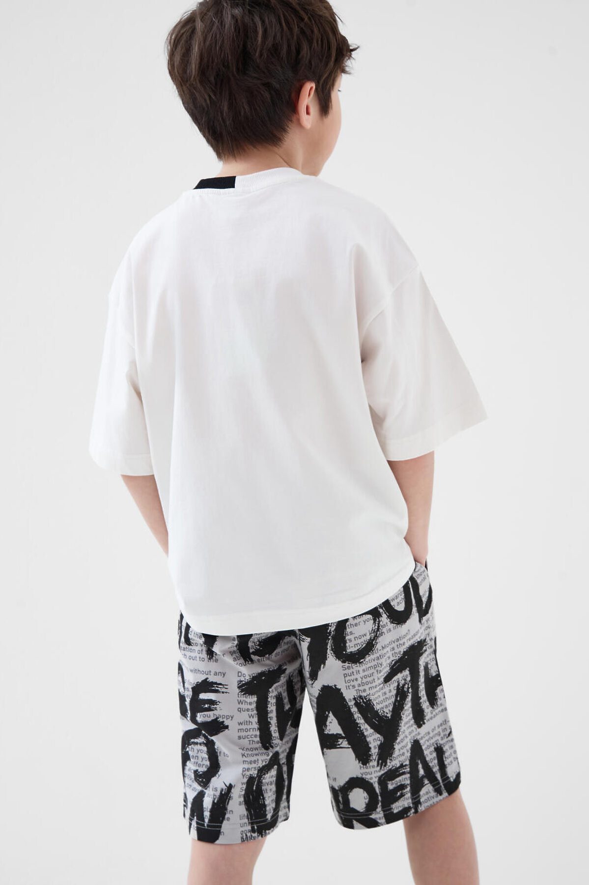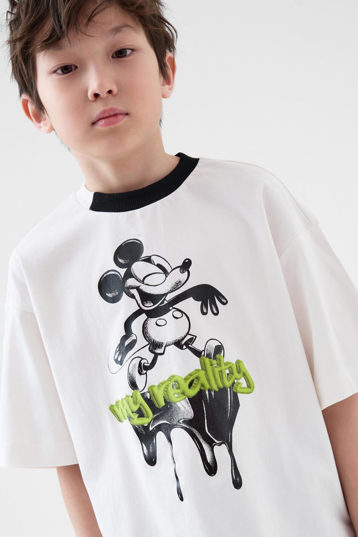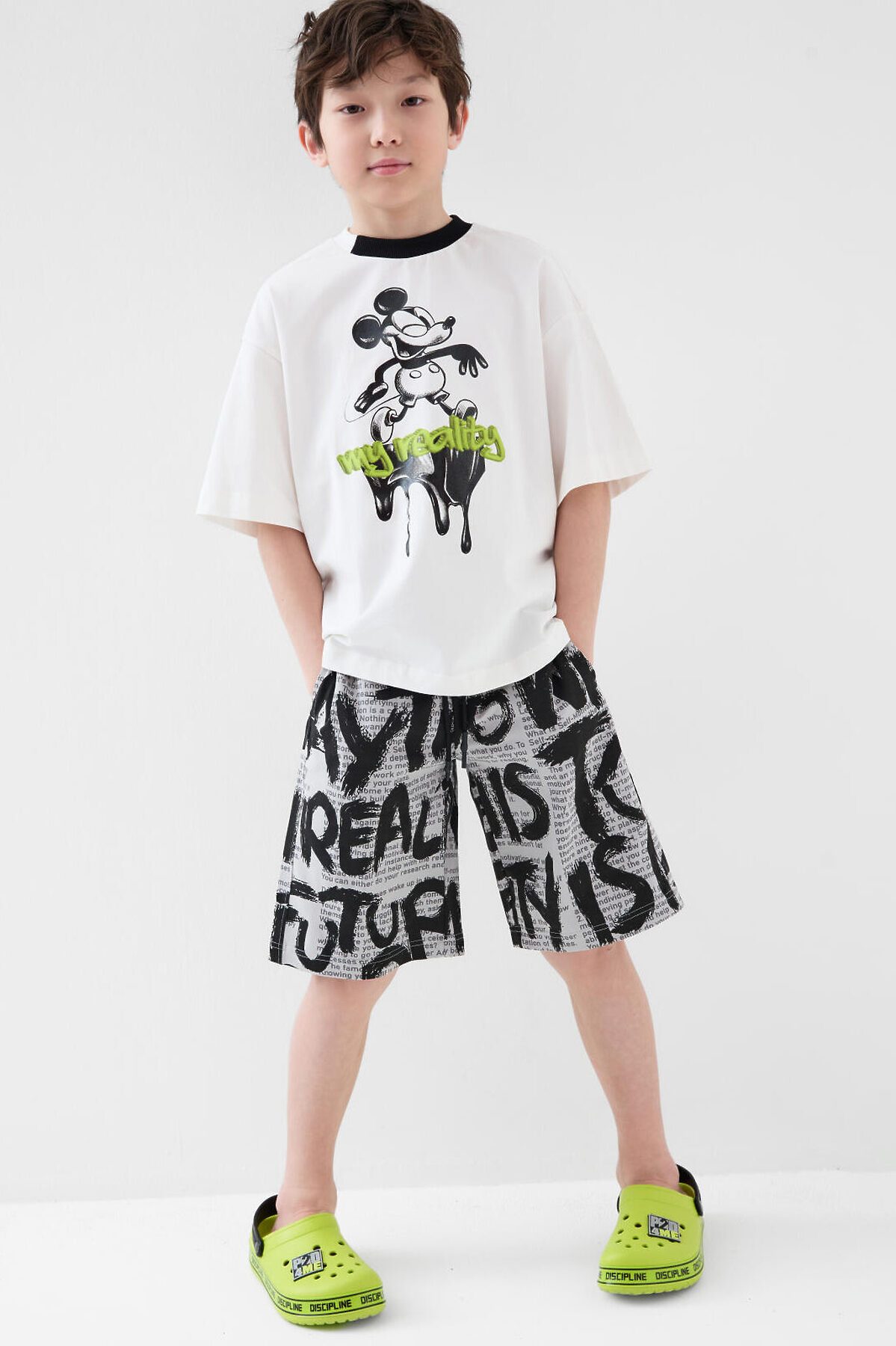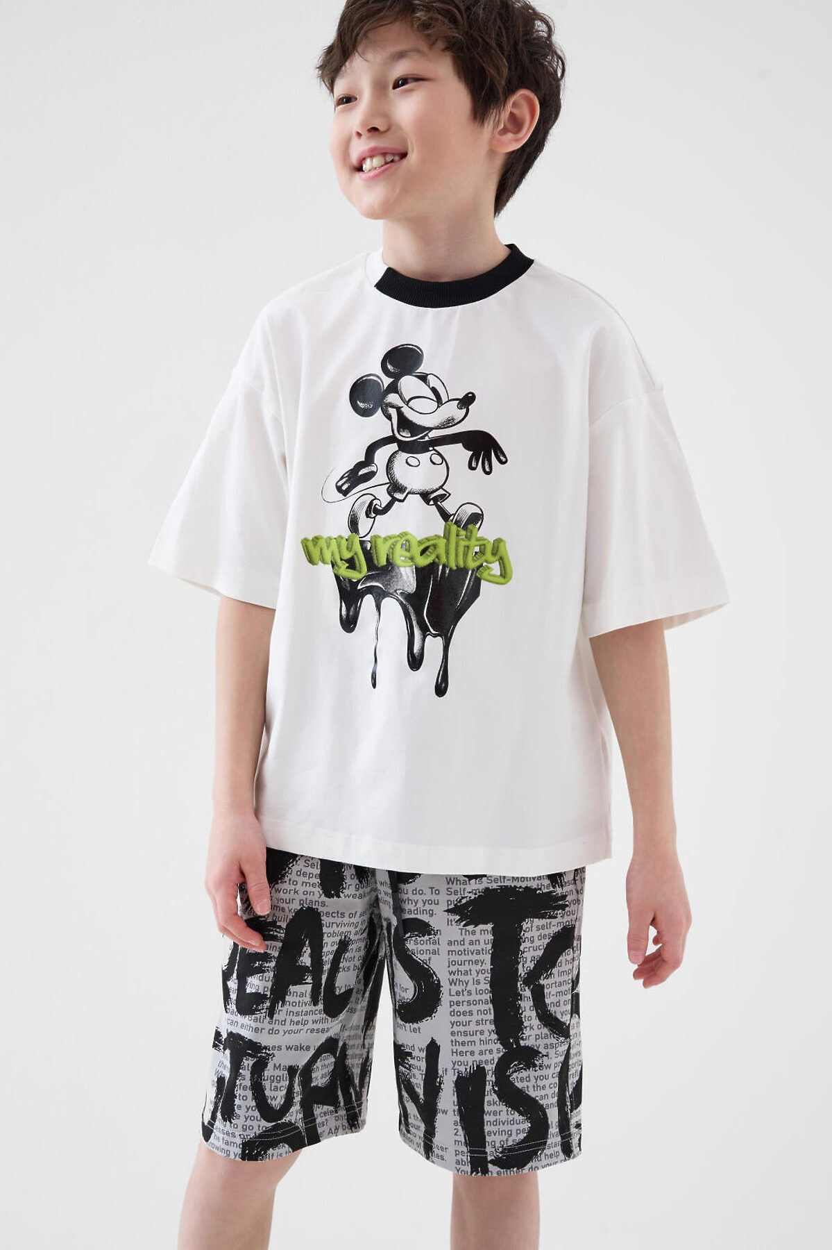 Костюм для мальчика подростка. Состоит из футболки и шорт. Выполнен из хлопкового трикотажа. Футболка оверсайз, с коротким рукавом. Красочный принт с Микки Маусом. Шорты свободные, с эластичным поясом и шнурком для регулировки посадки. По бокам расположены карманы.