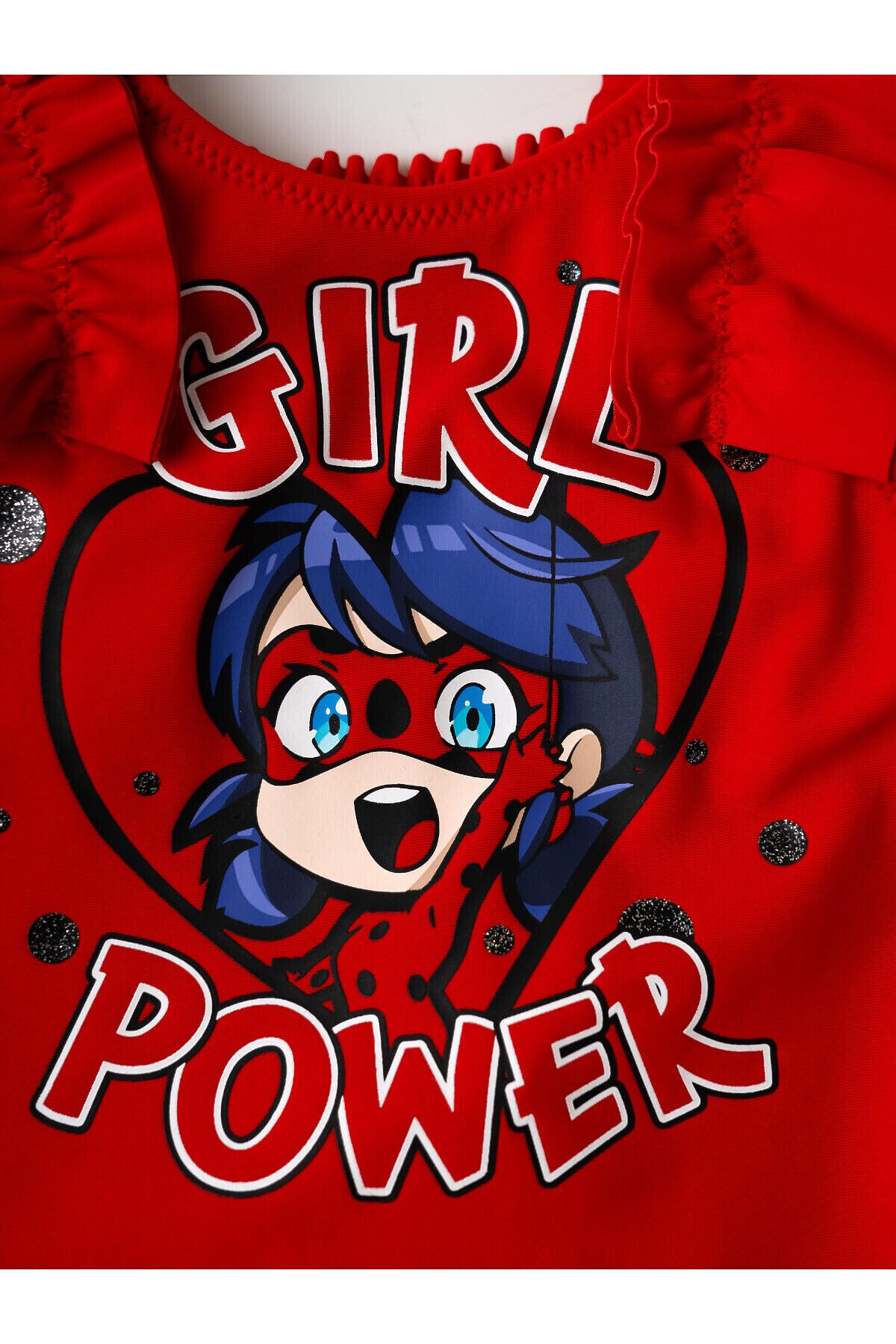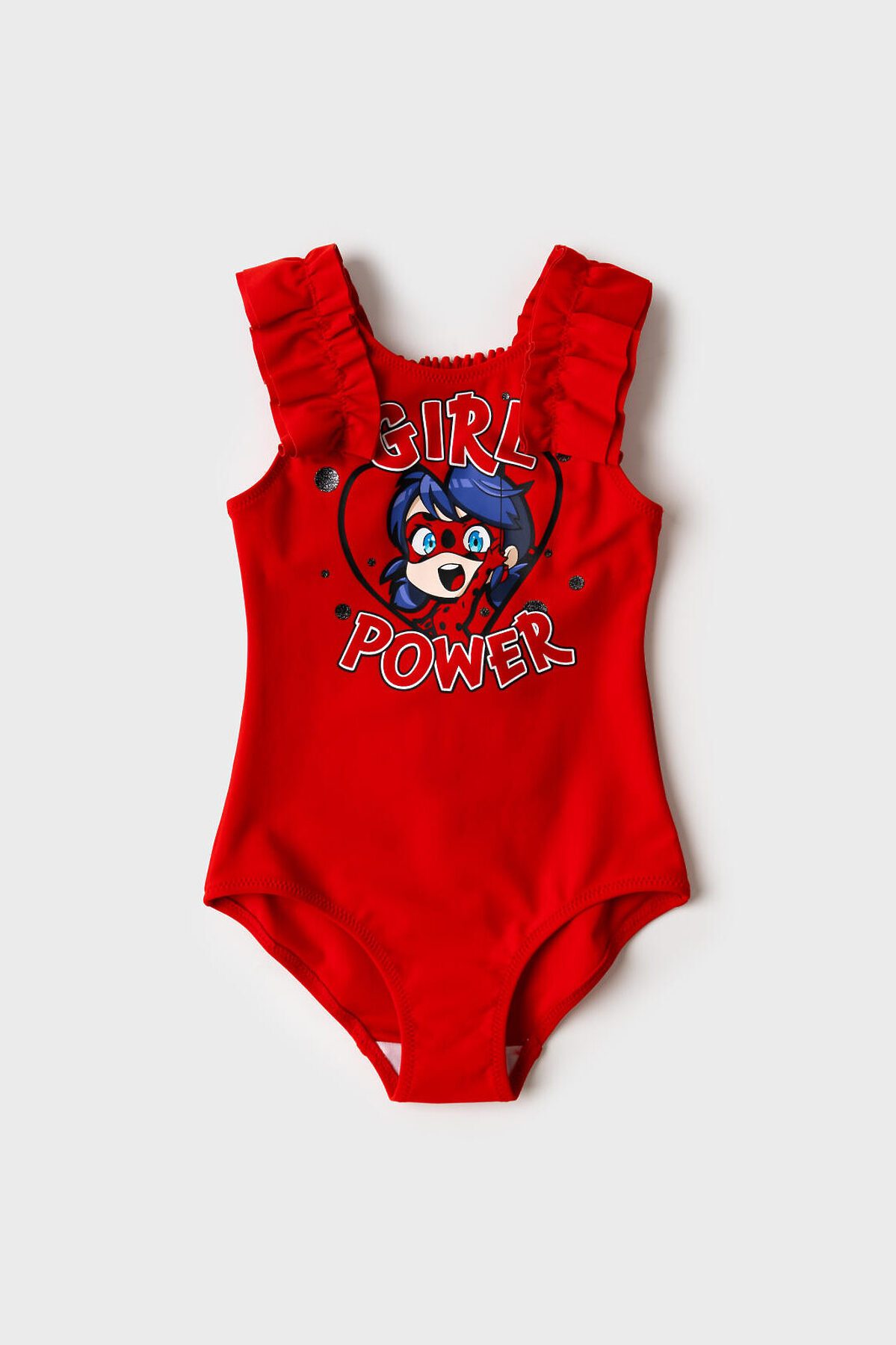 Детский слитный купальник для девочки. Модель с открытой спинкой и милыми пышными оборками на плечах. Спереди расположен принт с героиней из популярного мультфильма Леди Баг. Сзади — декоративная резинка с ажурным узором. Внутри - подкладка. Все края обработаны эластичной тесьмой, чтобы изделие хорошо сидело на теле и не натирало. Благодаря UF-защите, ткань сохраняет первоначальный вид даже при длительном пребывании на солнце. Подходит для плавания и активного отдыха.