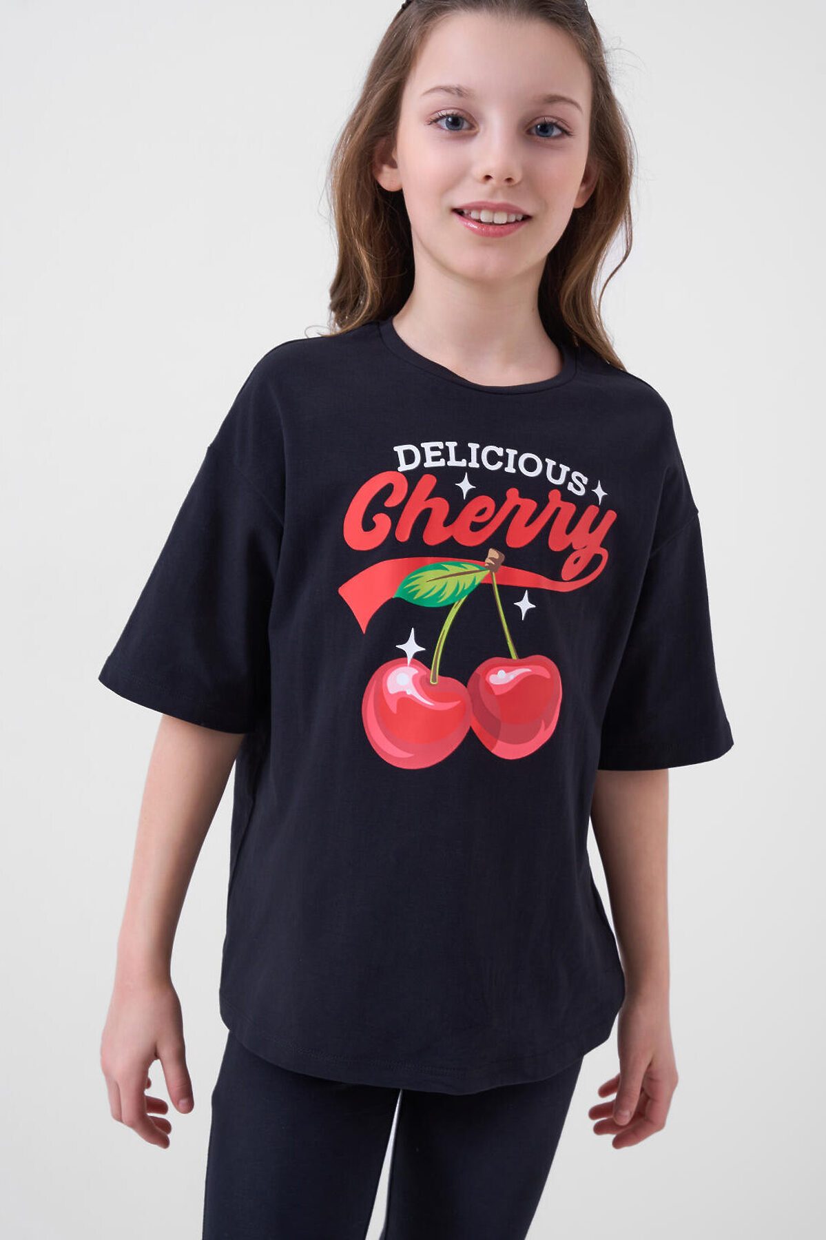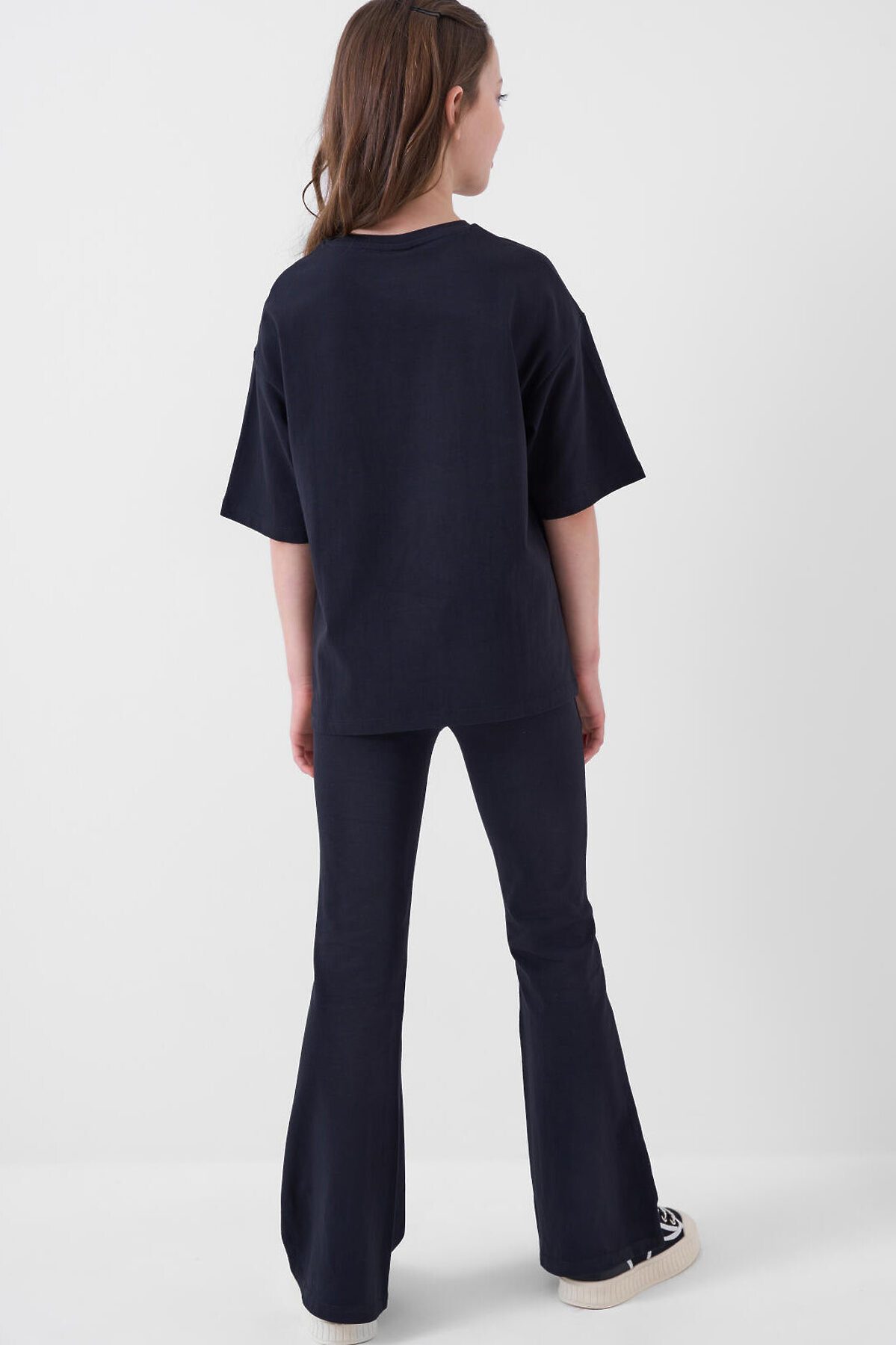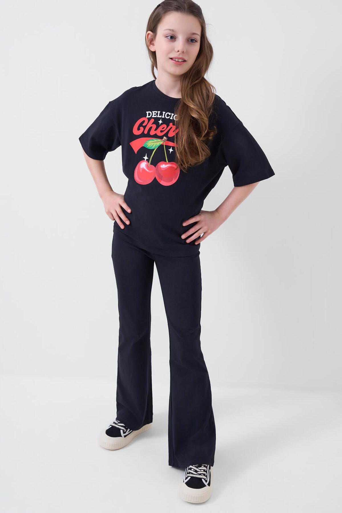 Комплект для девочки подростка. Состоит из футболки оверсайз и брюк клеш на резинке. Выполнен из хлопкового трикотажа. Футболка свободного силуэта, с короткими рукавами. Украшена крупным красочным принтом. Брюки — расклешенные, с высокой посадкой и эластичным поясом.