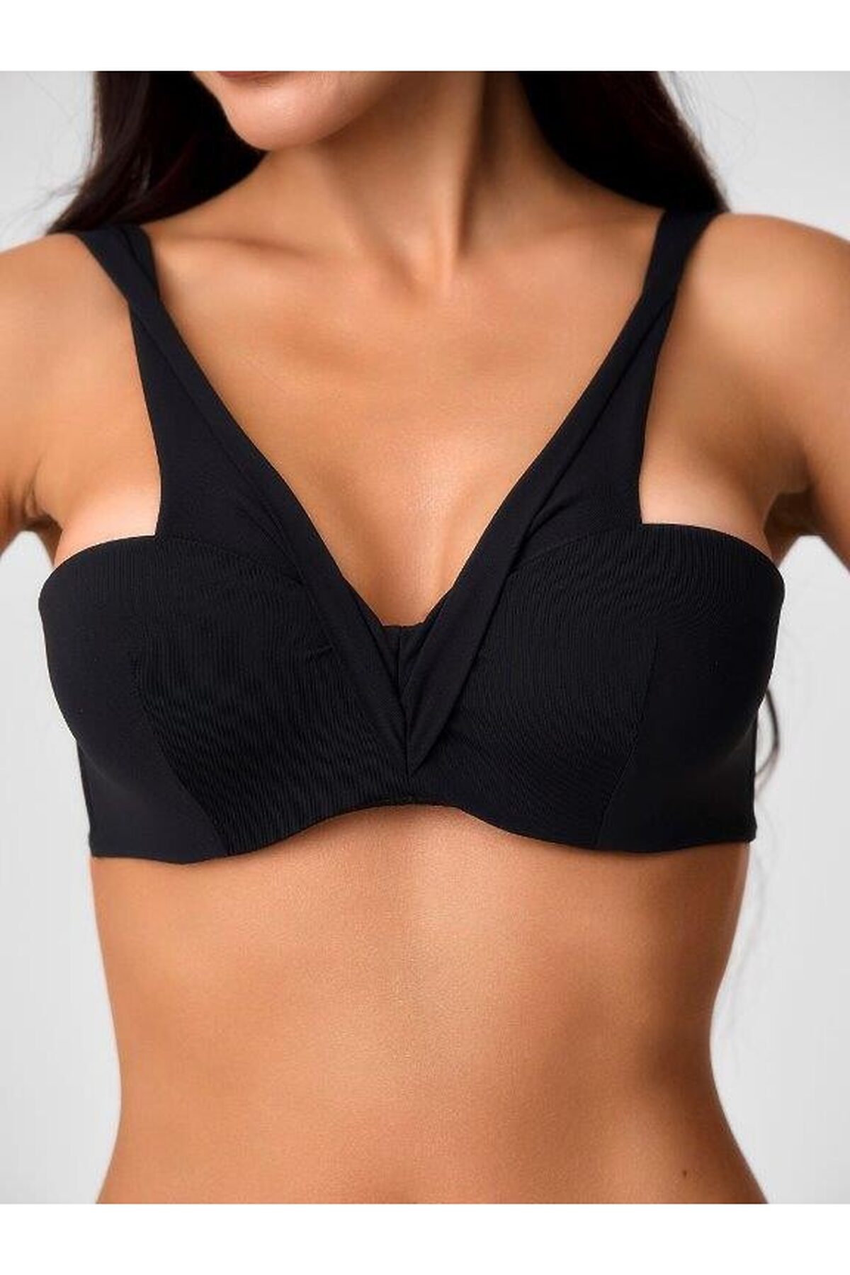 Раздельный купальник с чашокой bandeau bra из эластичного полотна с формованной чашкой с push - up в размерах 70ABС, 75ABС, 80B, без push-up в размерах 75DE, 80CDE, 85BCD. Лиф на каркасах с боковыми корсетными вставками.Пластиковая застежка. Широкие декоративные бретели, нерегулируемые и несъемные.Плавки на подкладе с завышенной талией. Тонкие резинки, подгиб и плоский шов по талии и срезу ног.