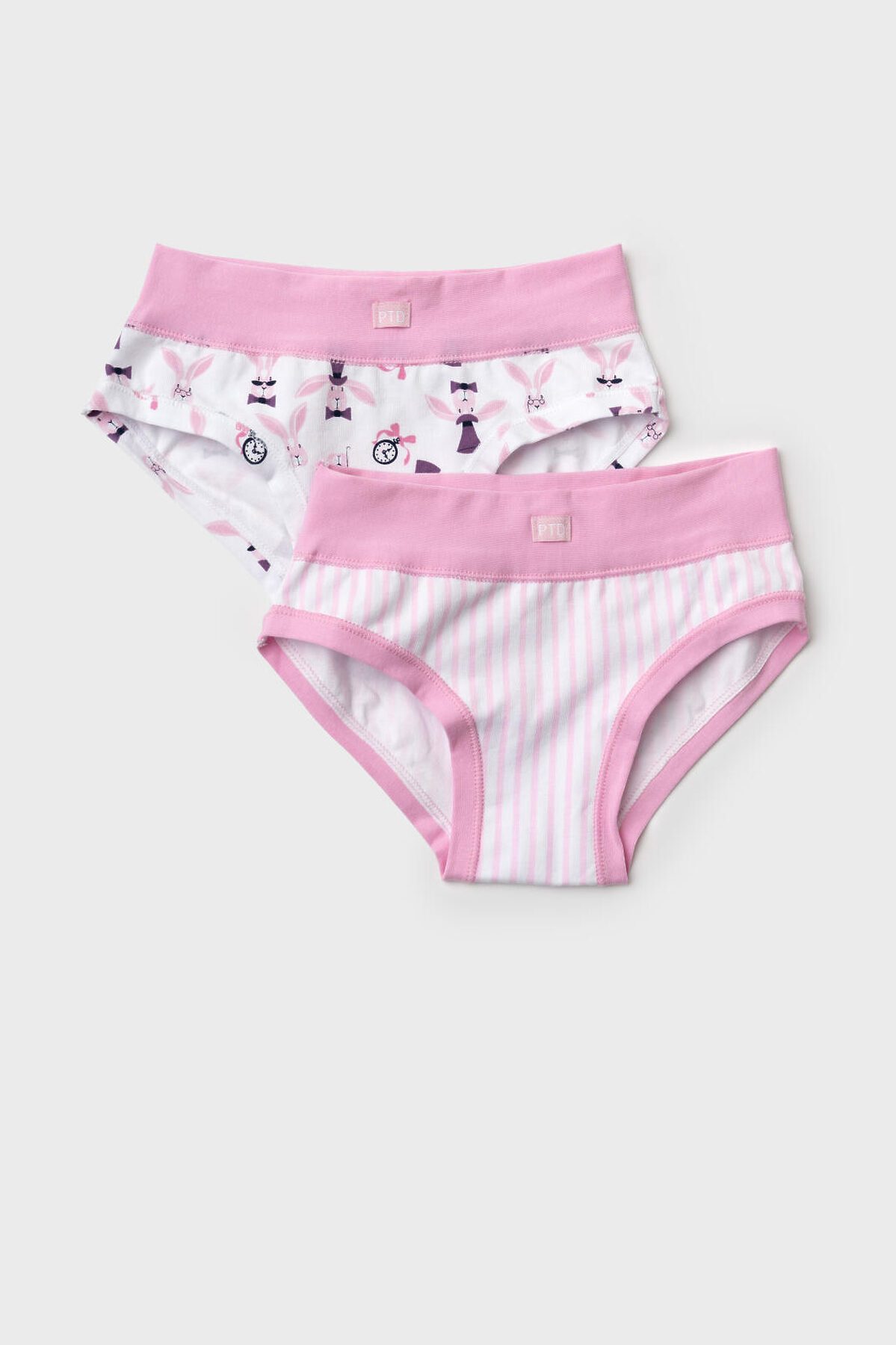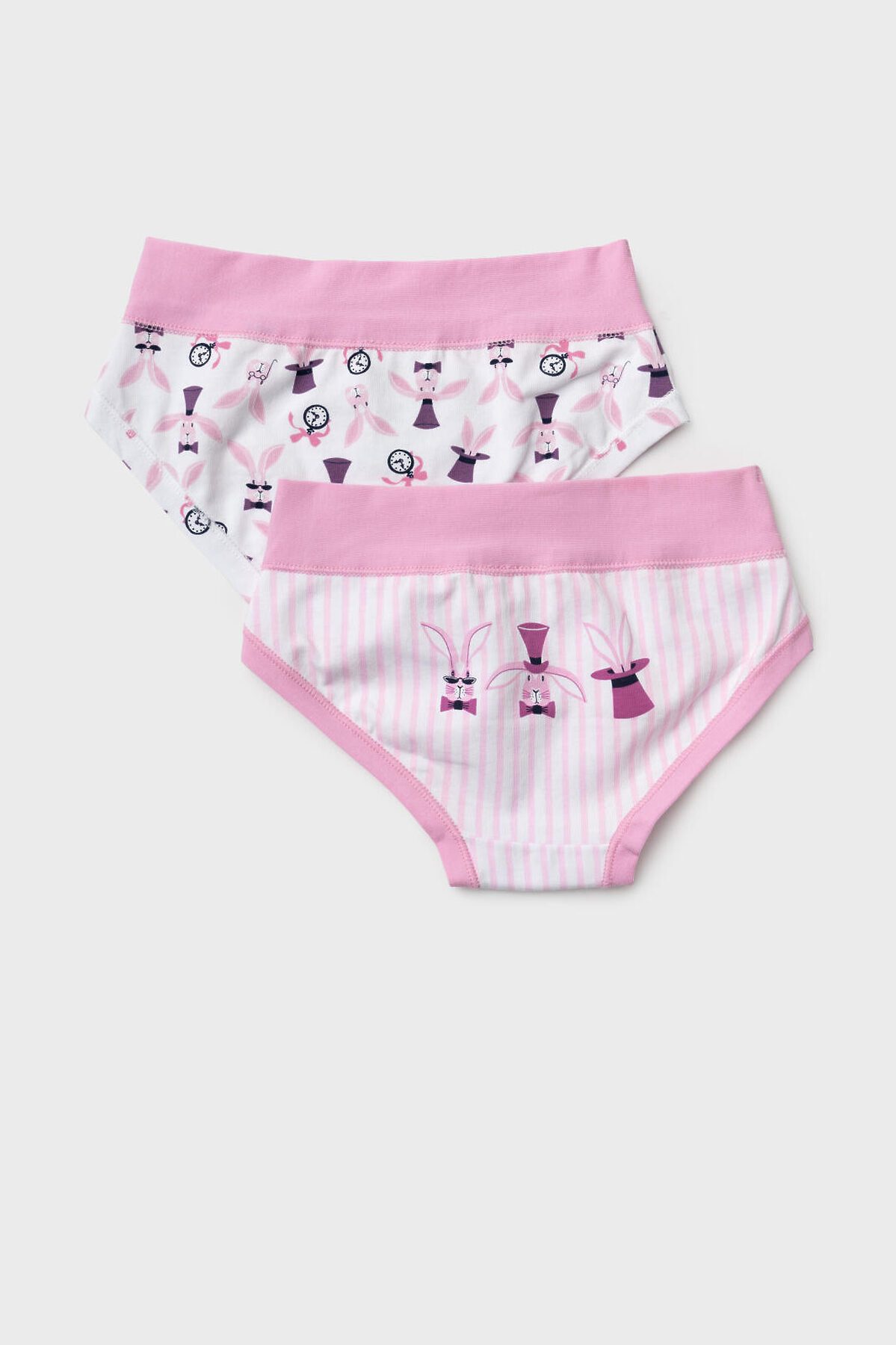 Набор из двух детских трусов-брифов для девочки. Дизайн с любимыми героями из мультфильма "Алиса в стране чудес". Изделия выполнены из мягкого эластичного трикотажа, с широкой розовой резинкой по поясу и окантовкой по вырезам для ног. Внутри предусмотрена ластовица.