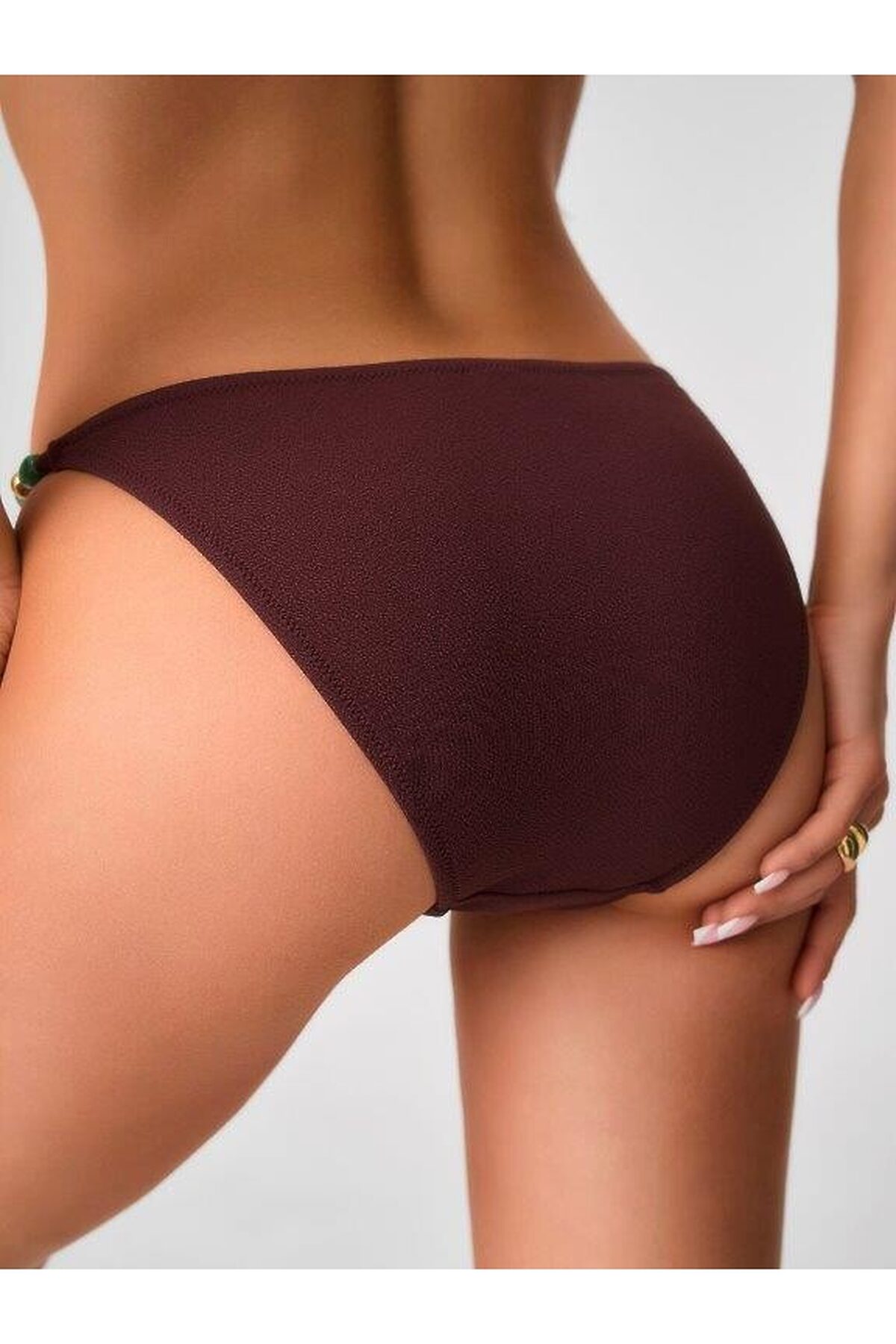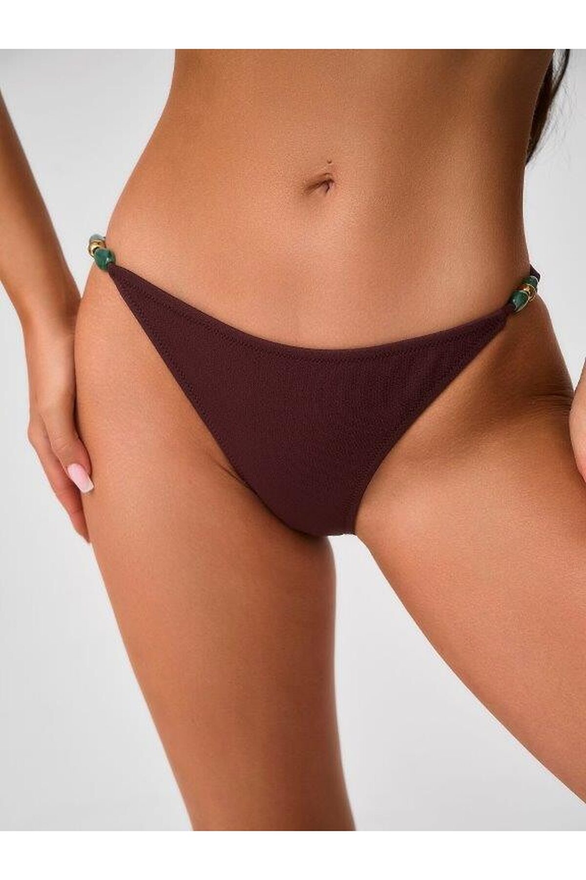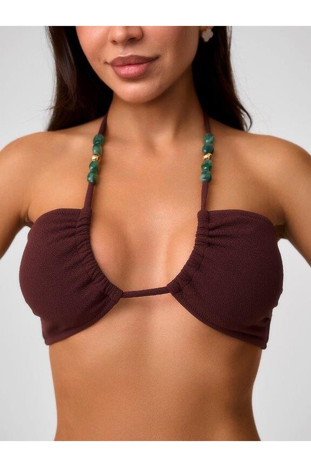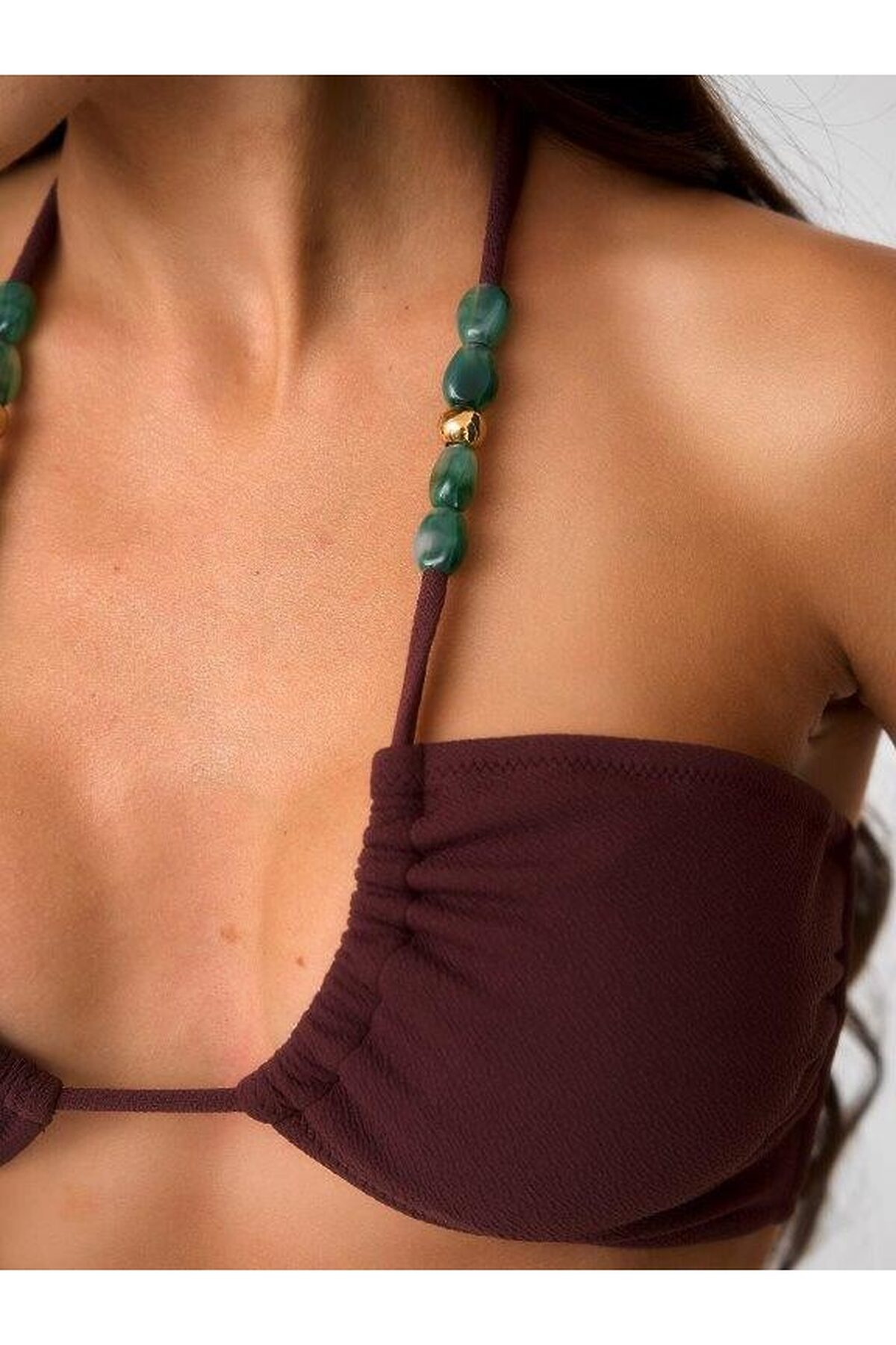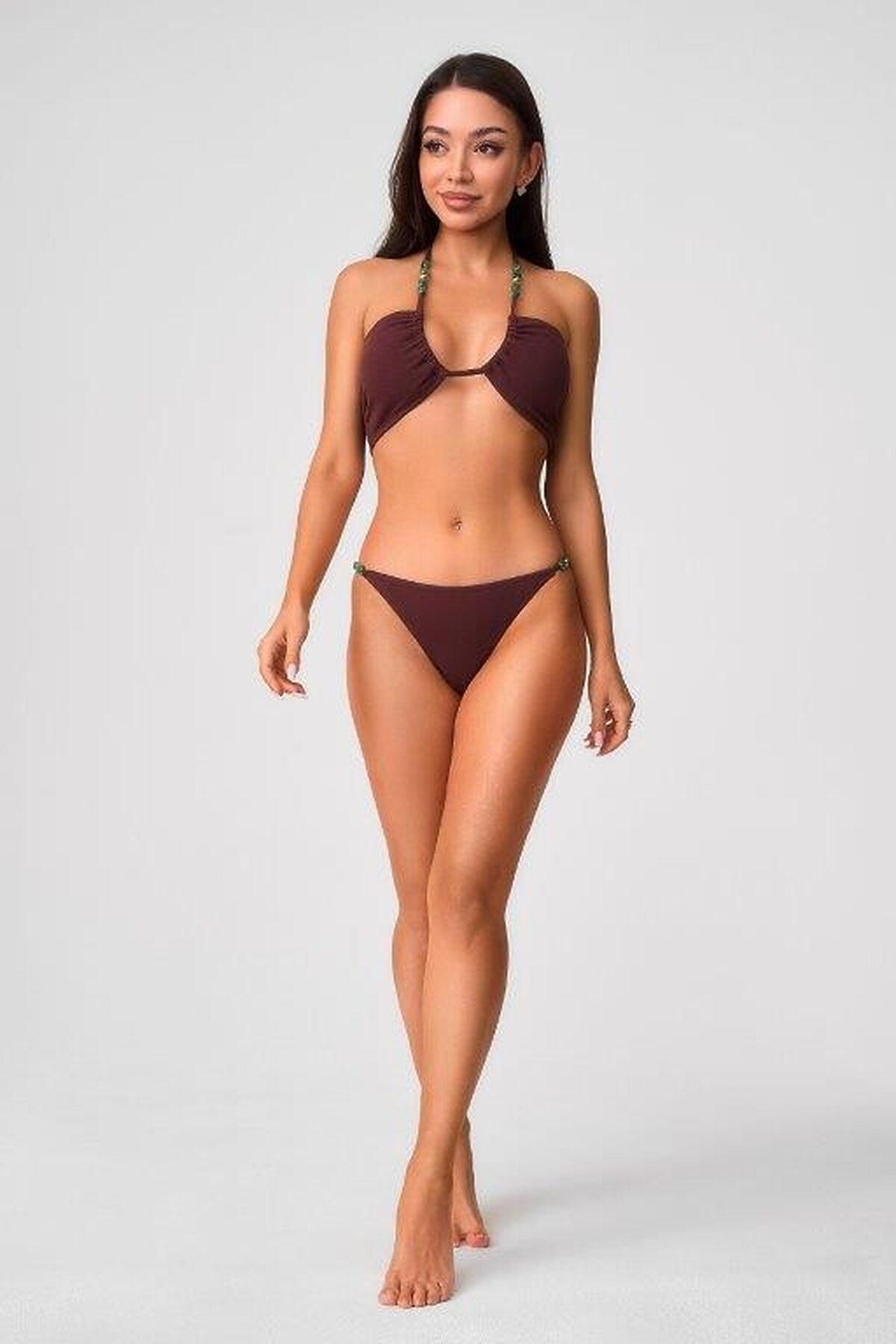 Раздельный купальный костюм из эластичного фактурного материала шоколадного цвета. Бюстгальтер с мягкой чашкой на каркасах , со съемным вкладышем. Бретель украшена контрастными бусинами и завязывается на шее. Пластиковая застежка на спинке.Плавки со средней посадкой на подкладе украшены декоративными бусинами на бочках. По линии талии и вырезу ножек подгиб и плоский шов с резинкой.