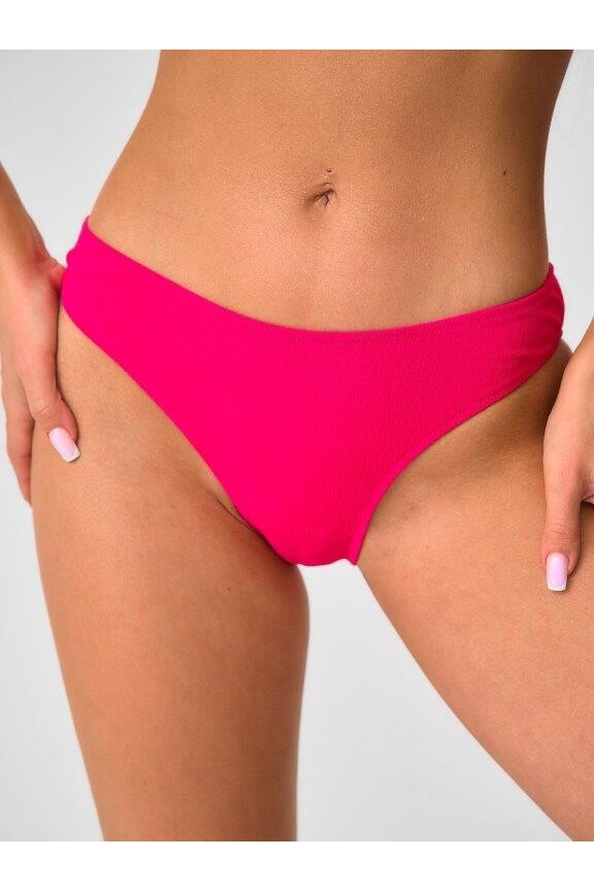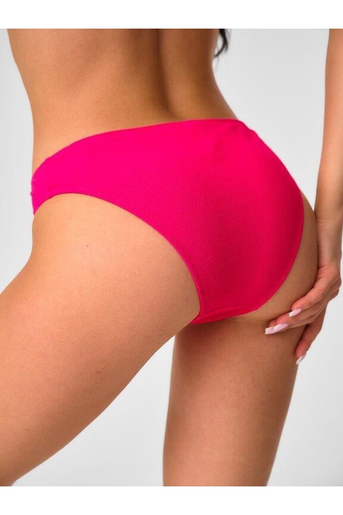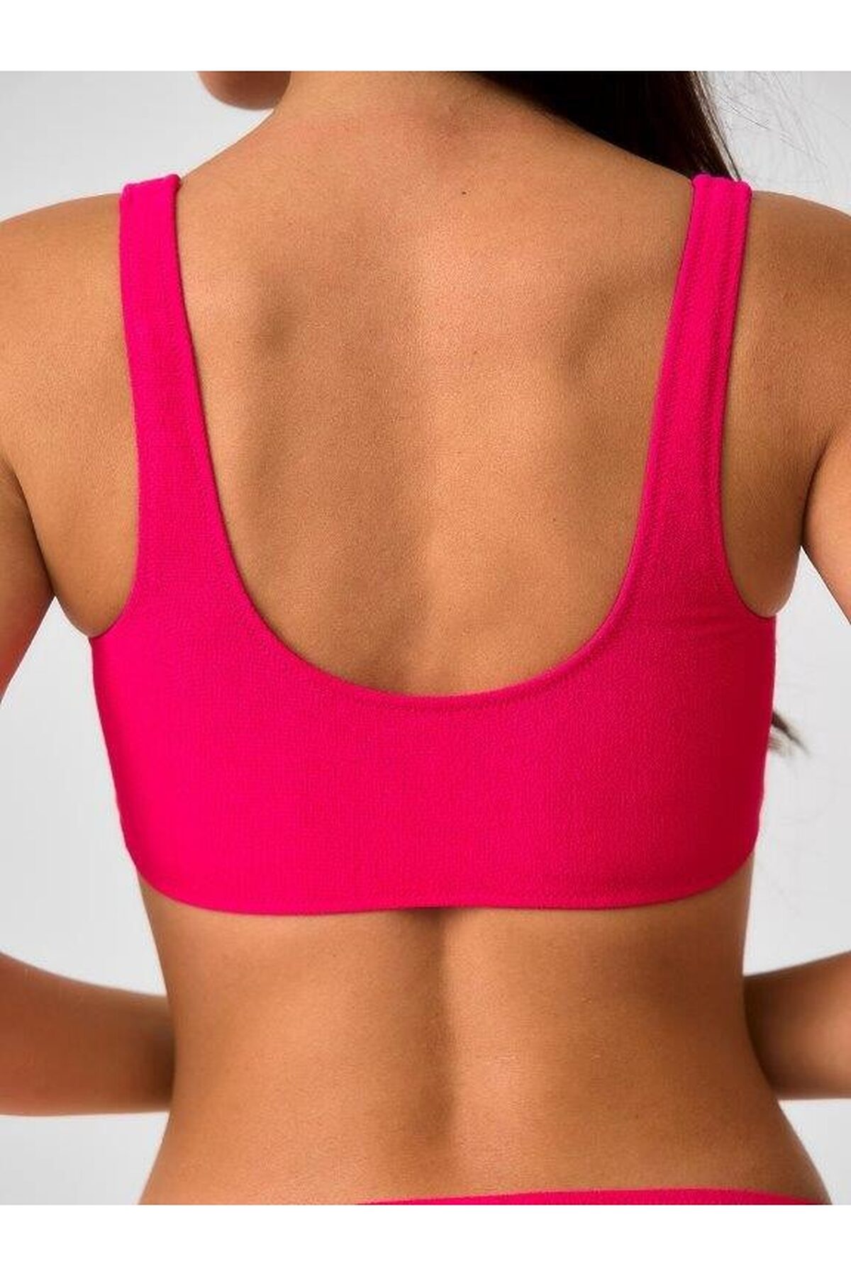 Раздельный купальник на подкладе из фактурного матового полотна с мягкой чашкой soft bra. Бюстгальтер на мягкой чашке со съемными формованными вкладышами, без каркасов и без боковых корсетных вставок. Бретели несъемные и нерегулируемые. Без застежки. Плавки на подкладе с завышенной талией. Тонкая резинка, подгиб и плоский шов по линии талии и срезу ножек.
