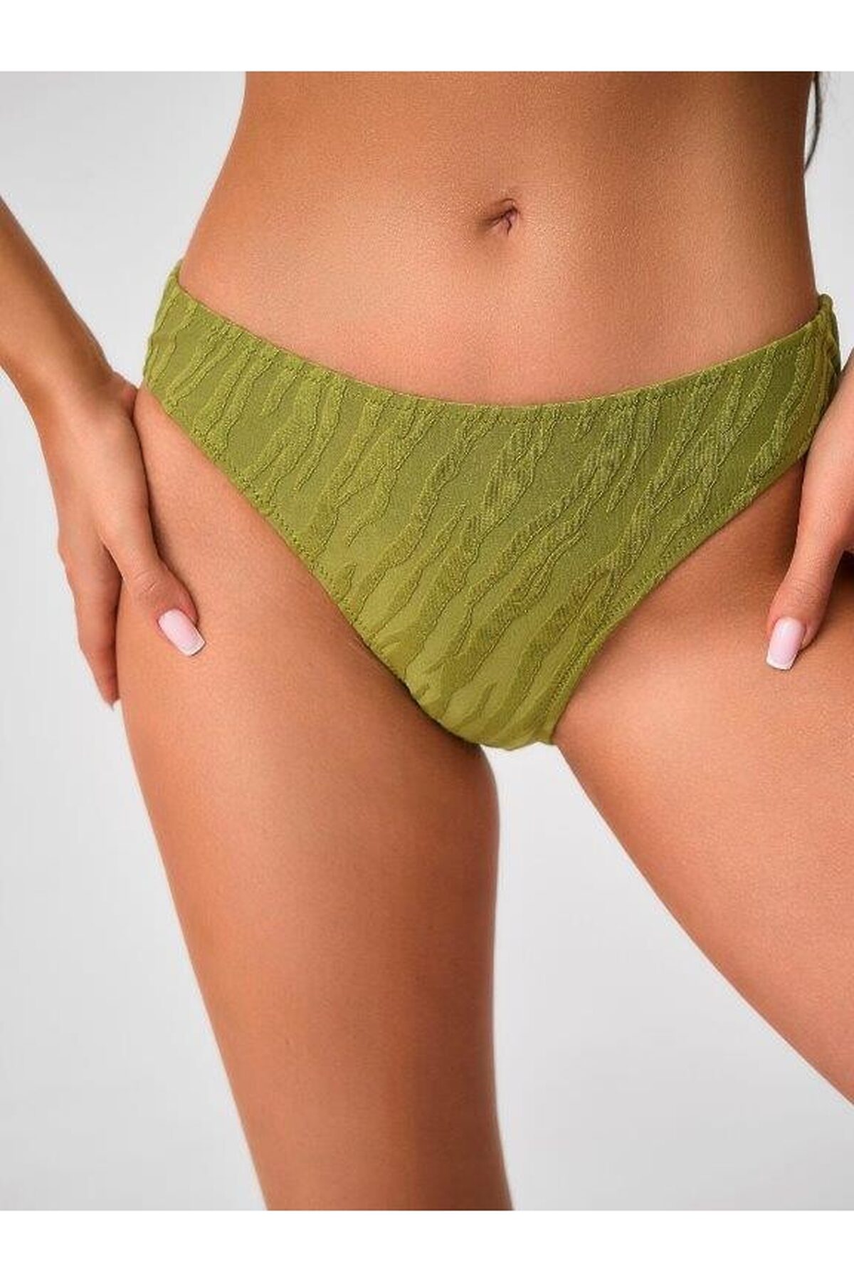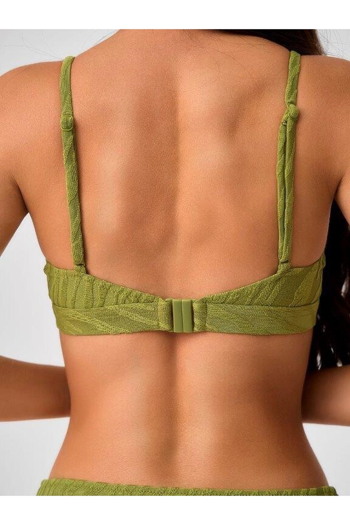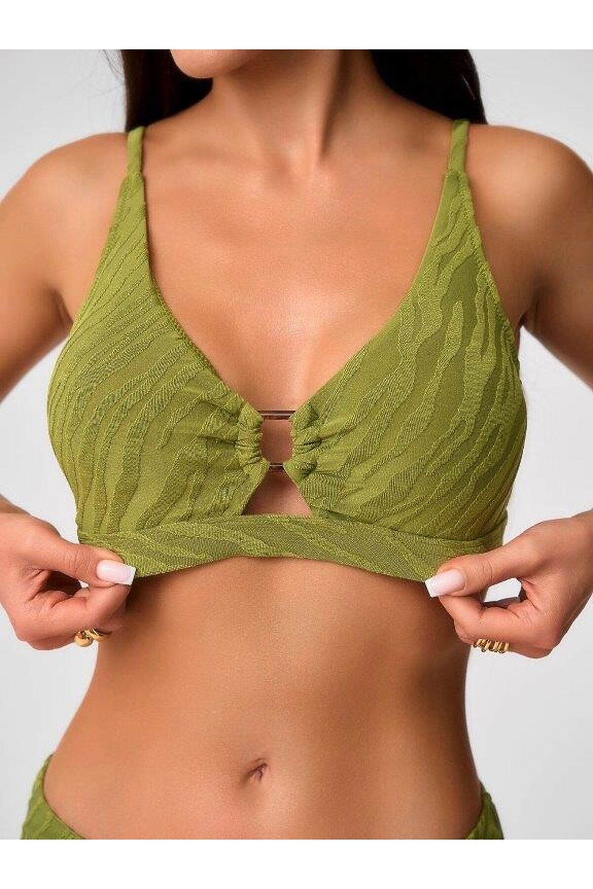 Раздельный купальник с чашкой soft bra из мягкого фактурного полотна. Бюстгальтер с мягкой чашкой,с подкладом и съемными формованными вкладышами. Без каркасов и без боковых корсетных вставок. Пластиковая деталь цвета янтаря соединяет чашки спереди. Бретели регулируемые, несъемные.Пластиковая застежка на спине. Плавки на подкладе, со средней посадкой. Тонкая резинка, подгиб и плоский шов по талии и срезу ножек.Декоративный завязывающийся пояс по линии талии из ткани купальника