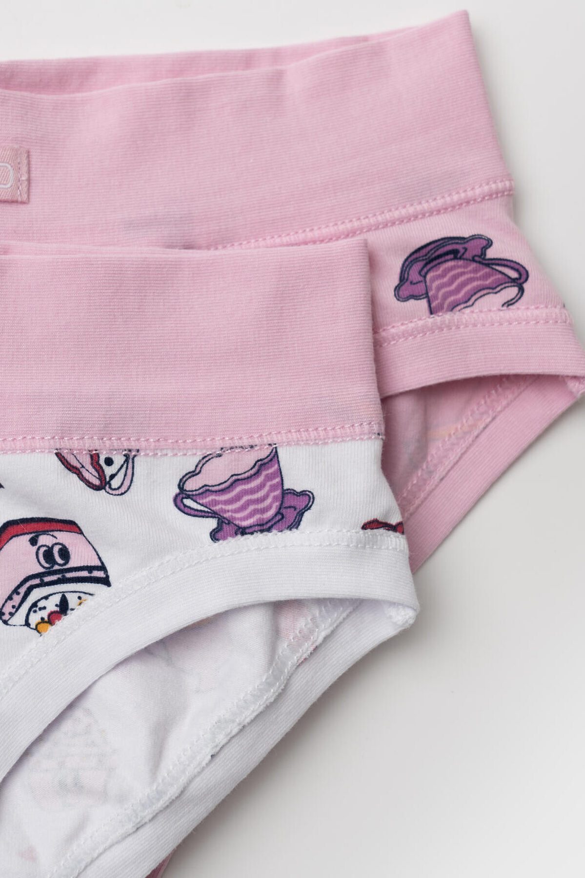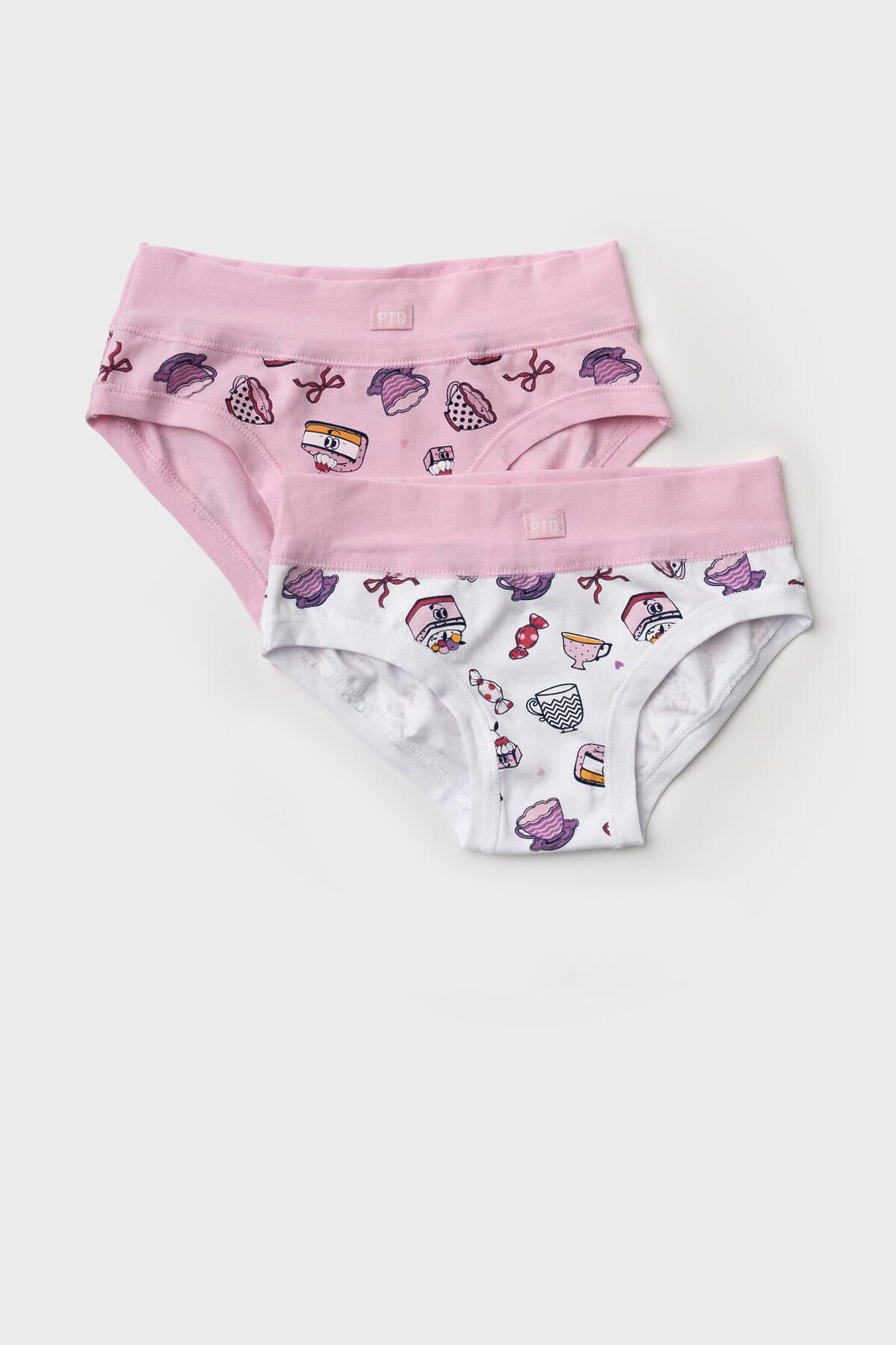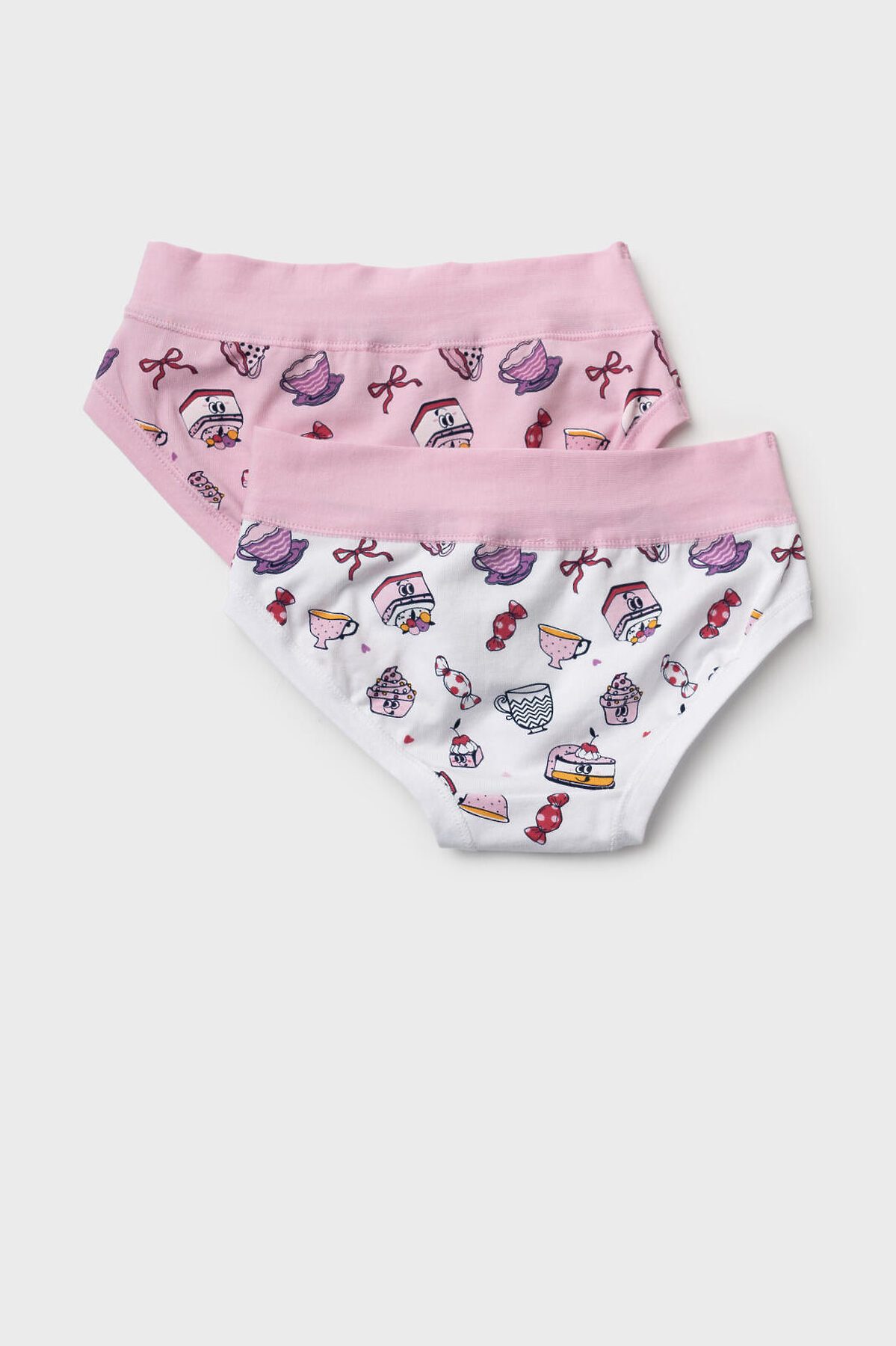 Набор из двух детских трусов-брифов для девочки. Дизайн с любимыми сладостями - капкейками и конфетами. Изделия выполнены из мягкого эластичного трикотажа, с широкой розовой резинкой по поясу и окантовкой по вырезам для ног. Внутри предусмотрена ластовица.