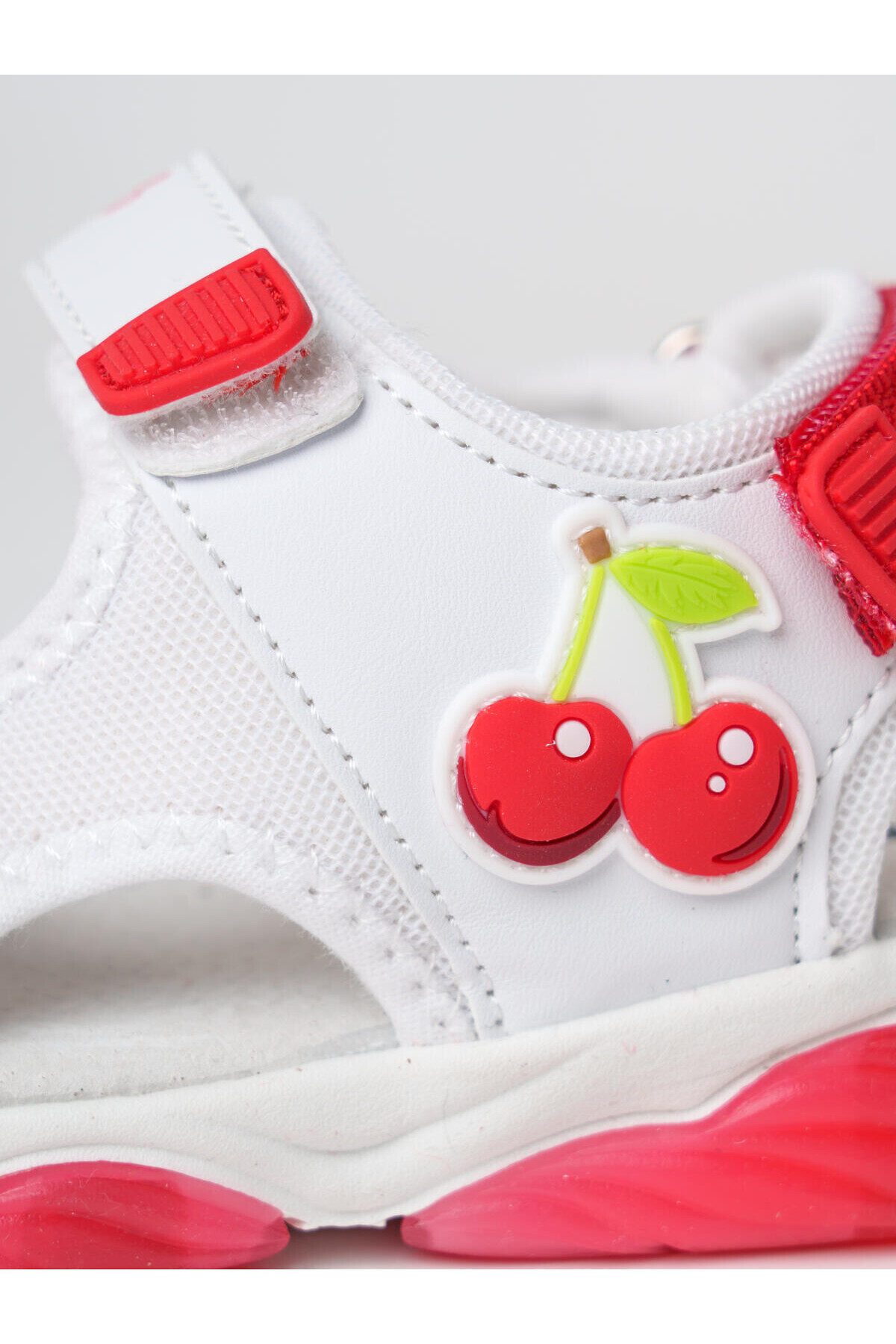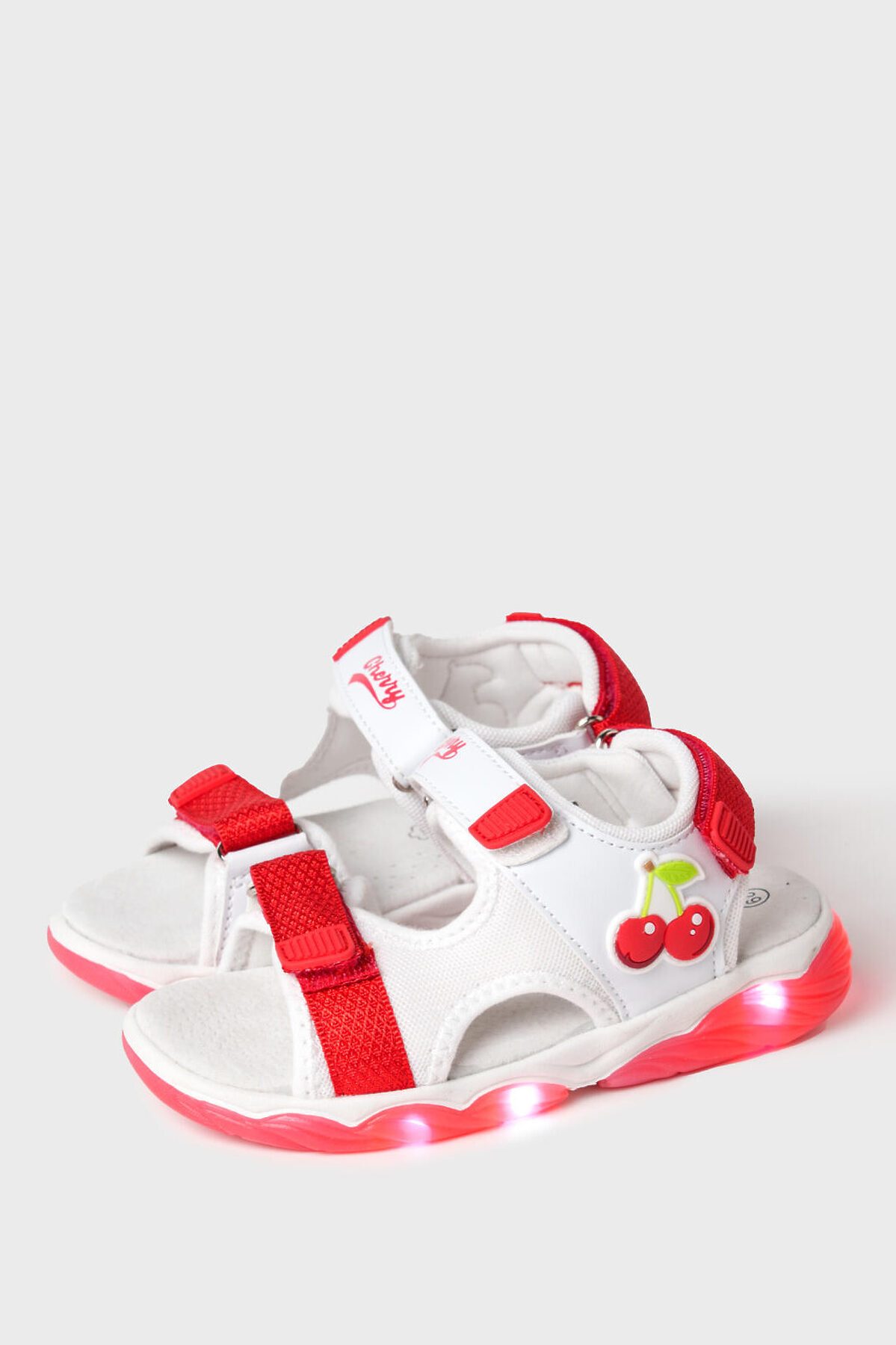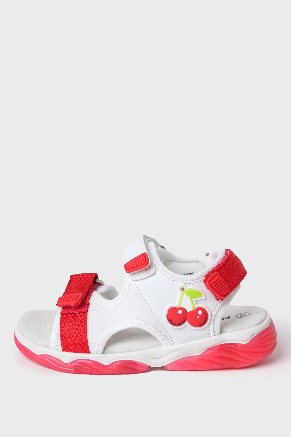 Нарядные сандалии для девочки с открытой носочной и пяточной частью. Сандалии выполнены из искусственной кожи и дышащего текстиля и декорированы патчем вишенками. Стелька выполнена из натуральной кожи. Текстильная подкладка c высоким содержанием хлопка 80% обладает высокой гигроскопичностью. Удобные возвратные ремни с липучками позволяют регулировать обувь на любой подъем. Подошва из ТПР имеет LED-подсветку.