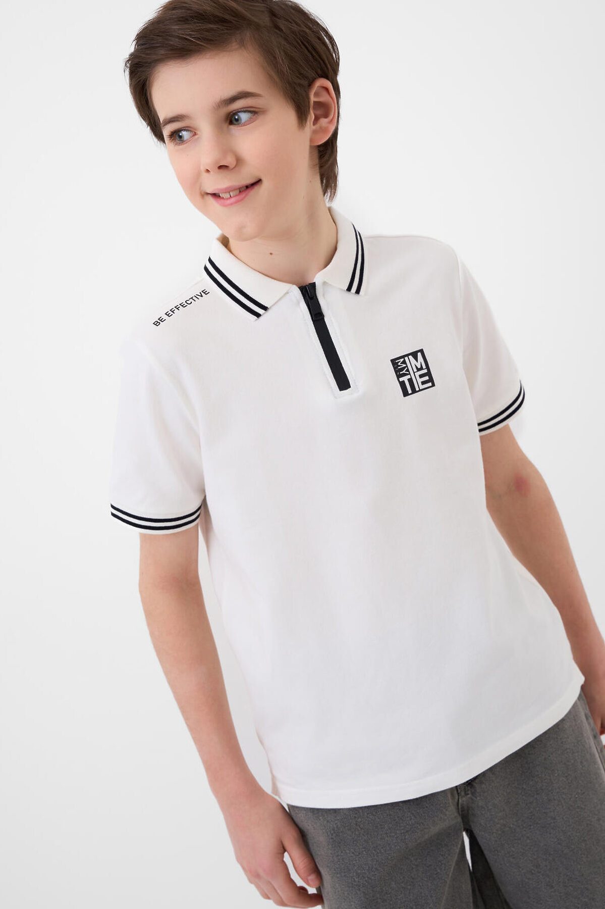 Поло прямого силуэта с коротким рукавом для мальчика подростка. Выполнено из фактурного трикотажа пике. Спереди — короткая застежка-молния до середины груди. На груди расположен вертикальный логотип, на плече и спине — надписи. У изделия разрезы по бокам и декоративные детали по горловине.