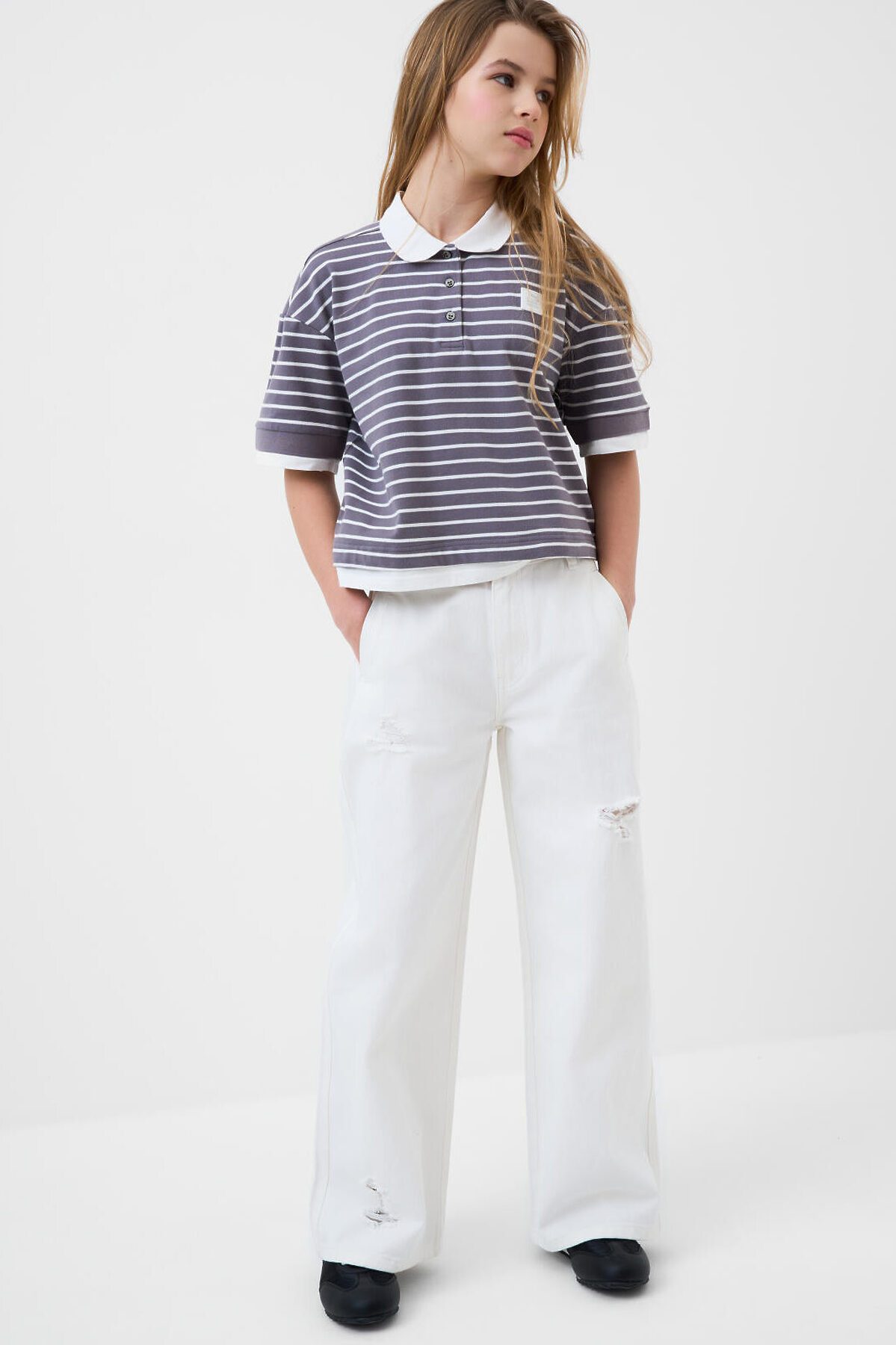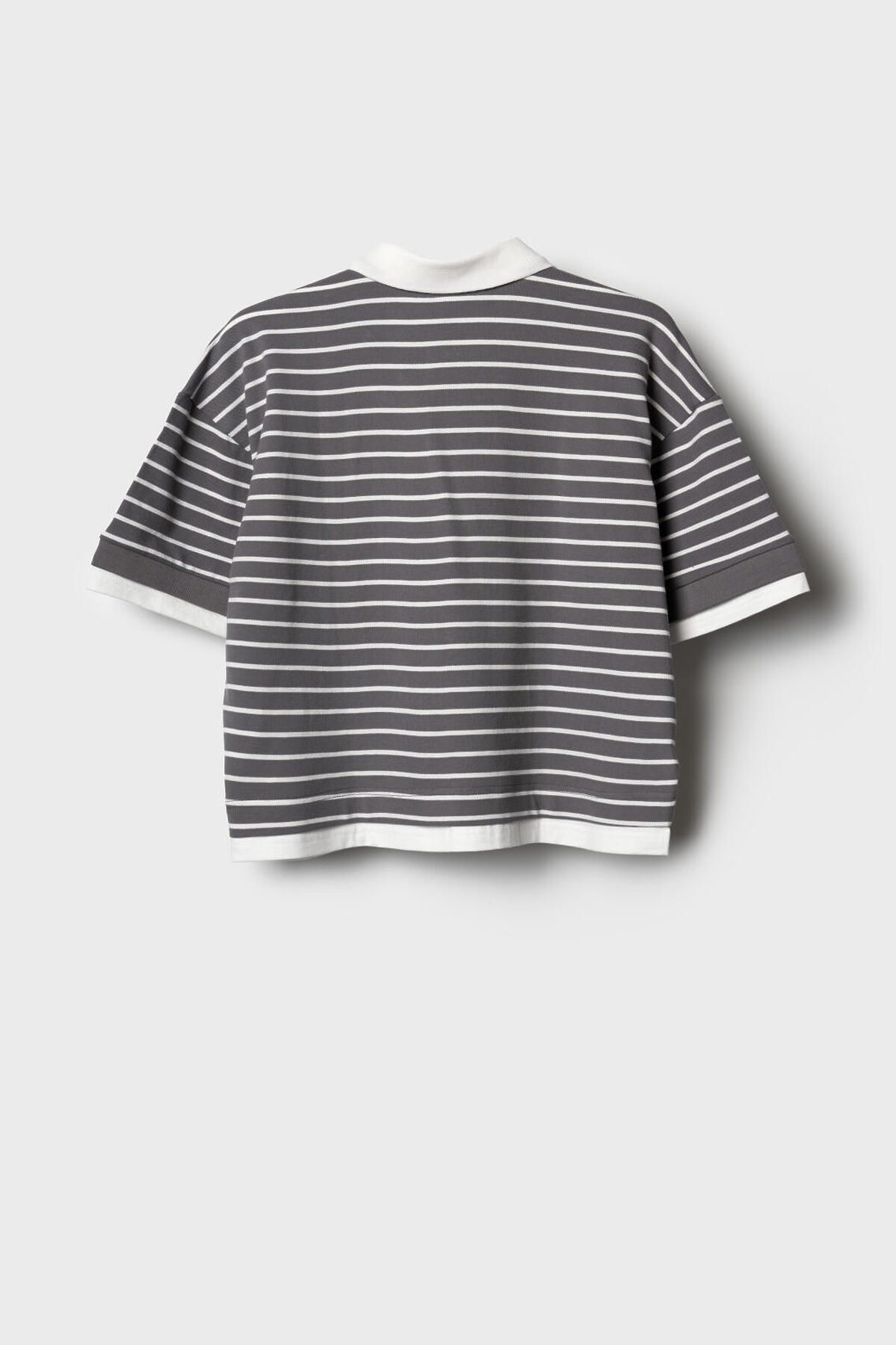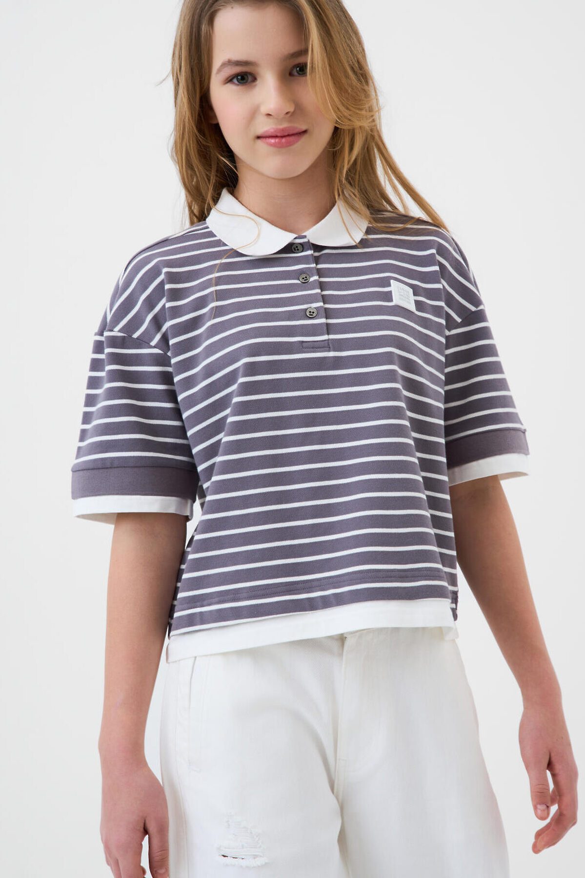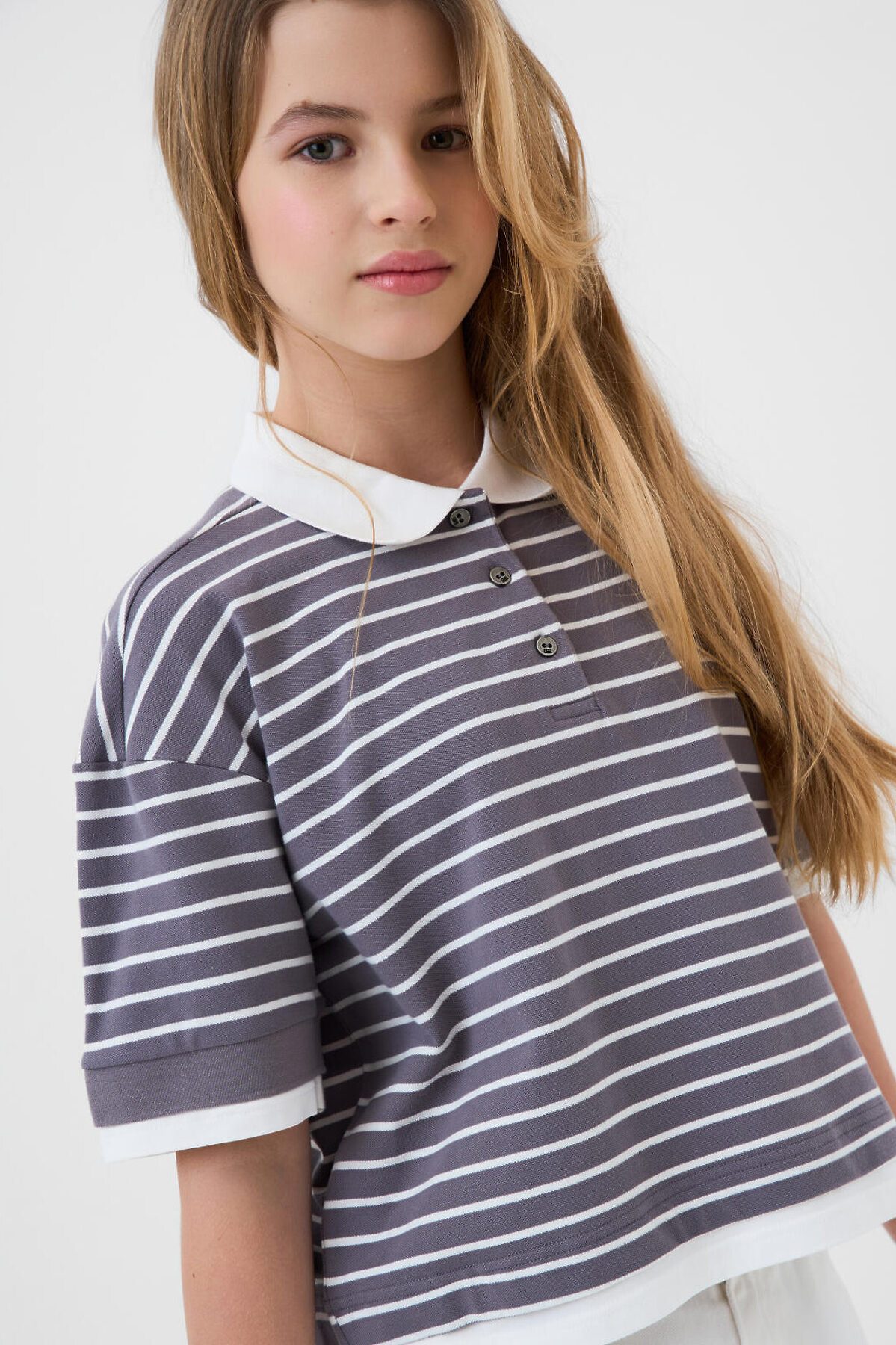 Футболка-поло в полоску для девочки подростка. Модель оверсайз с коротким рукавом. Поло с классическим отложным воротником и застёжкой на три пуговицы. Материал — хлопковой трикотаж. На груди размещена небольшая нашивка с логотипом.