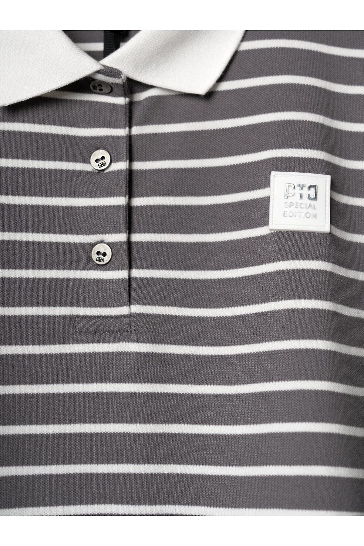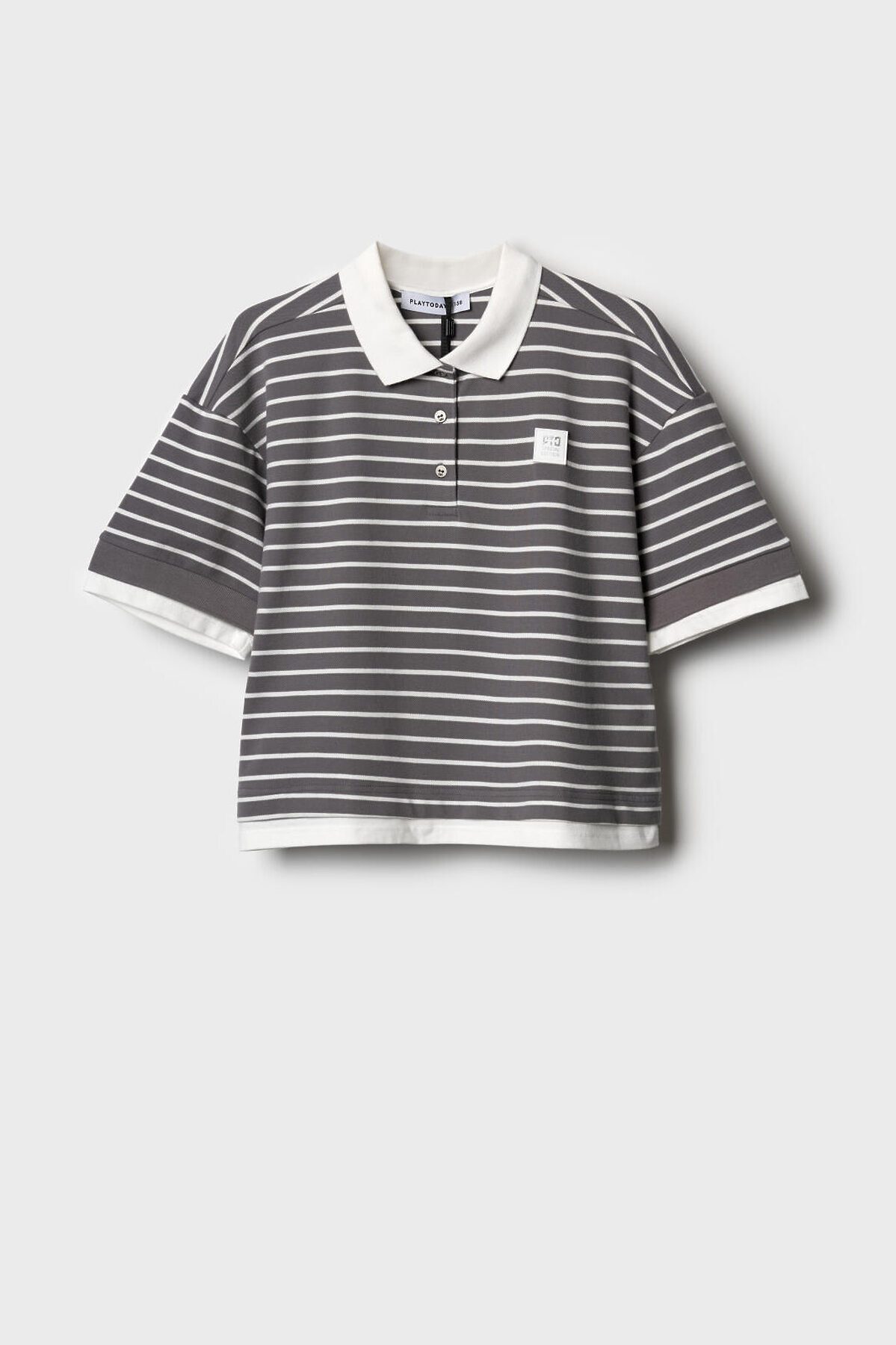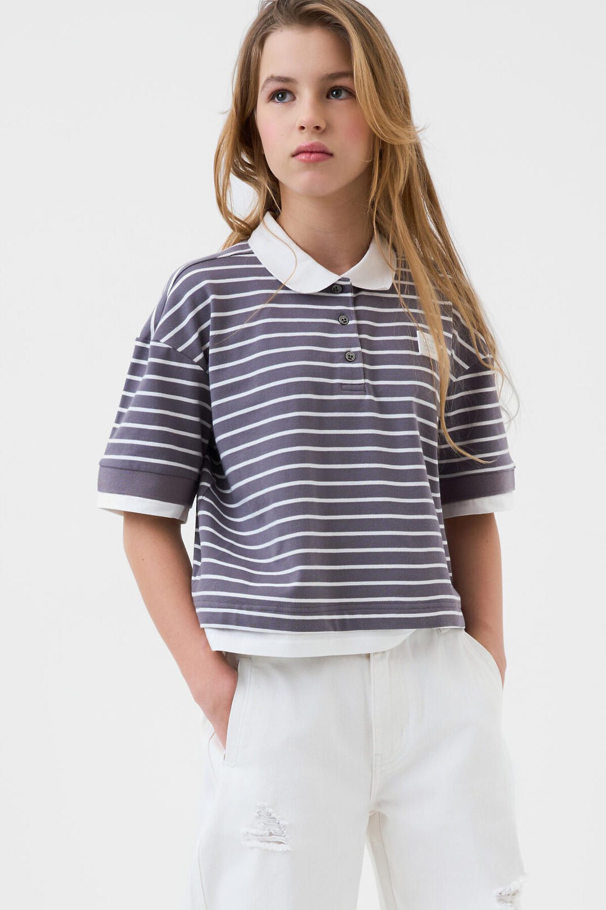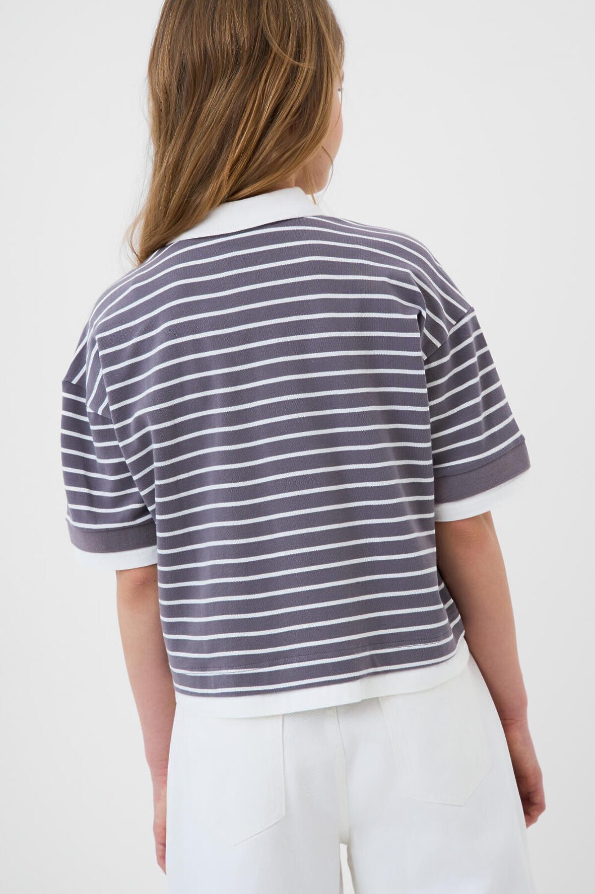 Футболка-поло в полоску для девочки подростка. Модель оверсайз с коротким рукавом. Поло с классическим отложным воротником и застёжкой на три пуговицы. Материал — хлопковой трикотаж. На груди размещена небольшая нашивка с логотипом.