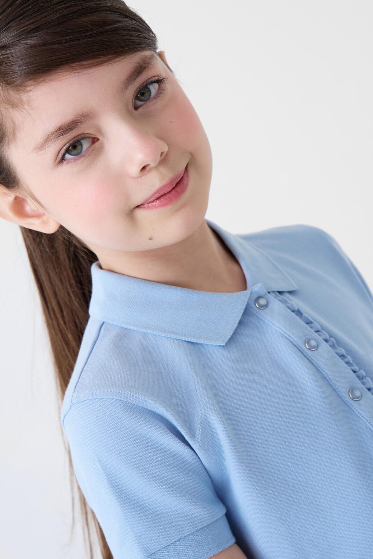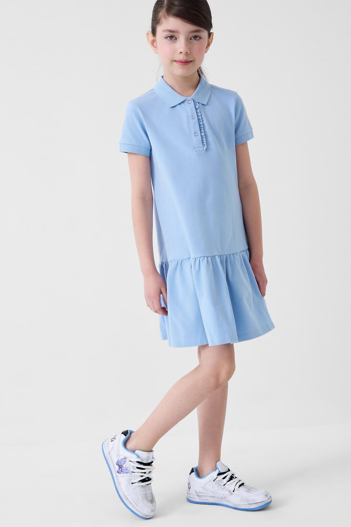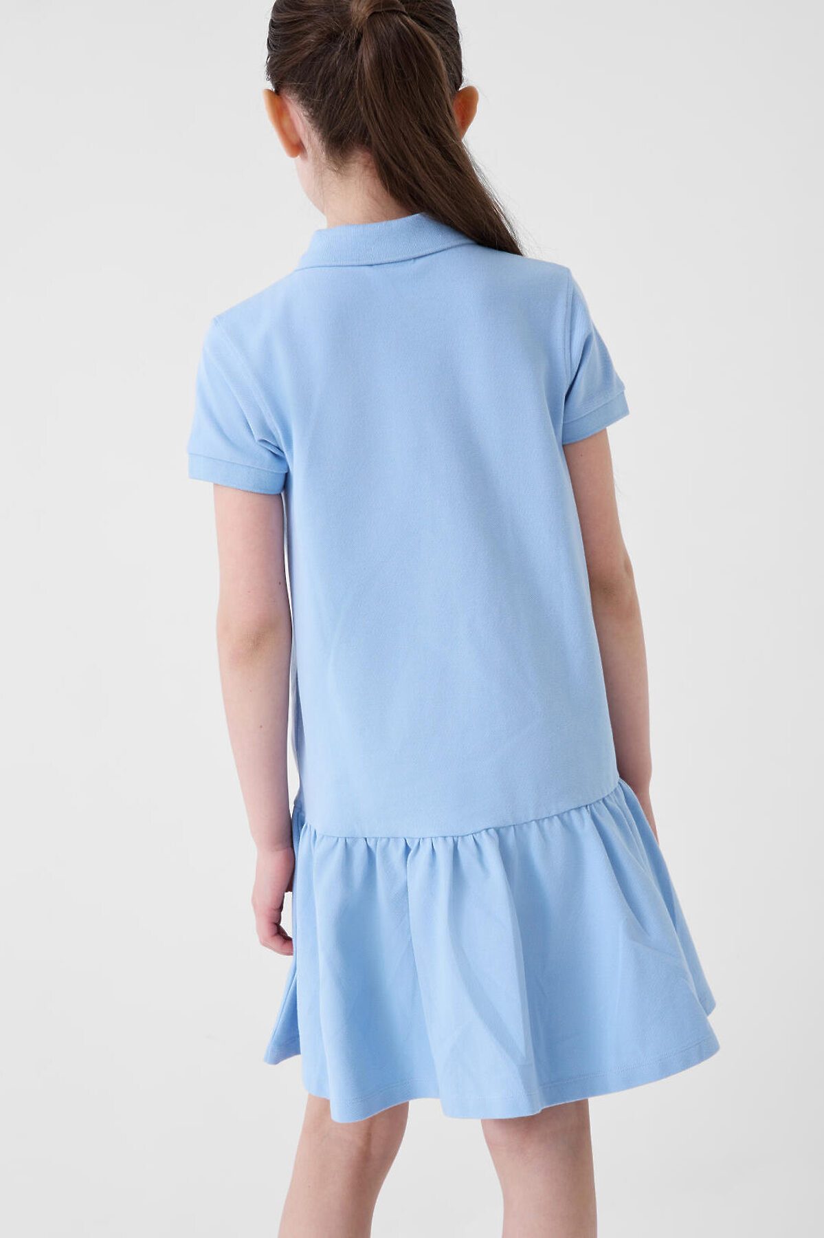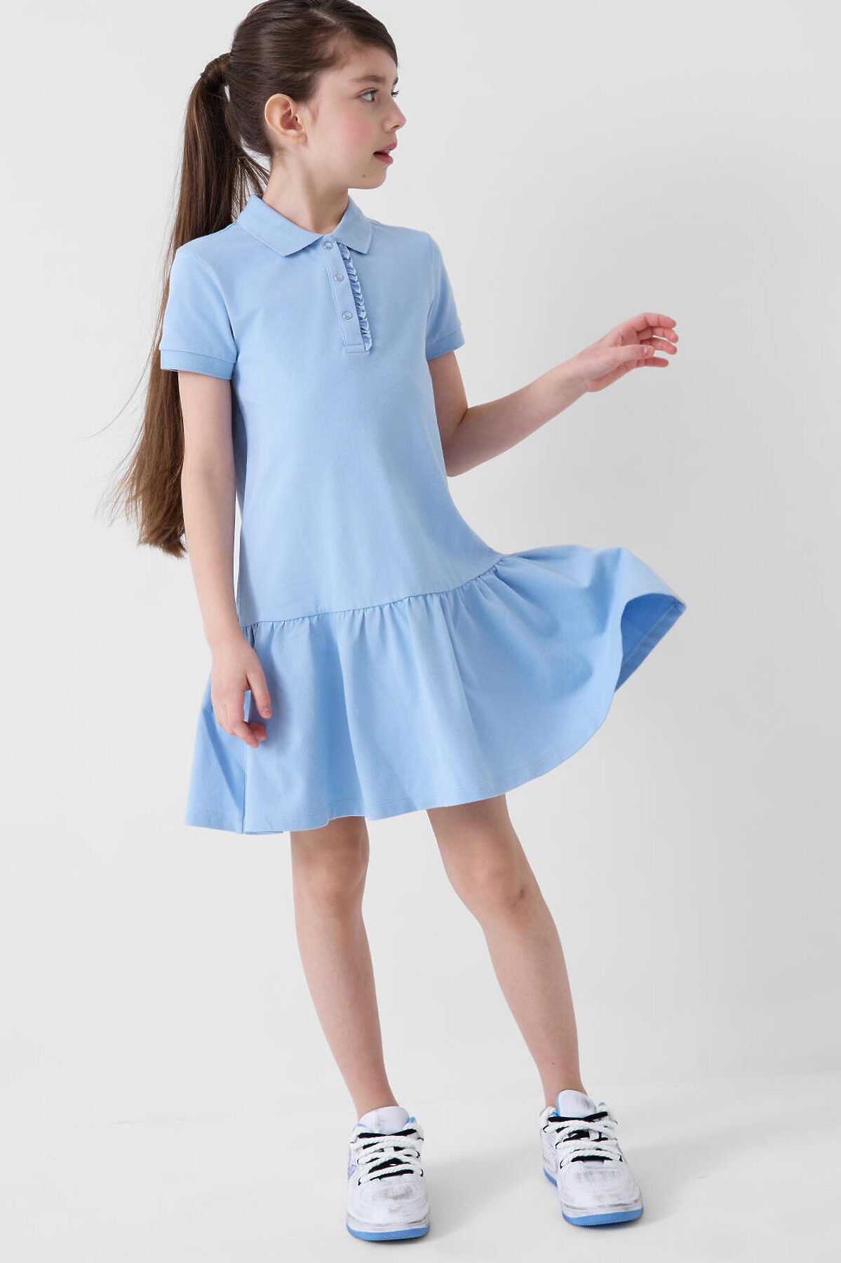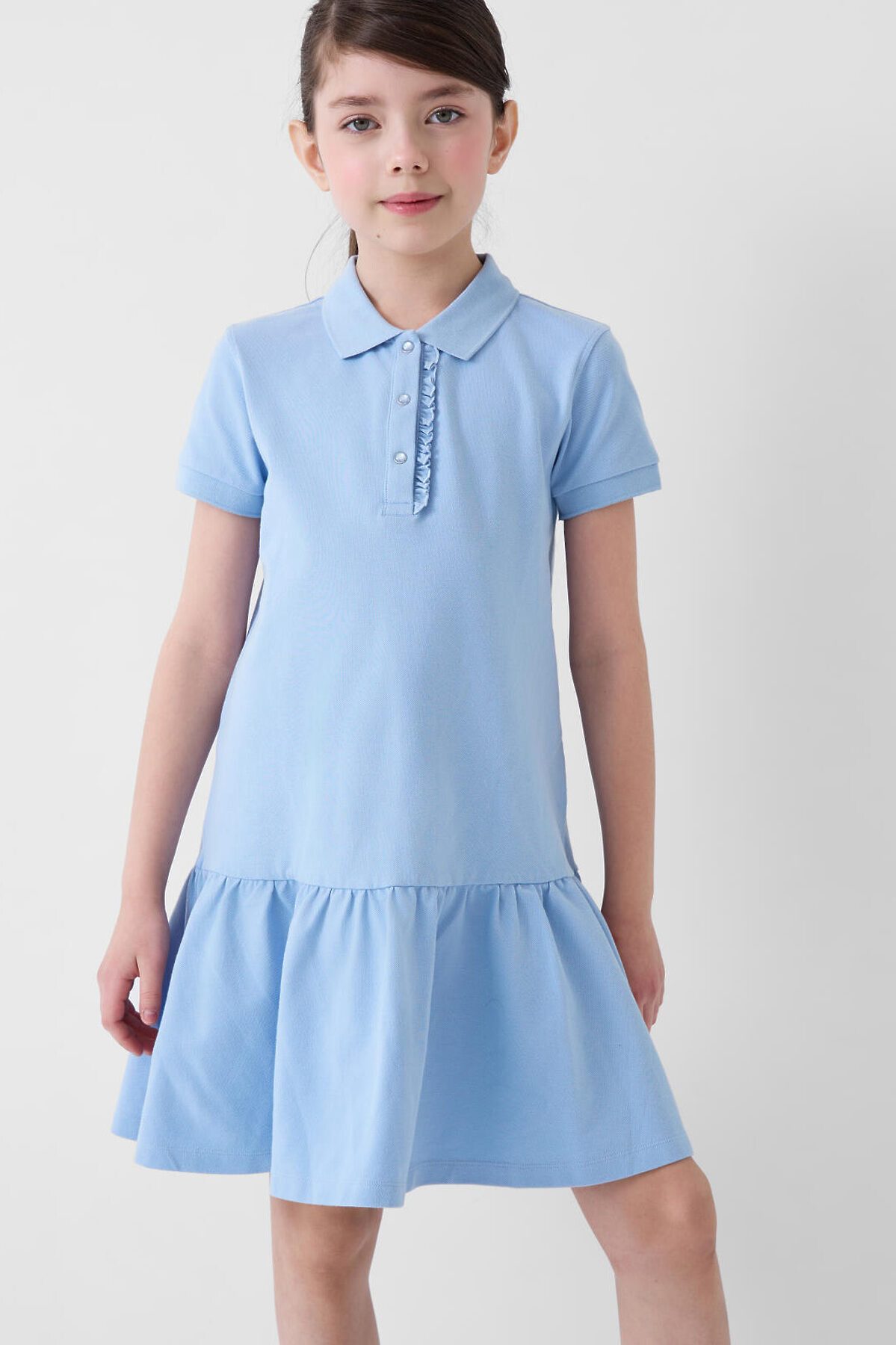 Трикотажное платье-поло для девочки подростка. Платье прямого кроя, имеет классический рубашечный воротник и планку на кнопках. Основной материал — хлопковый трикотаж пике. Воротник, манжеты выполнены из риба.