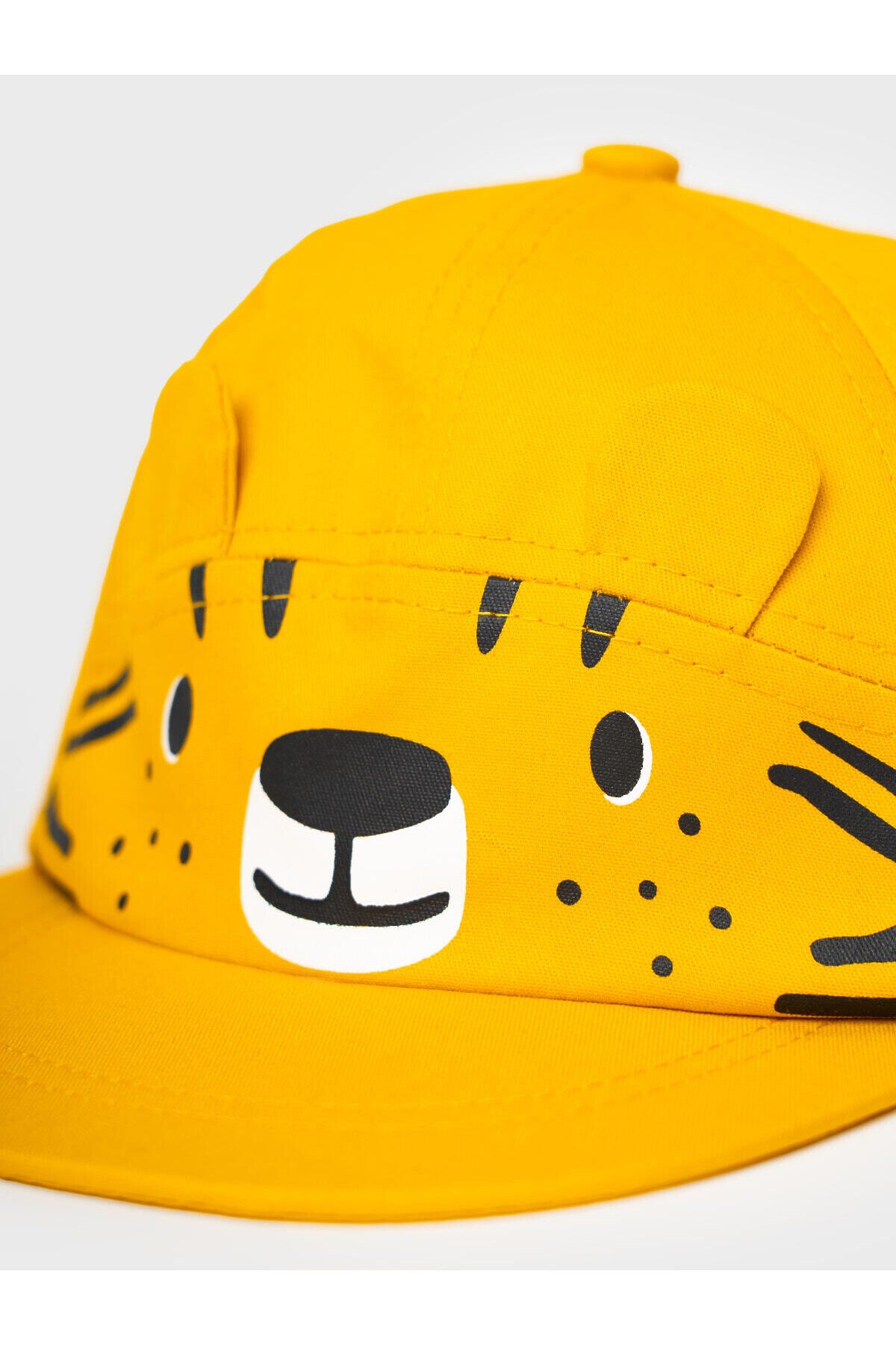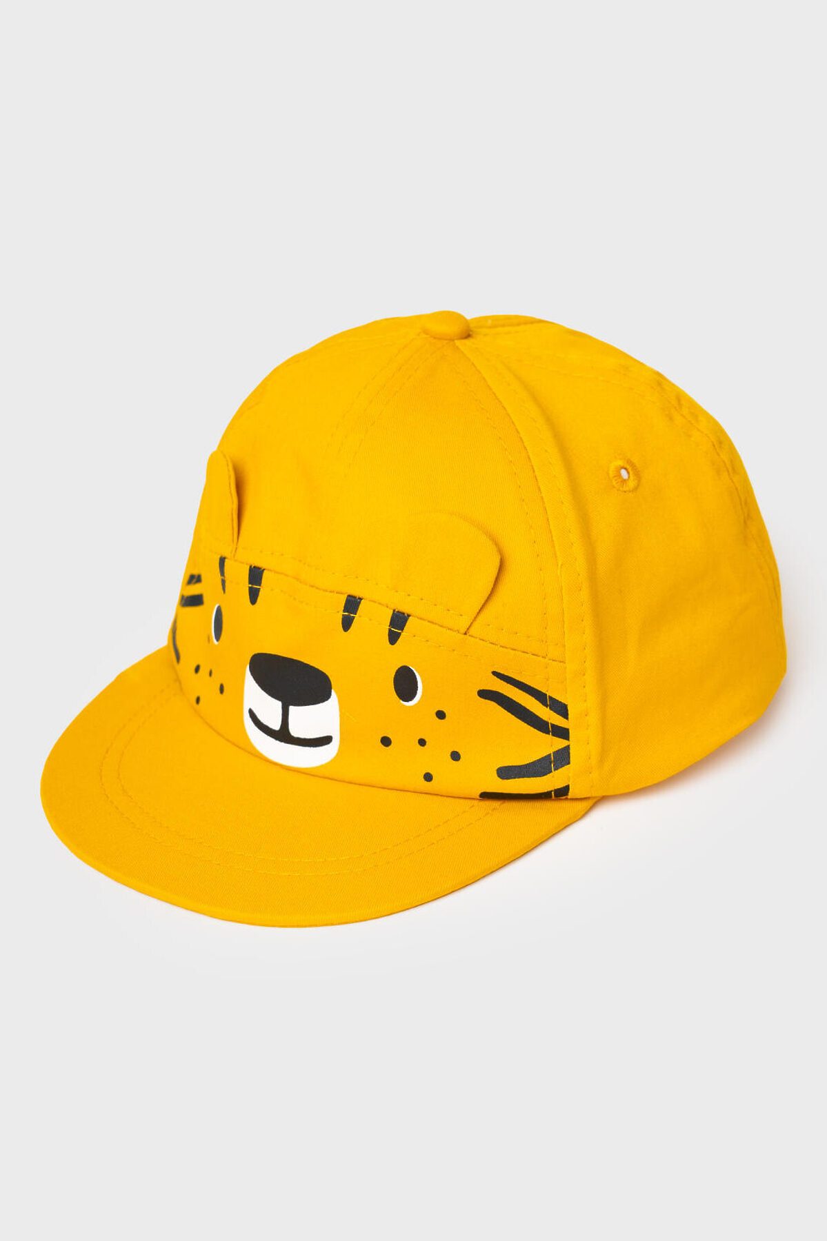 Яркая и весёлая детская бейсболка для малышей, выполненная в виде мордочки тигрёнка. Спереди размещён принт с лицом тигра и объёмными ушками, что делает изделие особенно милым. Козырёк изогнутый. Сзади — эластичная резинка, благодаря которой кепка удобно сидит на голове. Изделие выполнено из натурального хлопка, внутри есть мягкая окантовка.