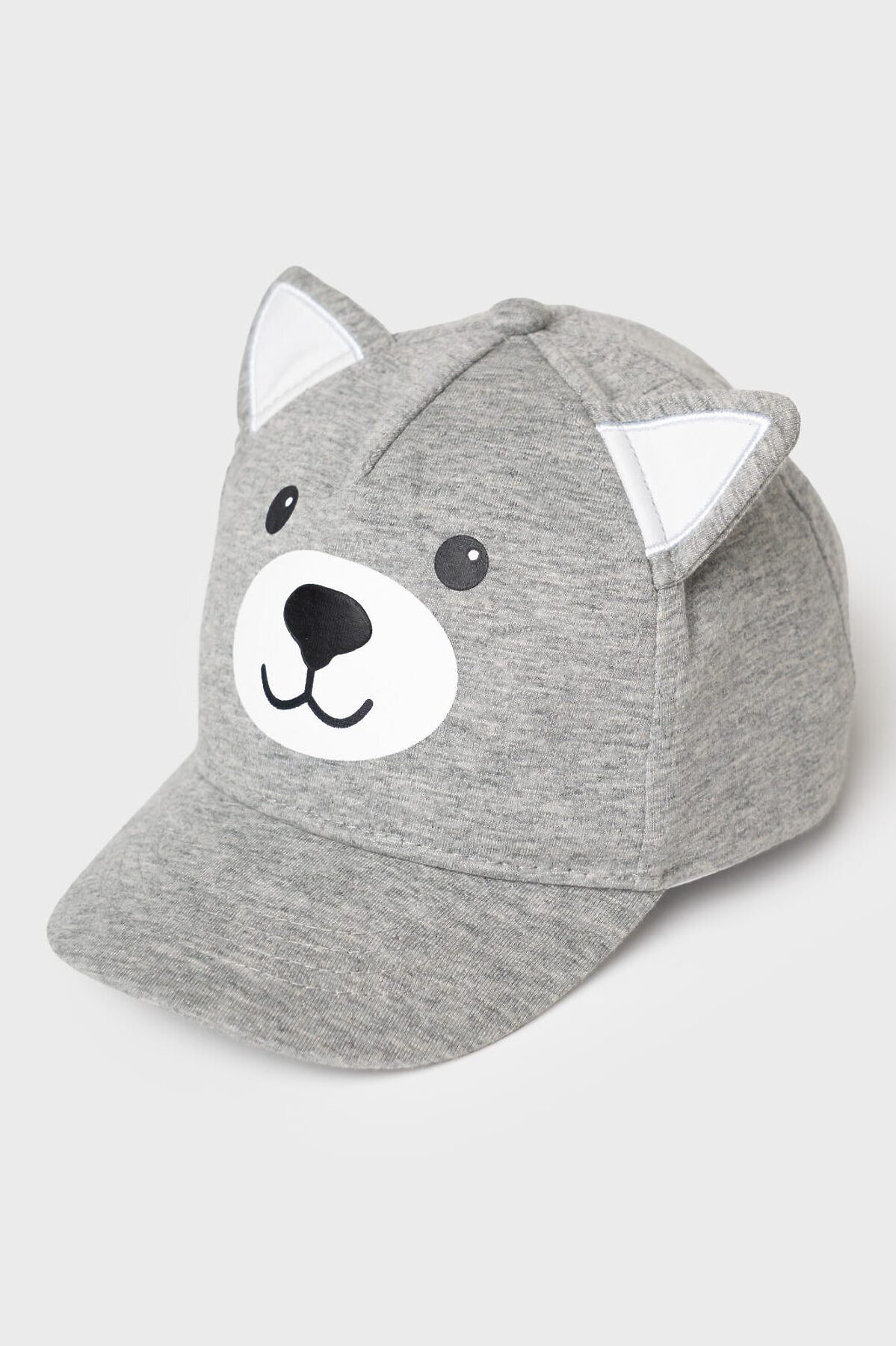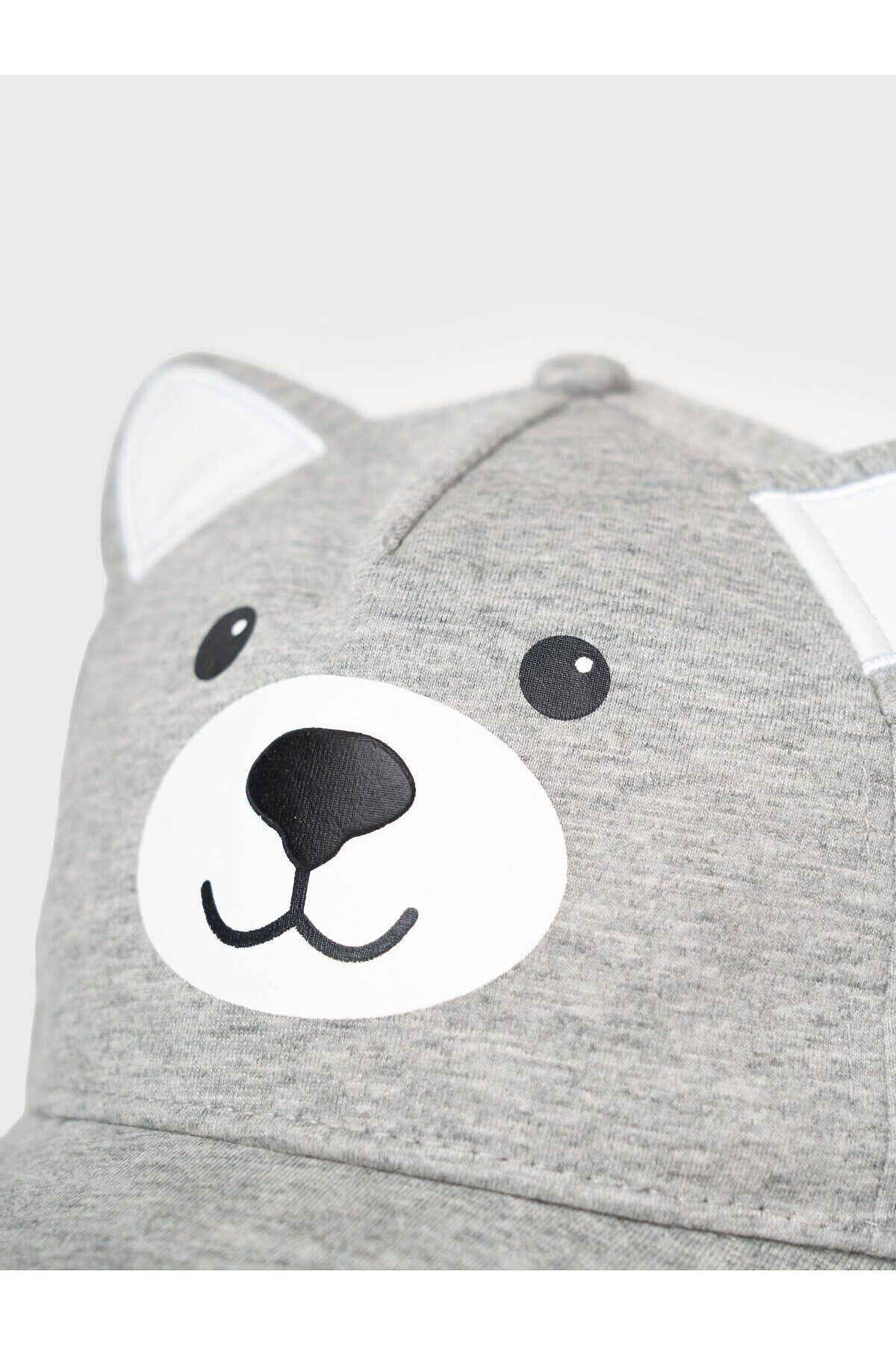 Детская бейсболка для мальчика. Выполнена из мягкого хлопкового трикотажного полотна. Классическая форма с изогнутым козырьком. Главная особенность дизайна — лицо животного на передней части и объёмные ушки, пришитые сверху. На затылке — удобная эластичная резинка, которая помогает лучше фиксировать кепку на голове. Есть небольшие отверстия для вентиляции.