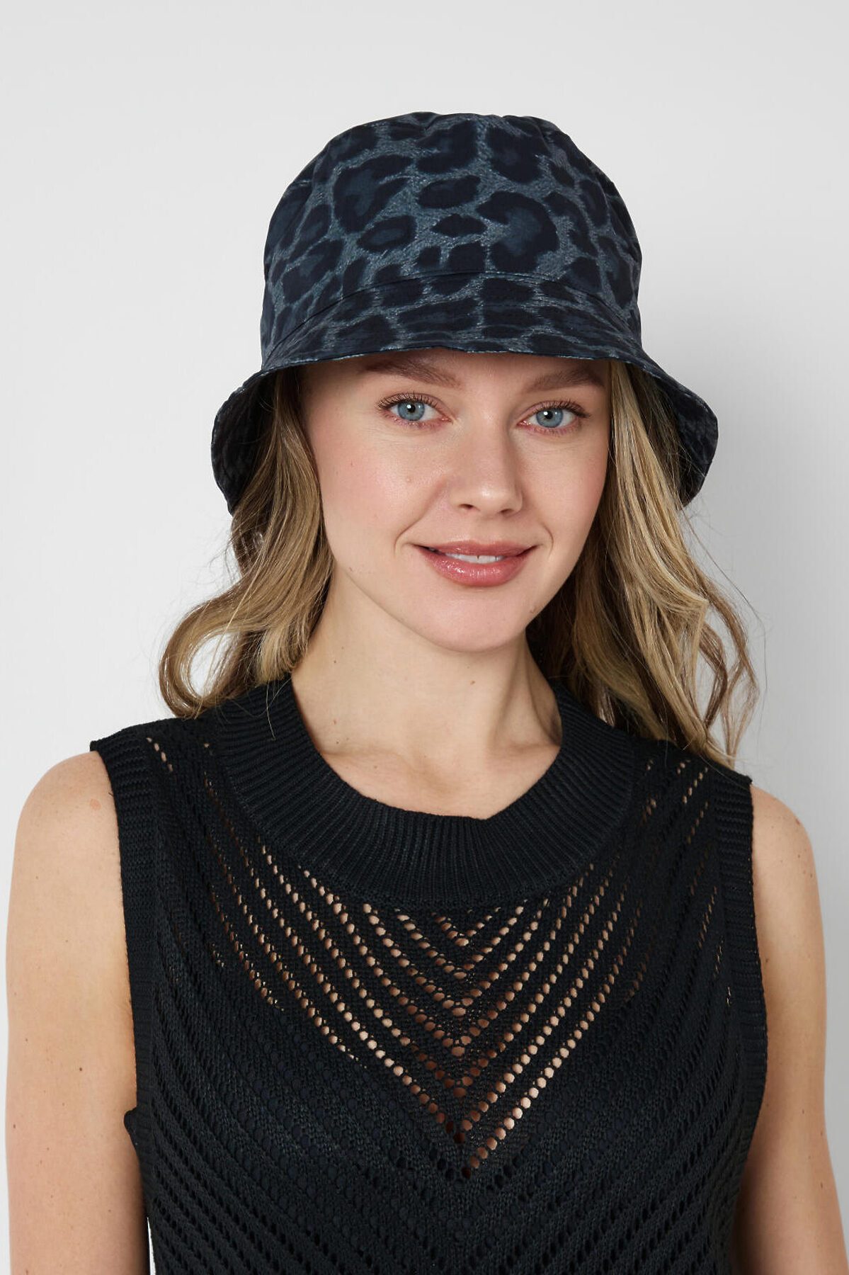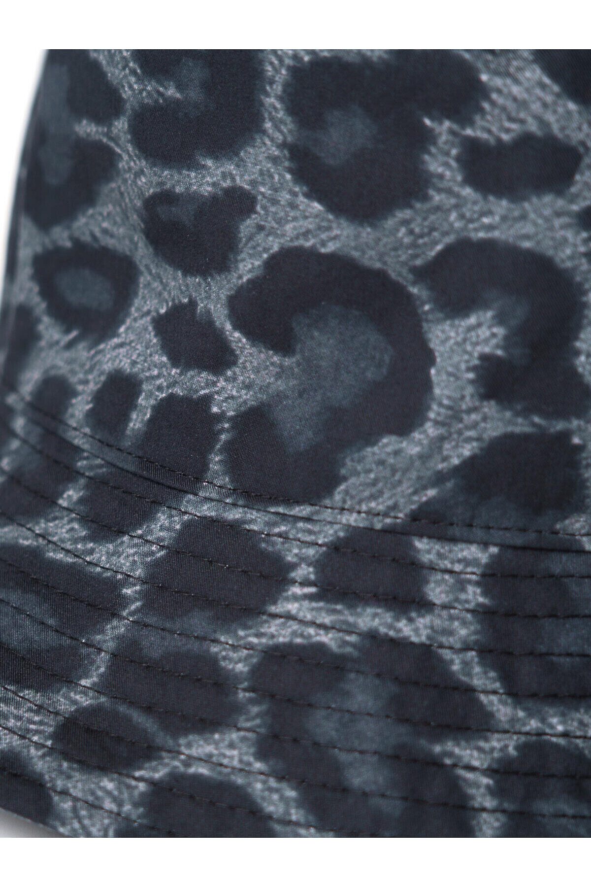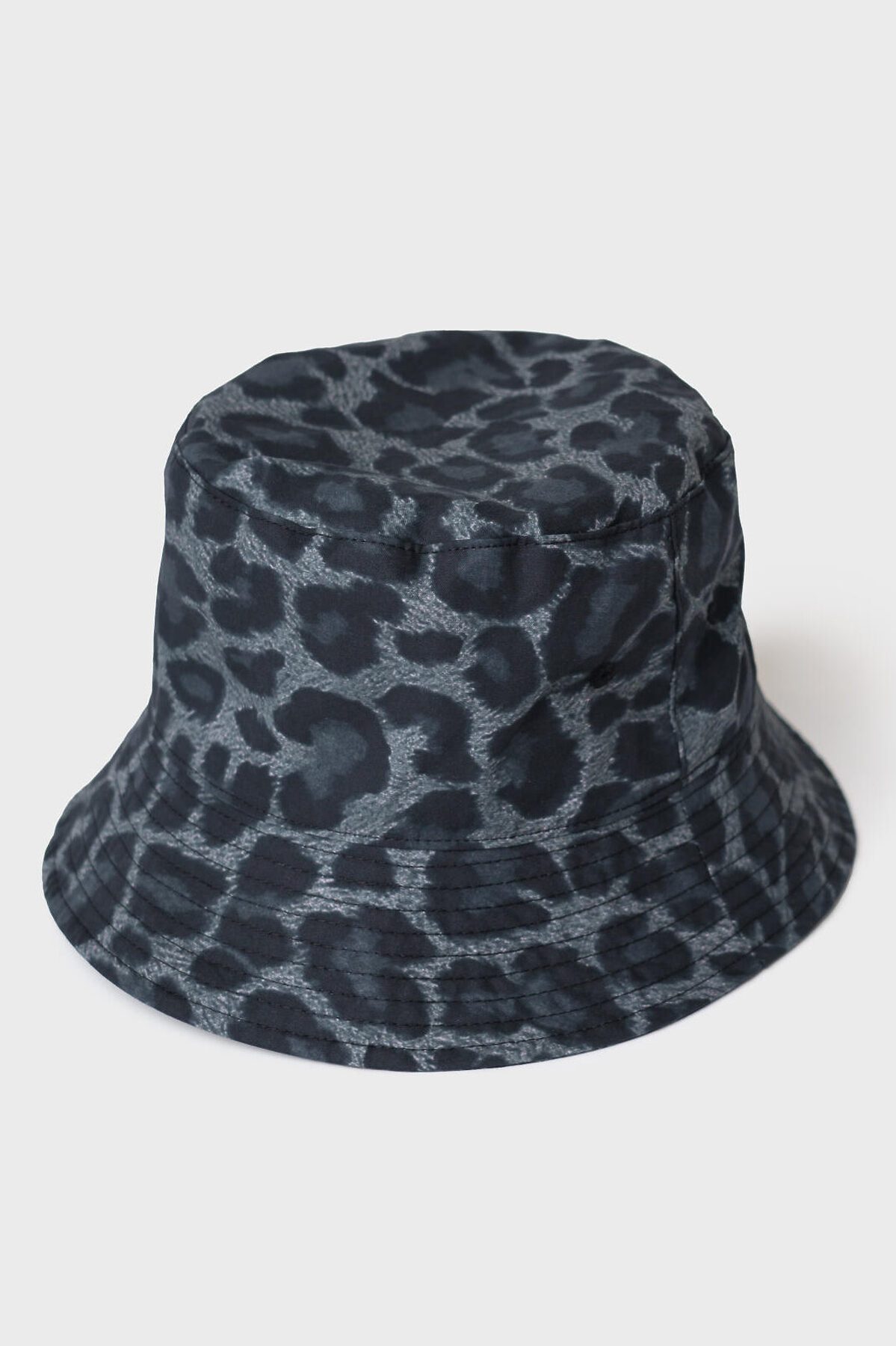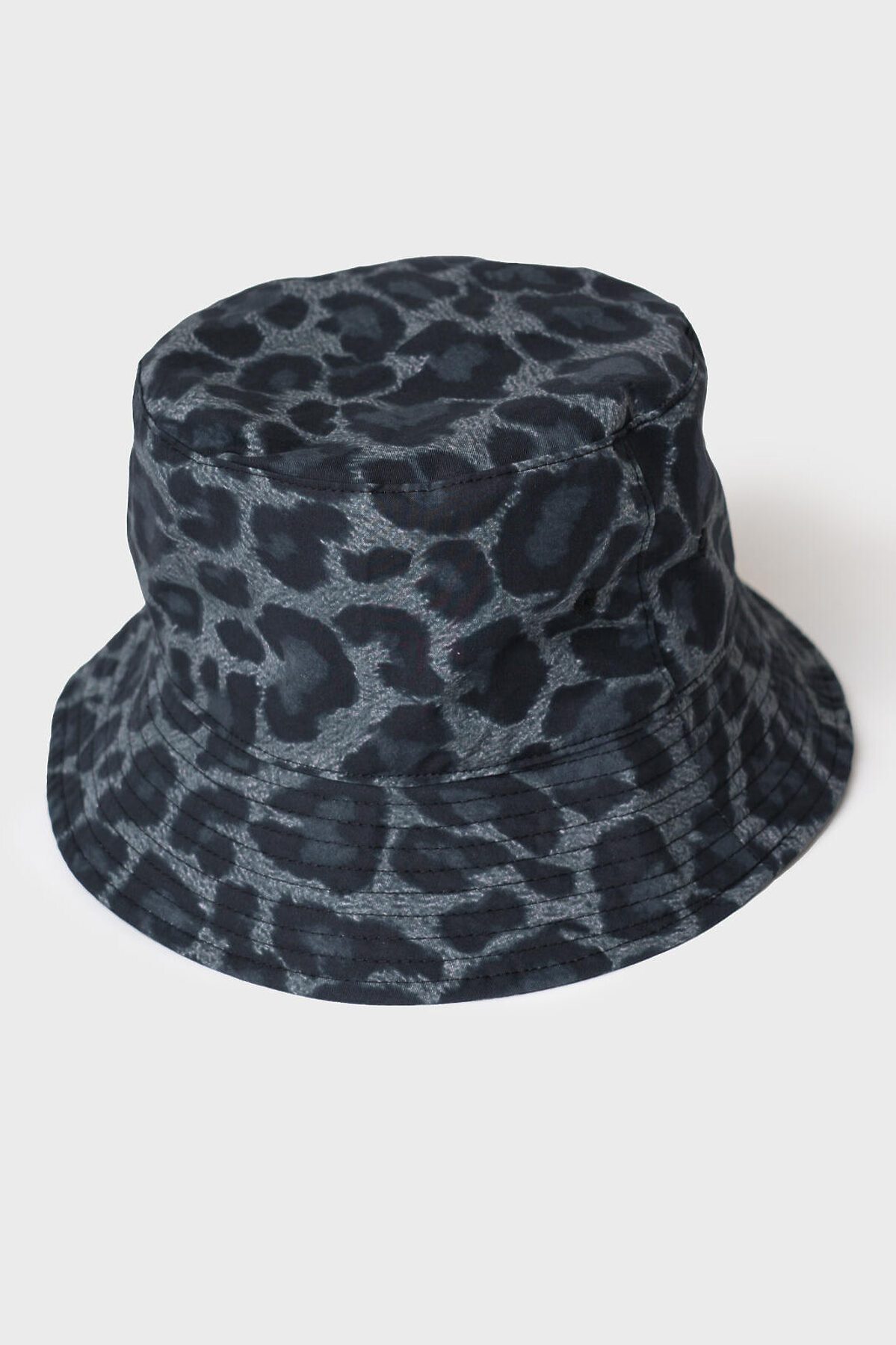 Женская панама с ярким леопардовым принтом. Изделие выполнено из плотного трикотажа с характерным рисунком и имеет однотонную чёрную подкладку. Панама имеет широкие поля с частой отстрочкой и вентиляционные отверстия по бокам.