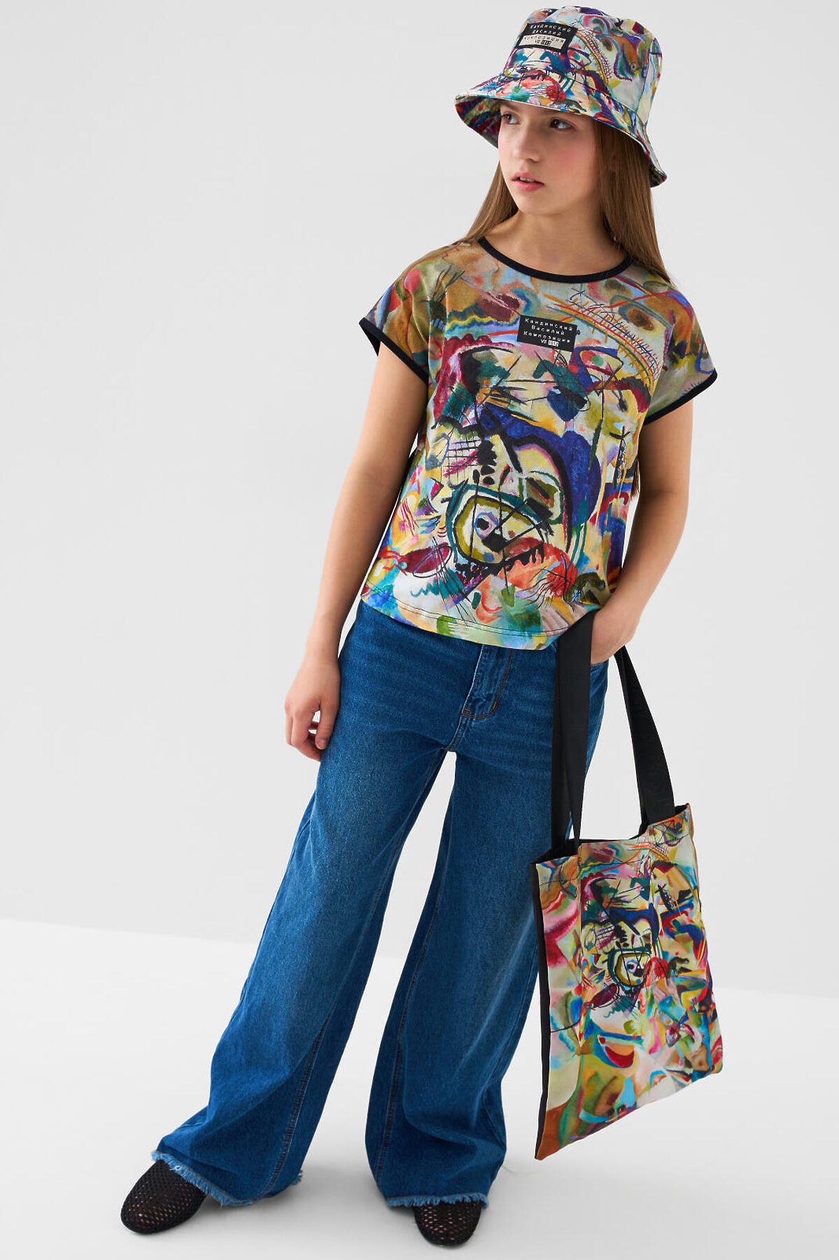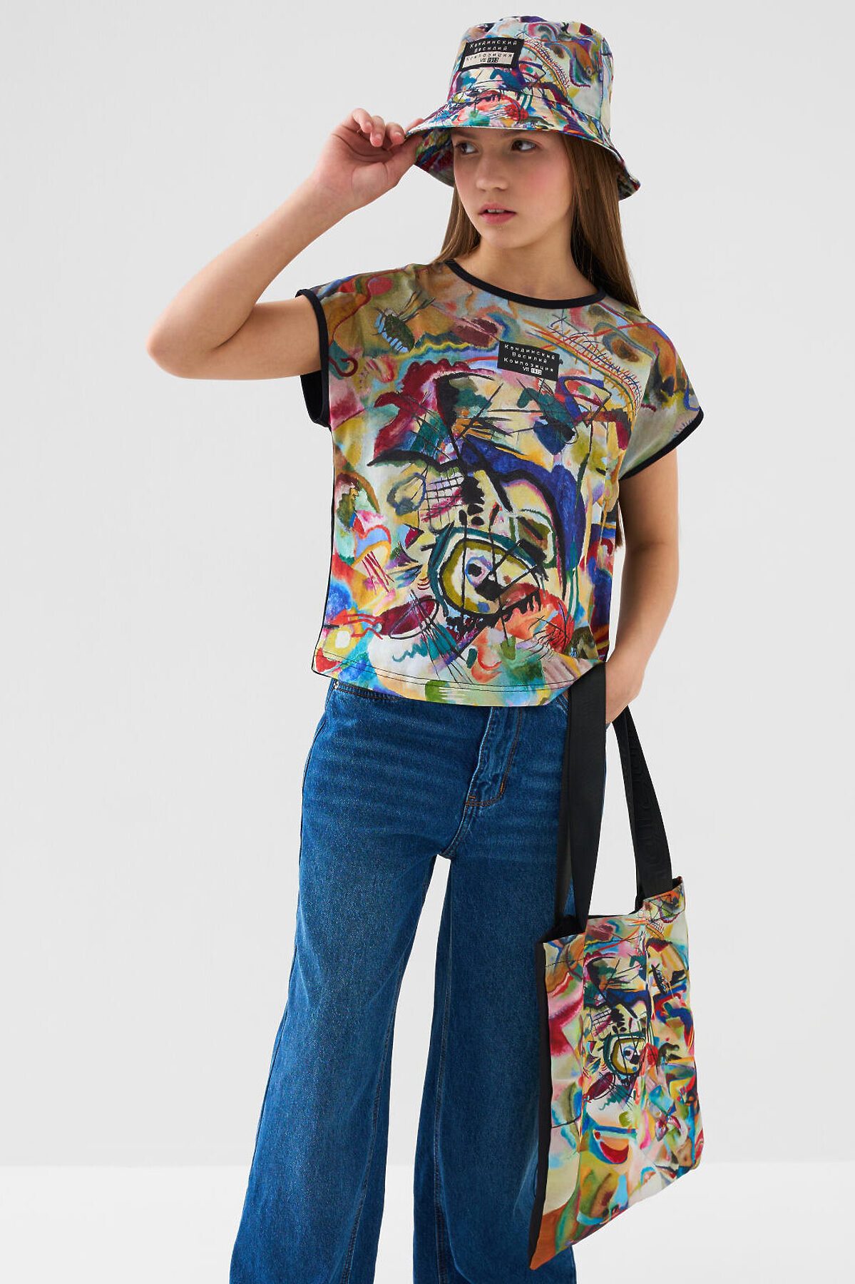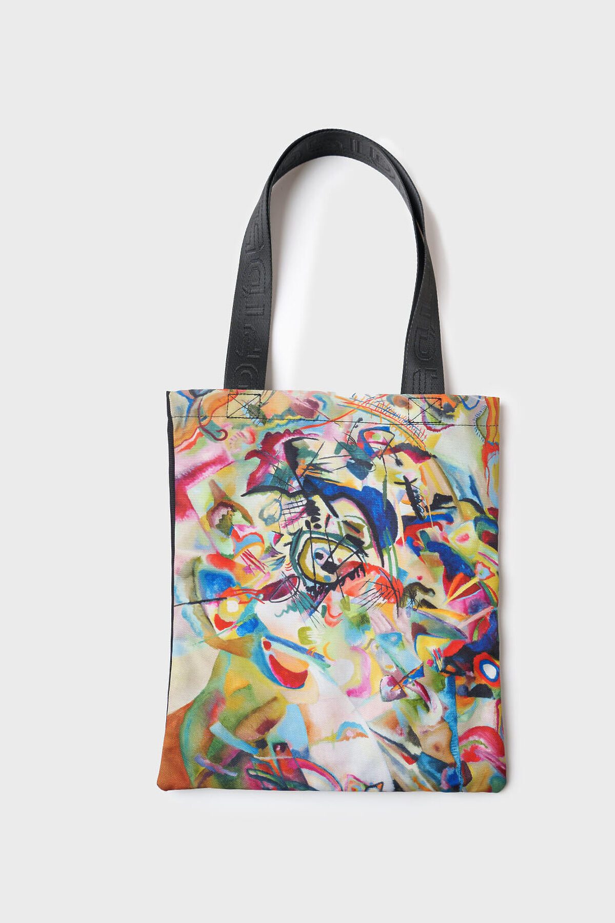 Легкая, вместительная и удобная сумка-шопер для девочки-подростка из коллаборации с Третьяковской галереей. Принт - фрагмент картины Василия Кандинского, Композиция VII, 1913. Она не занимает много места, если ее сложить и носить с собой и использовать при необходимости. Параметры сумки: высота - 39 см (без ручек), ширина -33см, глубина - 1 см