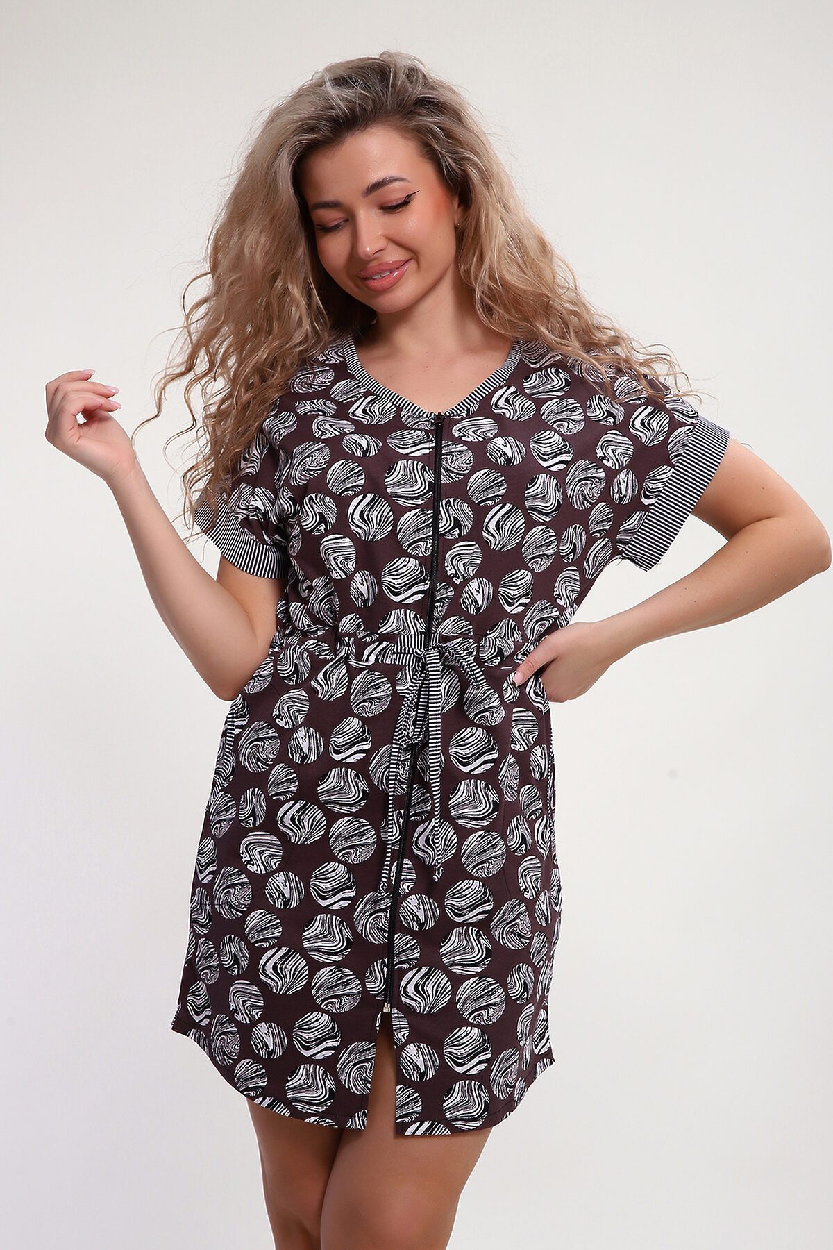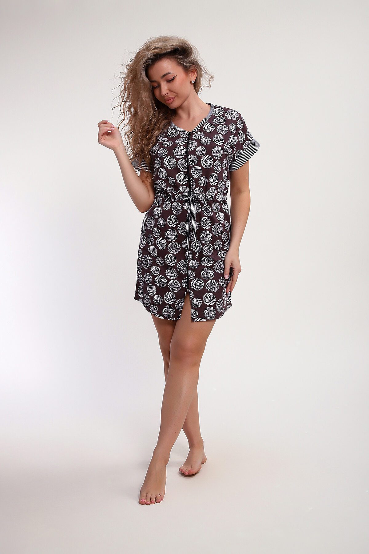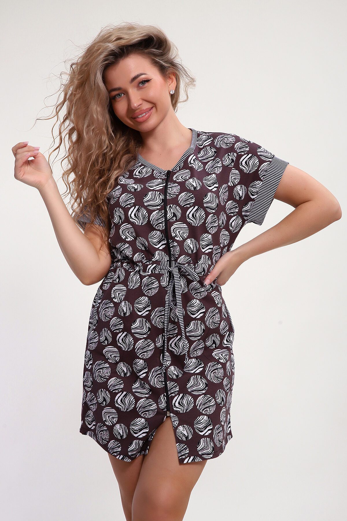 Женский трикотажный халат на молнии без сомнения станет самой желанной и любимой вещью в гардеробе любой дамы. Халатик укороченный, на кулисе со шнурком, с удобными карманами и молнией. Выглядит стильно и современно. Халатик такого плана подходит для фигур разного типа. Легкий и мягкий, качественный, дышащий, сшит из высококачественного трикотажа, подарит вам абсолютную непринужденность и легкость, простор в движении, идеально подойдет для беременных и кормящих и будет хорошим сопровождением в роддом и не вызовет раздражения, так как создан из натуральной ткани. Благодаря этому может стать прекрасным подарком для, мамы, подруги, бабушки, сестры или коллеги на любой праздник. Отлично сядет на женщин больших размеров. Данная модель будет кстати для отдыха на даче и даже поездки к морю. Домашняя одежда российского производства, имеет комфортную посадку, не линяет, не дает усадку после стирки и долго сохраняет первоначальный внешний вид. Халатик подчеркнет Ваш стиль и добавит молодежных нот в ваш образ, а затягивающийся пояс на талии придаст женственности и изящества вашему луку. Стирайте изделия из хлопка на бережном режиме с температурой не выше 30С, чтобы сохранить цвет, форму и фактуру материала. Приобретая наши изделия, радуйте себя и своих близких. Ориентируясь по таблице замеров, обратите внимание, что замеры длины рукава проводились от точки основания шеи.