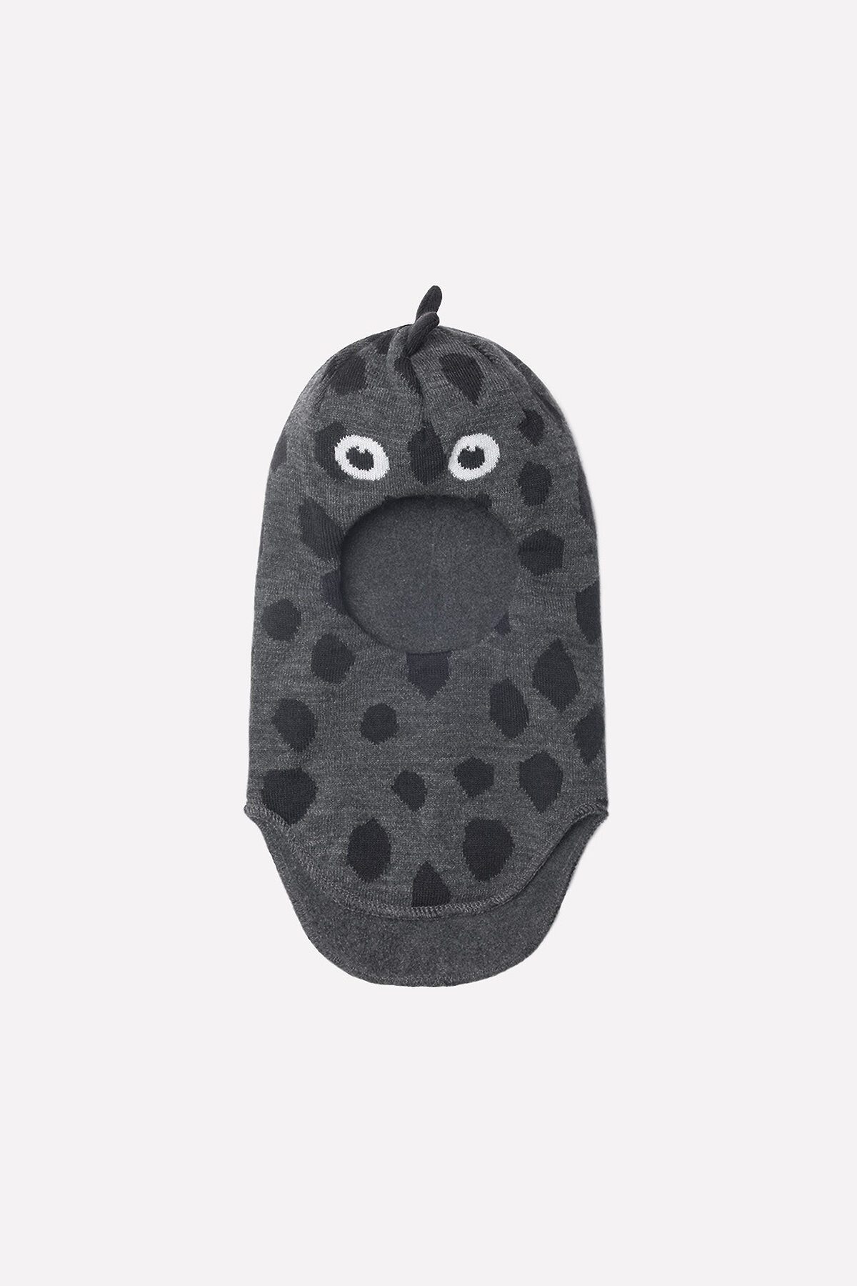 Шапка-шлем для мальчика, вязаная из полушерстяной пряжи, с узором. Подкладка из мягкого флиса. На макушке декоративные гребни, спереди рисунок.