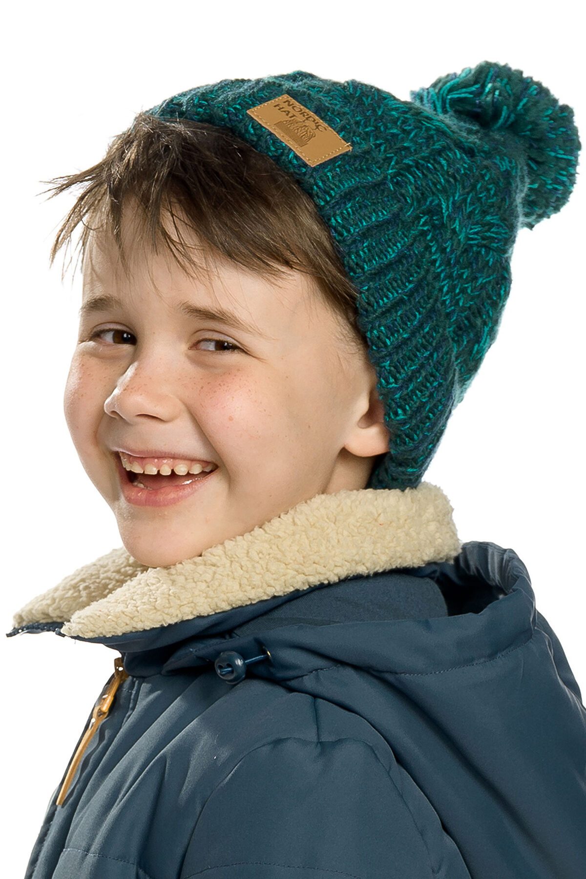 Шапка для мальчиков. Вязаная шапка с подкладом из флиса. Мягкая форма, с отворотом и помпоном. Вязка широкими объёмными косами. Трёхцветный меланж, нашивка из эко-кожи с надписью "Северная шапка".