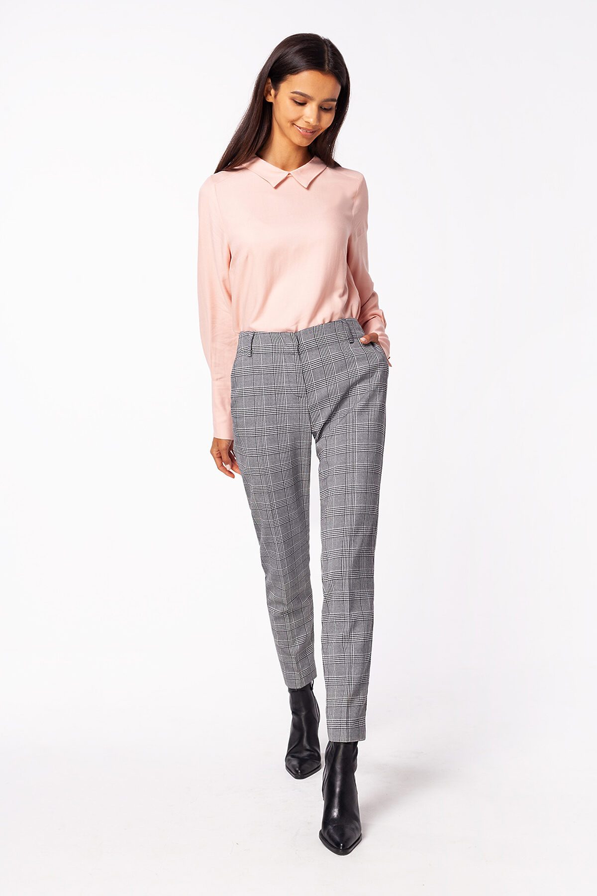 Блузка прямого силуэта. Застежка на воротнике сзади. Украшена высокими манжетами с рядом золотистых пуговиц. Плетение вискозы в рубчик придает ткани плотнсти и благородного блеска.
