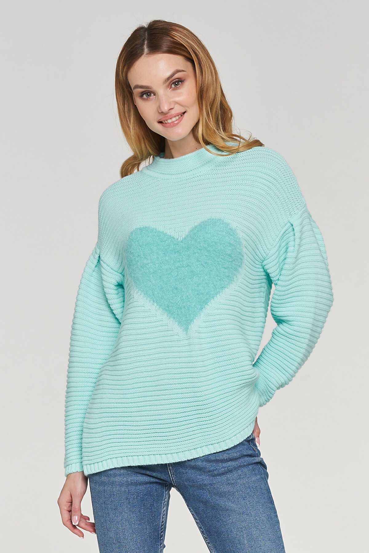Модный трикотажный джемпер свободного кроя с рукавами со спущенной линией плеча. Рукава пышные. Спереди трикотажный принт - сердце. Небольшая стоечка-горловина.