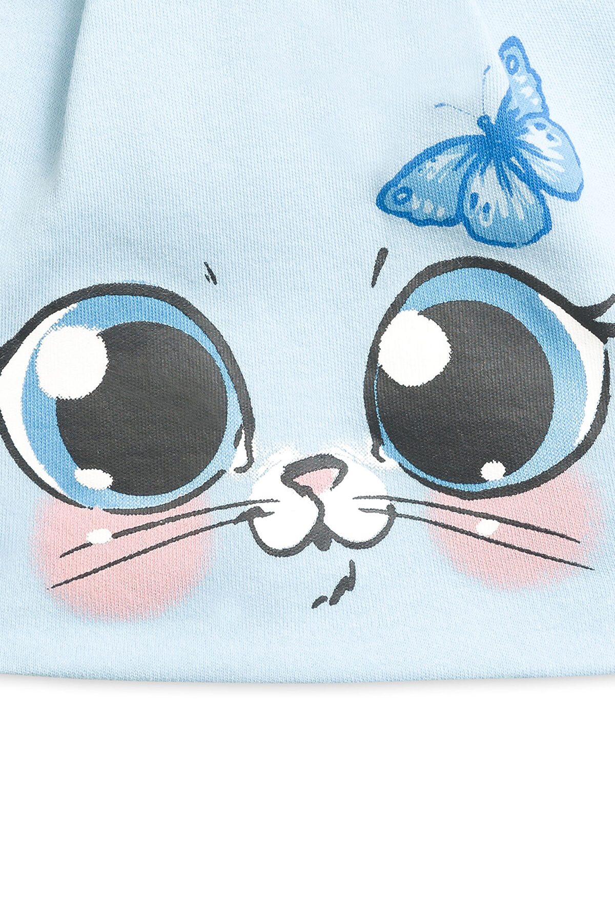 Шапка для девочек. НОВИНКА. Двойная шапочка из интерлока. В верхнем шве заложены защипы, благодаря которым уголки шапки, при одевании на голову, выглядят как ушки. Стойкий принт в виде кошачьей мордочки.