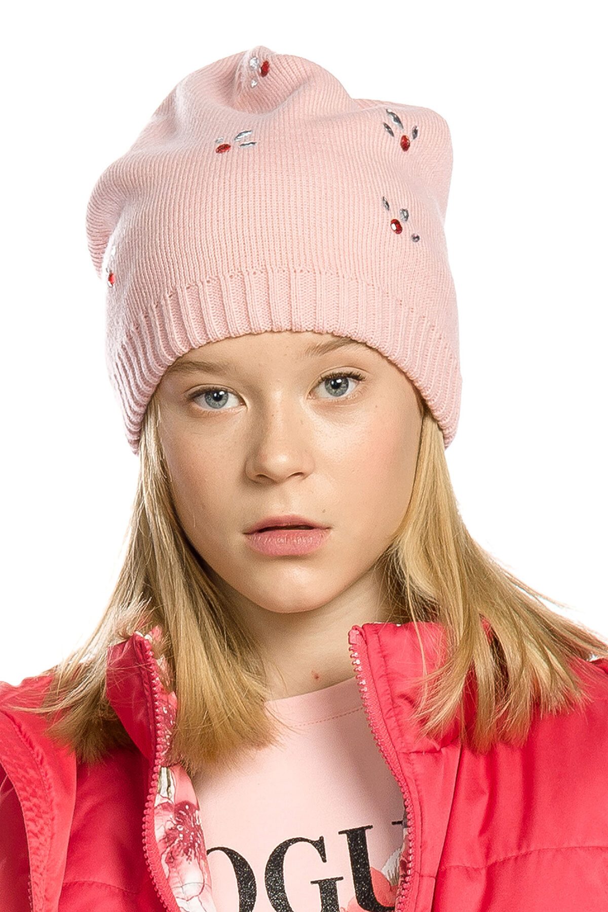Шапка для девочек. Двойная вязаная шапка формы «топорик» без отворота. Связана из мягкой тонкой пряжи с рибаной по низу. Передняя половина украшена россыпью цветов из разноцветных страз.