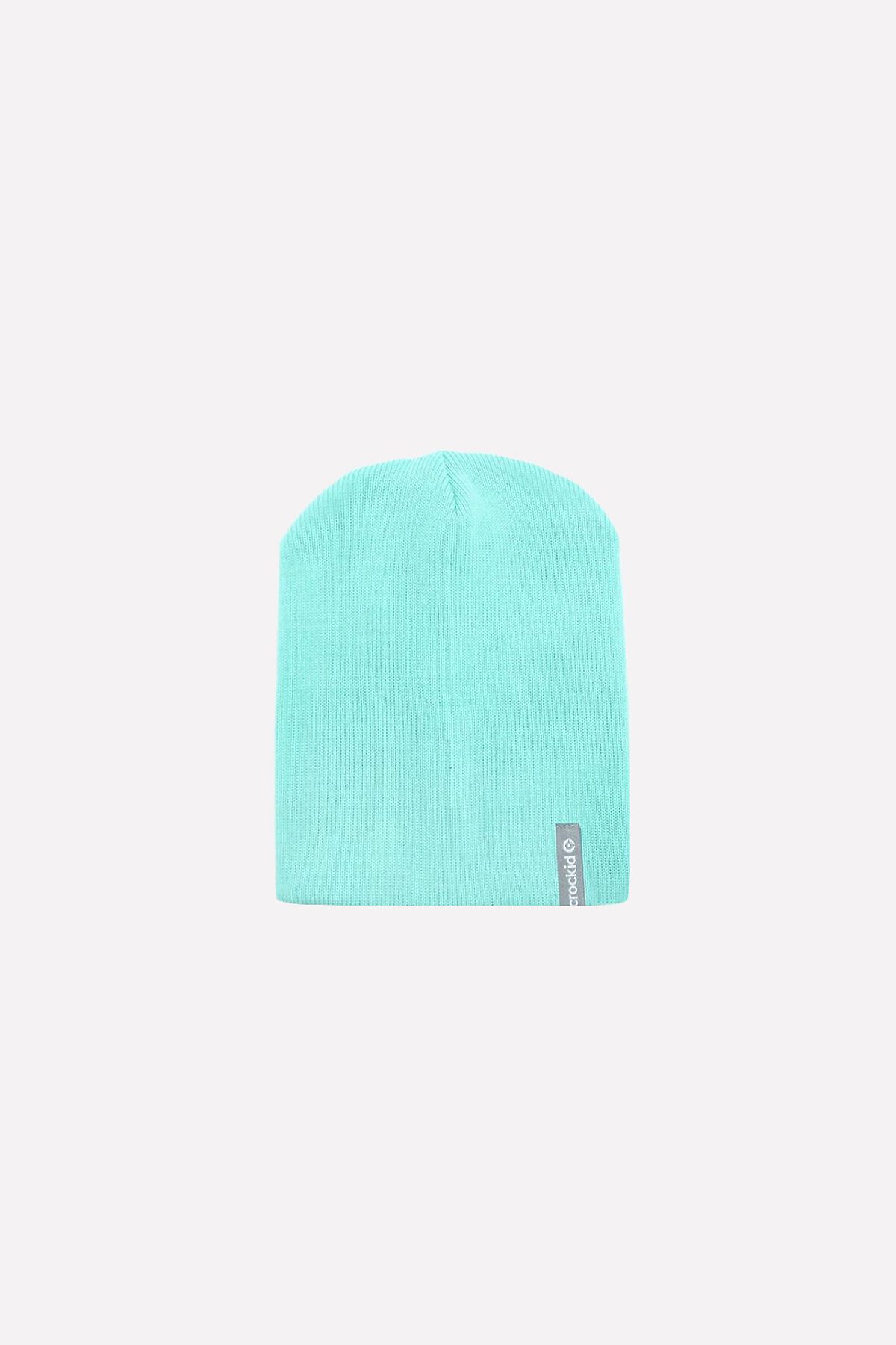 Шапка для девочки, вязаная из однотонной акриловой пряжи. Полотно в два слоя. Жаккардовая бирка.