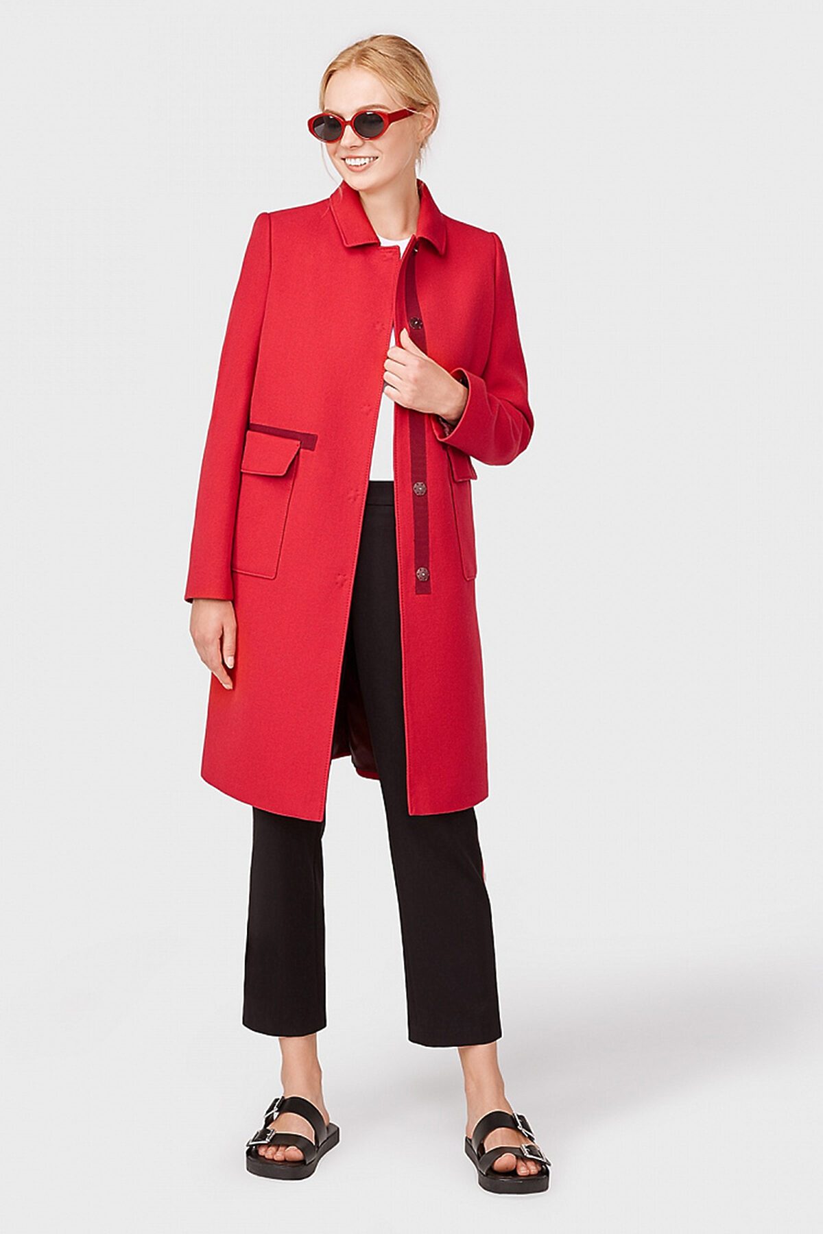 Пальто прямого силуэта с накладными карманами с клапанами и декоративными репсовыми тесьмами по линии талии, борту и спинке. Длина чуть выше колена. Классический втачной рукав, отложной воротник, центральная застёжка на пришивные кнопки, рельефы на полочке и спинке, хлястик на спинке. Декорировано отделочными строчками. Пальто изготовлено из шерстяной ткани с диагональной структурой яркого красного цвета. Все измерения даны на базовый 46 размер. Длина изделия (170 см): 94,5 Длина рукава (170 см): 63,0 Ширина рукава (охват плеча): 37,0 Ширина рукава (по низу): 27,0 Обхват груди: 104,6 Обхват бедер: 112,0 Рост модели на фото - 175 см. Цвет одежды на фотографиях может незначительно отличаться от оригинального. !!!Внимание, закрыты отгрузки в следующие города: Архангельск, Белгород, Благовещенск, Великий Новгород, Великие Луки, Вологда, Волосово, Выборг, Гатчина, Иваново, Иркутск, Колпино, Кириши, Комсомольск-на-Амуре, Котлас, Миасс, Мурманск, Нижний Тагил, Оренбург, Петрозаводск, Петергоф, Пскоф, Санкт-Петербург, Смоленск, Северск, Старый Оскол, Сургут, Тихвин, Томск, Тверь, Усинск, Уфа, Улан-Уде, Ханты-Мансийск, Электросталь, Элиста, Якутск, Калининград.