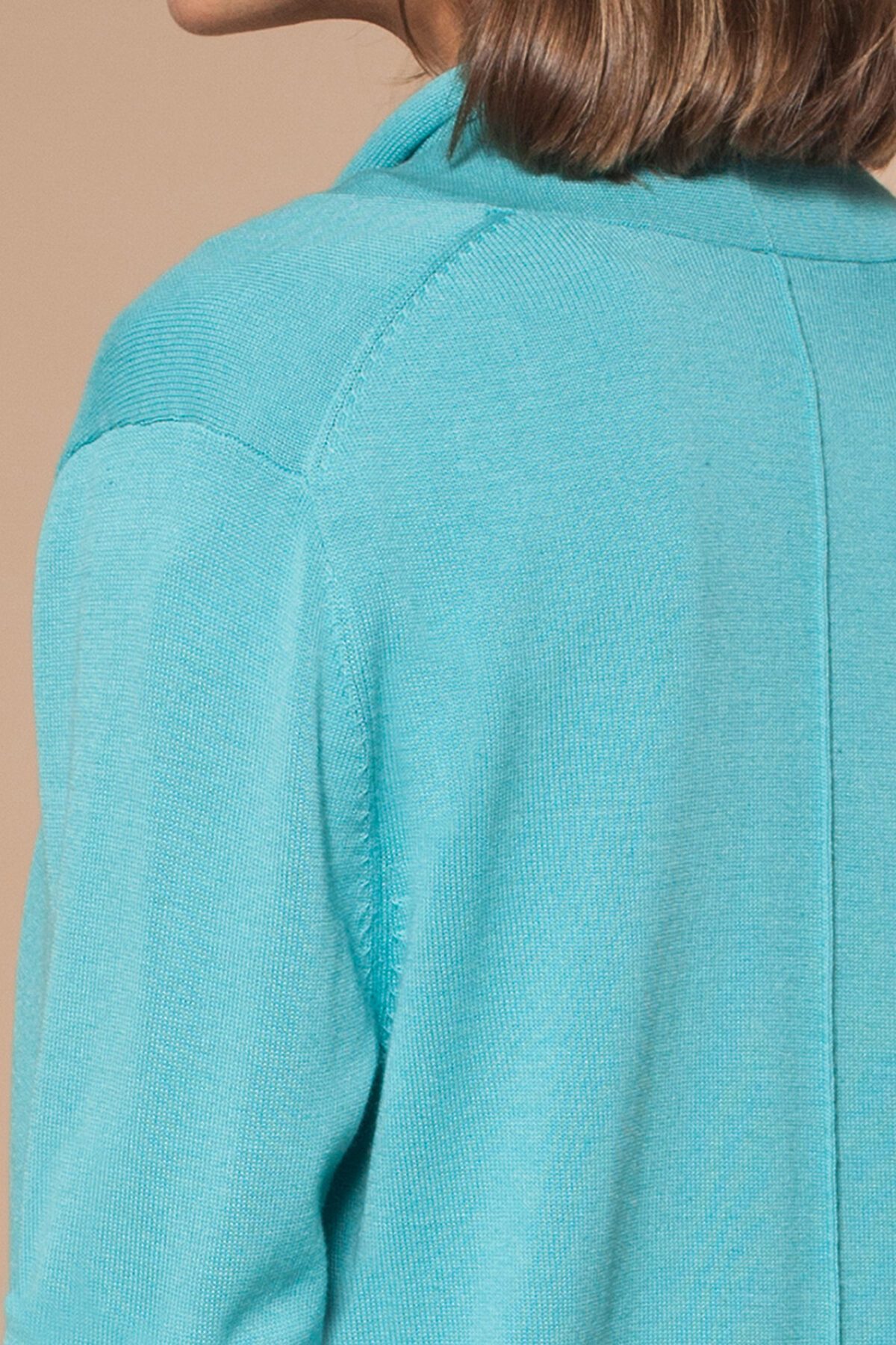 Кардиган выполнен из пластичной пряжи - смеси хлопка с вискозой. На спинке расположен декоративный шов, ворот выборлнен свободной шалью. Классический, чуть удлиненный силуэт с закруглением по низу спинки. Идеально подходит для многослойных весенних образов и актуален прохладными летними вечерами.