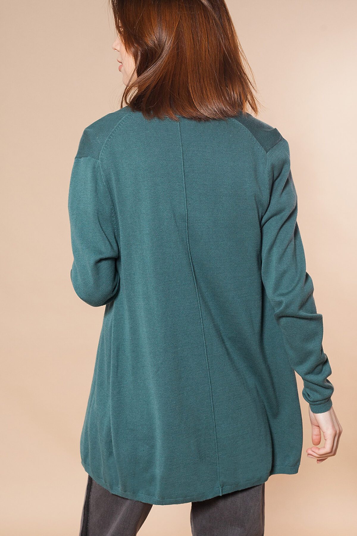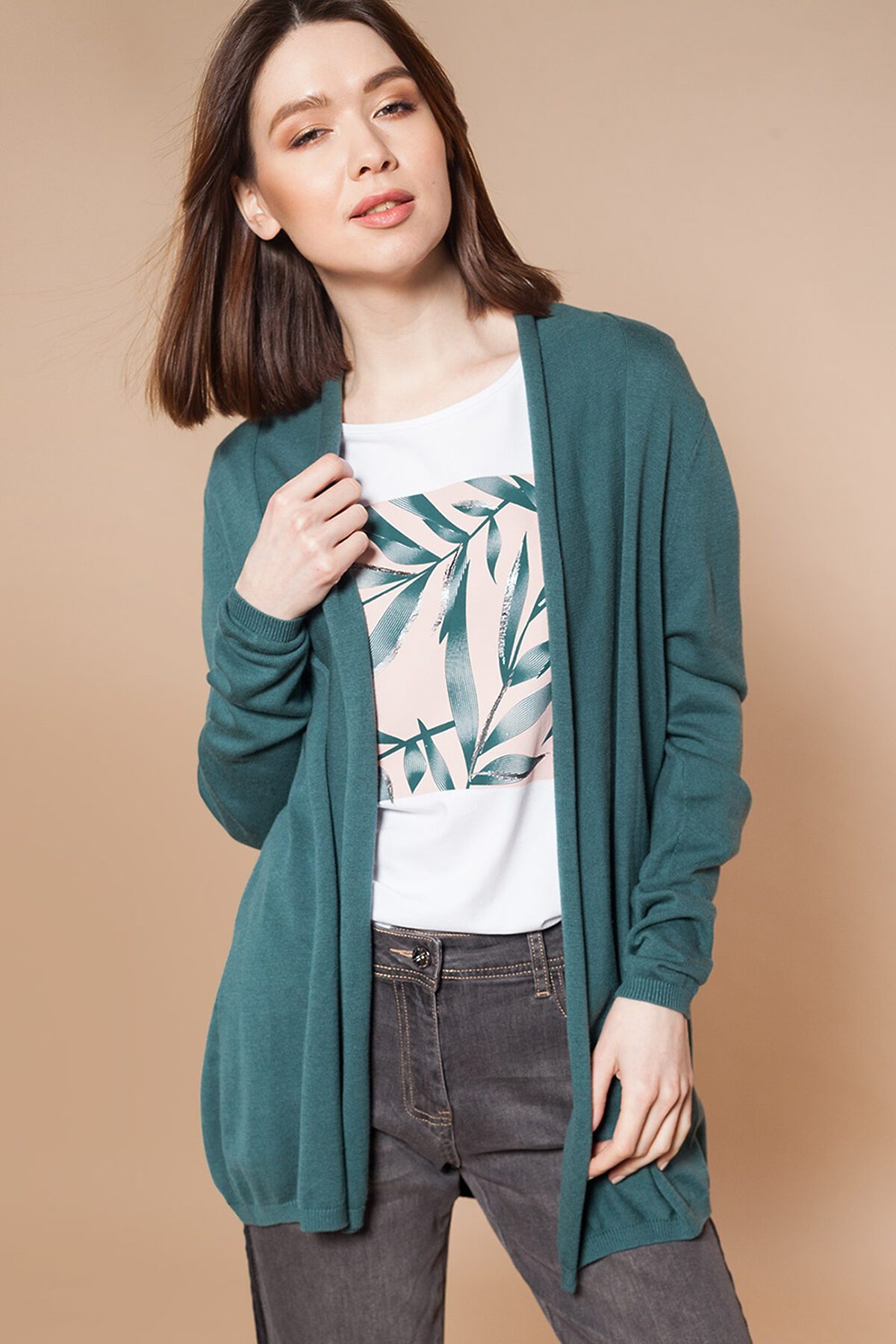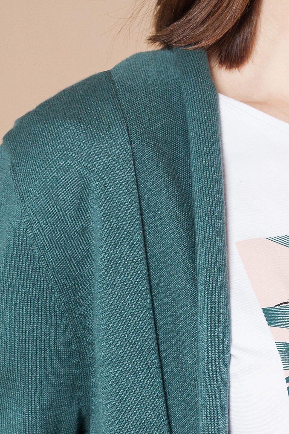 Кардиган выполнен из пластичной пряжи - смеси хлопка с вискозой. На спинке расположен декоративный шов, ворот выборлнен свободной шалью. Классический, чуть удлиненный силуэт с закруглением по низу спинки. Идеально подходит для многослойных весенних образов и актуален прохладными летними вечерами.