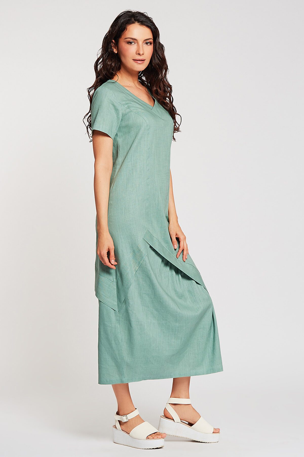 Удлинённое льняное платье с коротким рукавом, V-образным вырезом и большими накладными карманами. По низу платье декорированно диагональными складками.