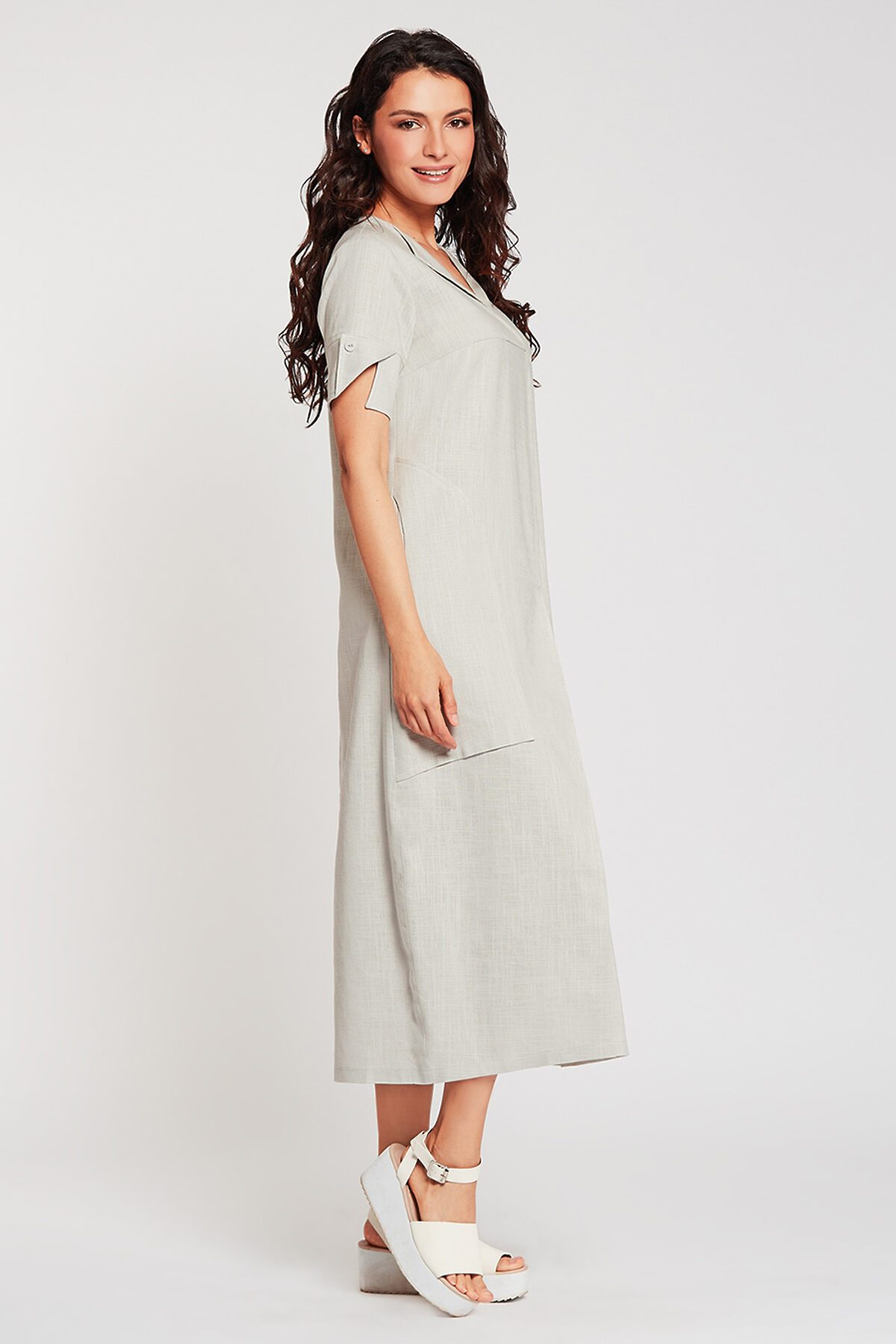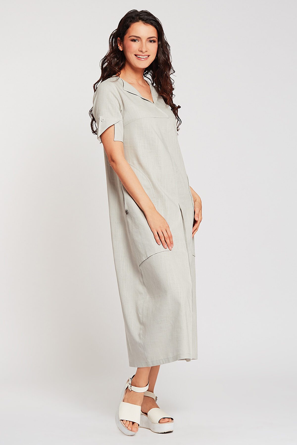 Свободное летнее платье из льняной ткани с добавлением хлопка. Интересные рукава с декоративной отделкой, комфортные глубокие карманы.