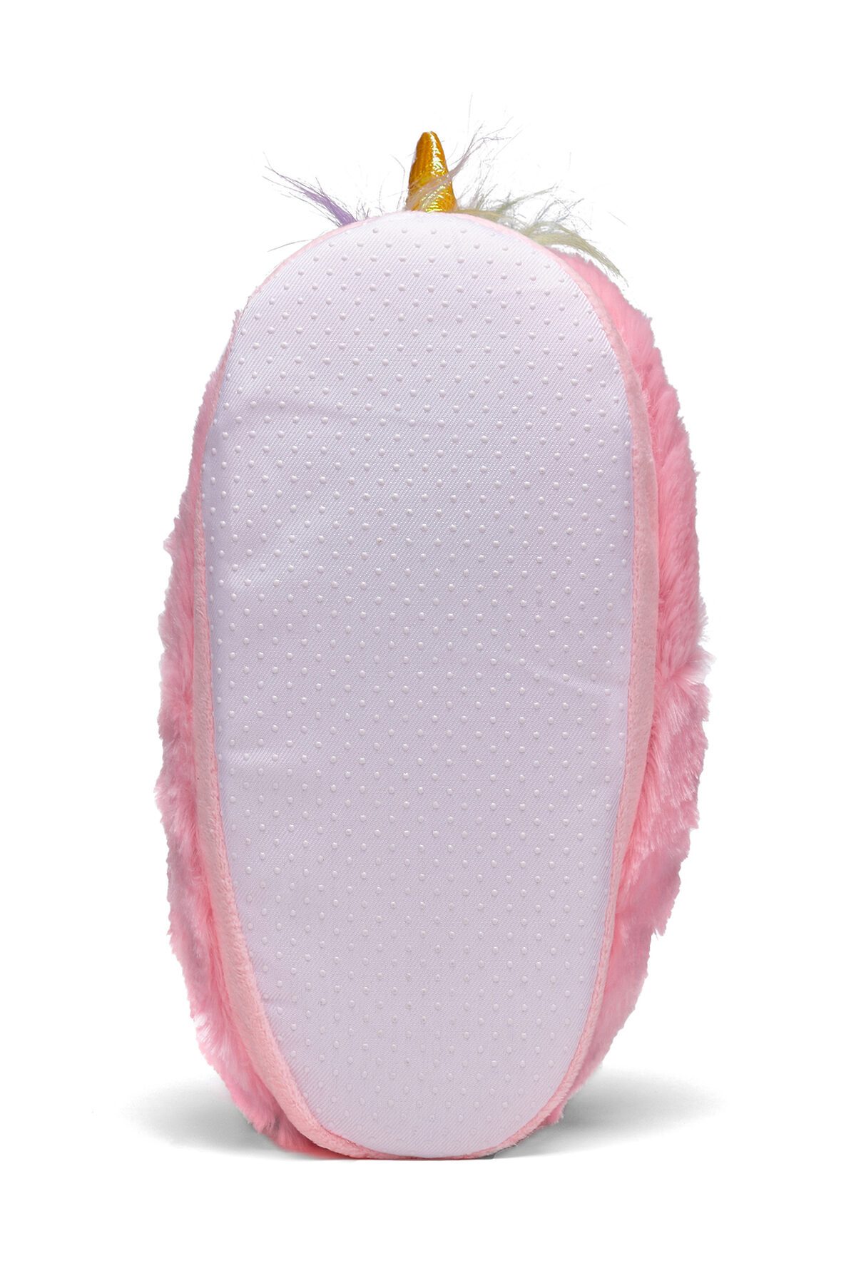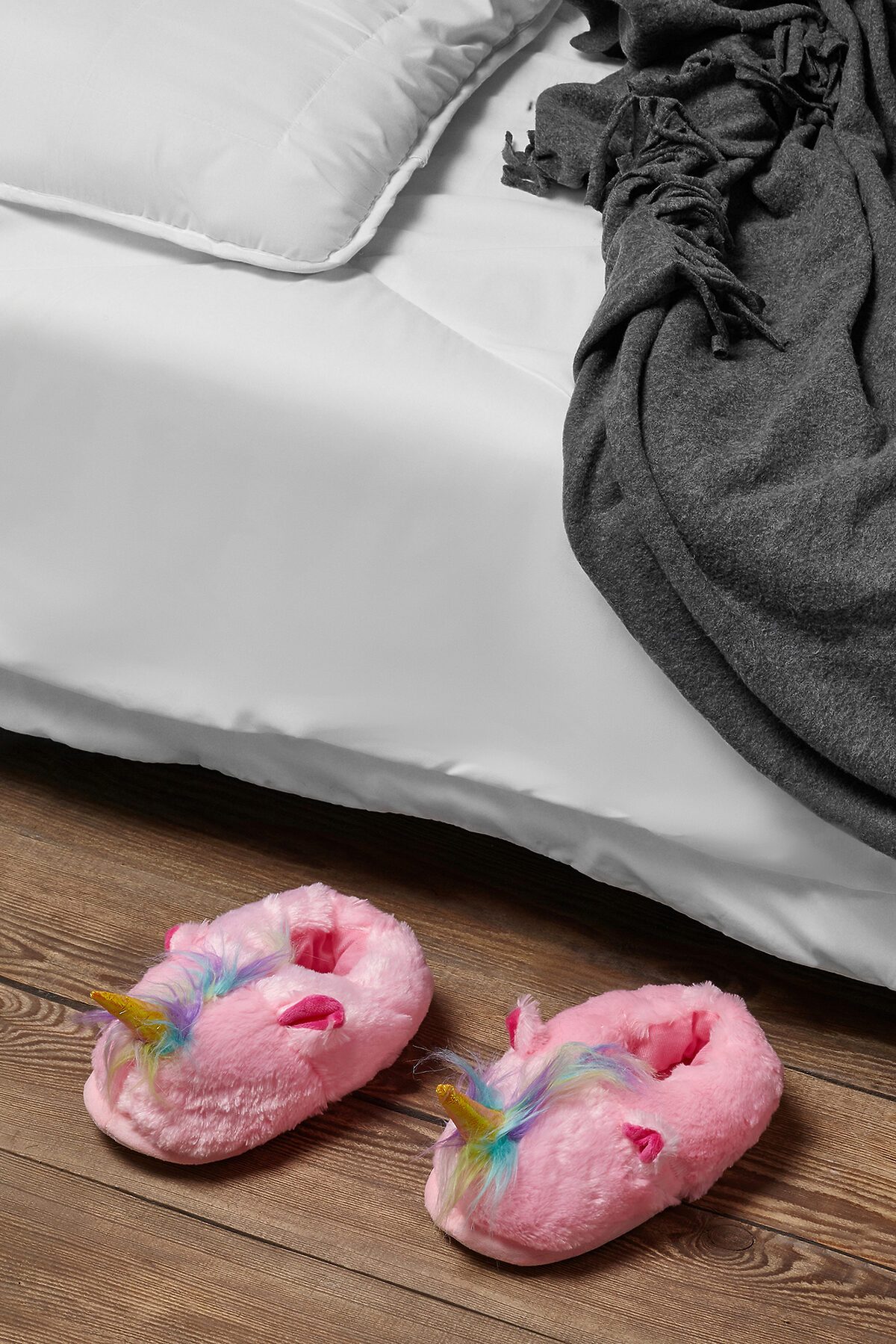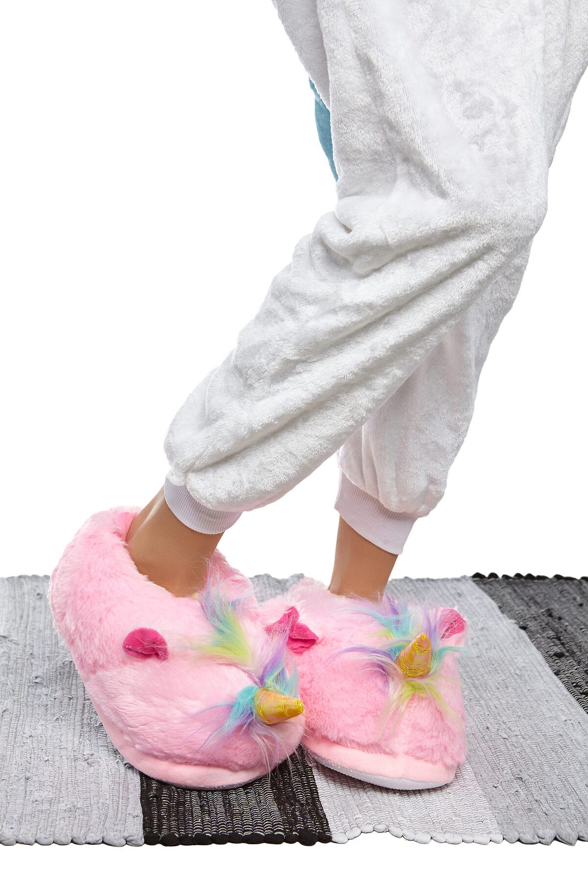 Тапки с закрытой пяткой выполнены из мягкого материала. Прекрасно держат ногу, за счёт плотного наполнителя. Сверху красуется плотно набитый блестящий золотой рог. Подошва с антискользящей поверхностью, достаточно плотная, но вместе с тем гибкая и легкая.