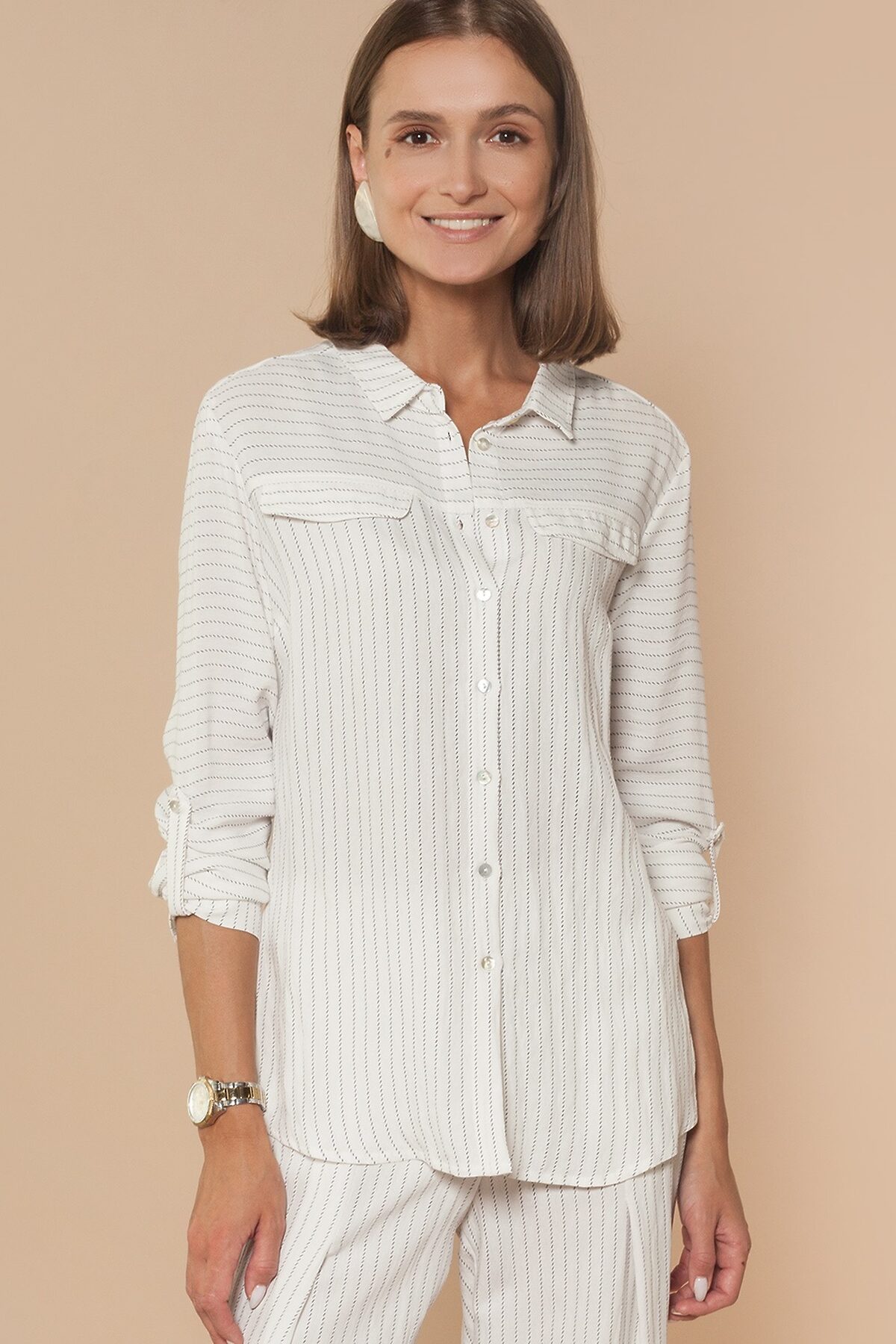 Блузка фактурного плетения с эффектом жатки позволяет избегать сминаемости. Свободный силуэт и трендовые симметричные клапаны. Благодаря фактуре ткани достигается эффект расслабленного образа в эко-стиле, что очень актуально в летнем гардеробе. Яркий акцент - золотистые пуговицы.