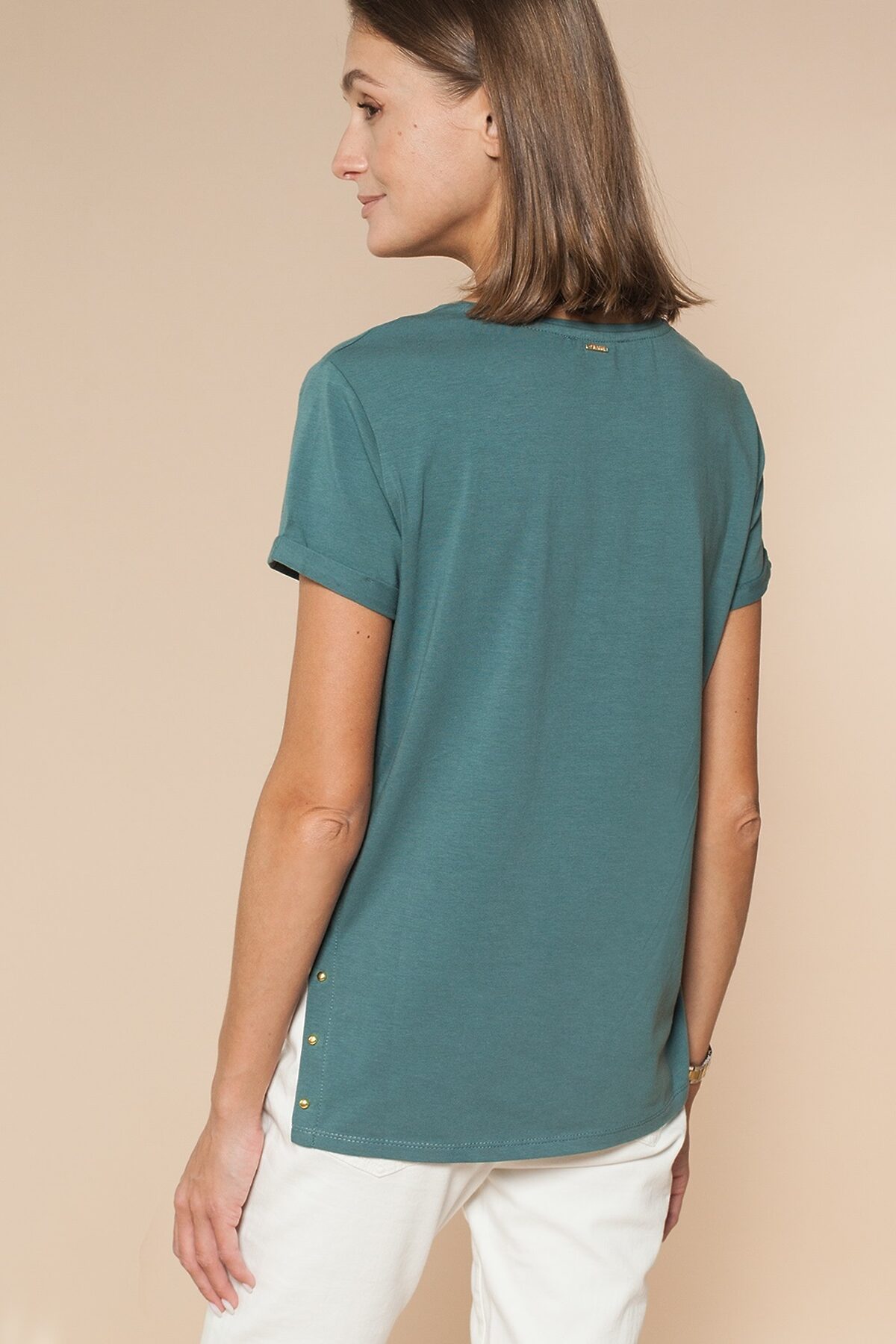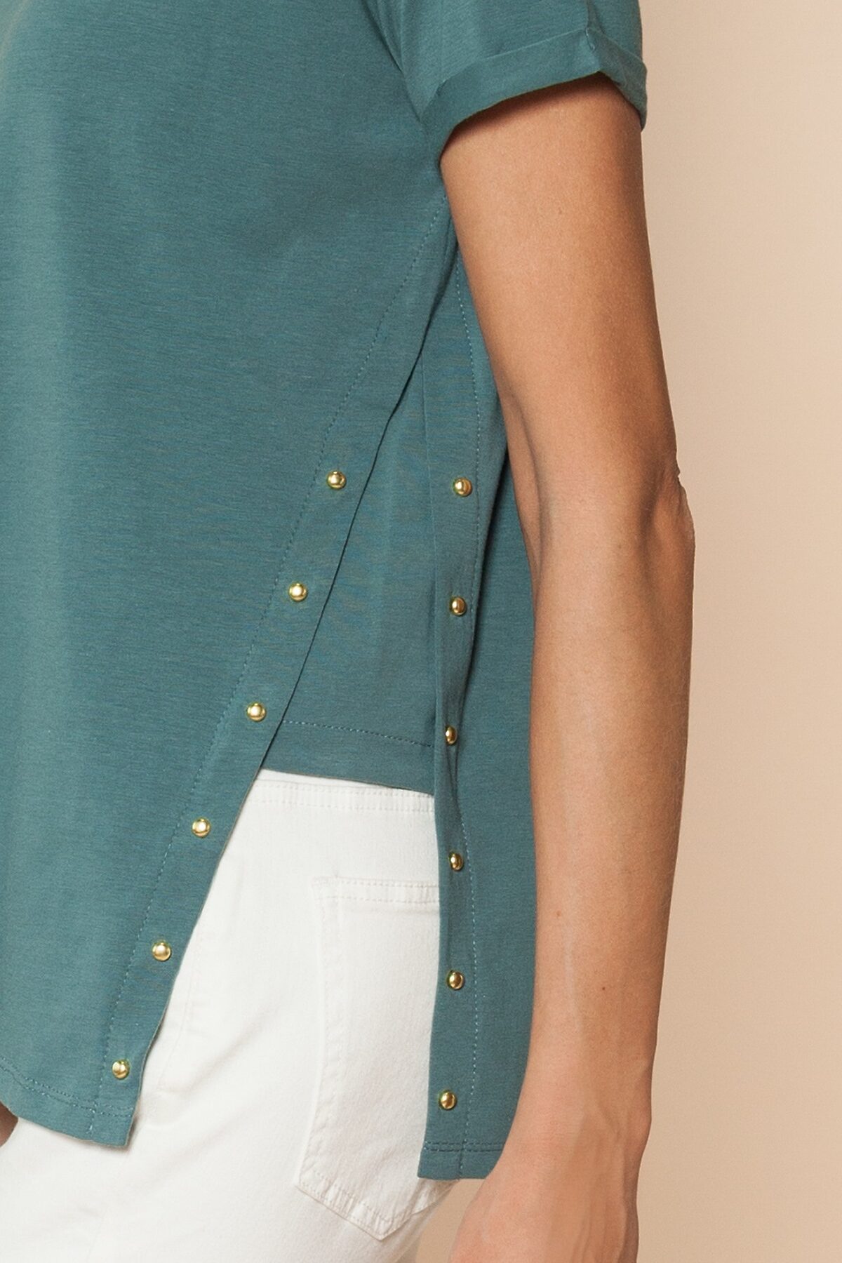 Футболка дизайнерского асимметричного кроя - с декоративной формой одного бокового шва - укороченная внутренняя часть с одной стороны. Изогнутые края бокового разреза украшены металлическими клепками.