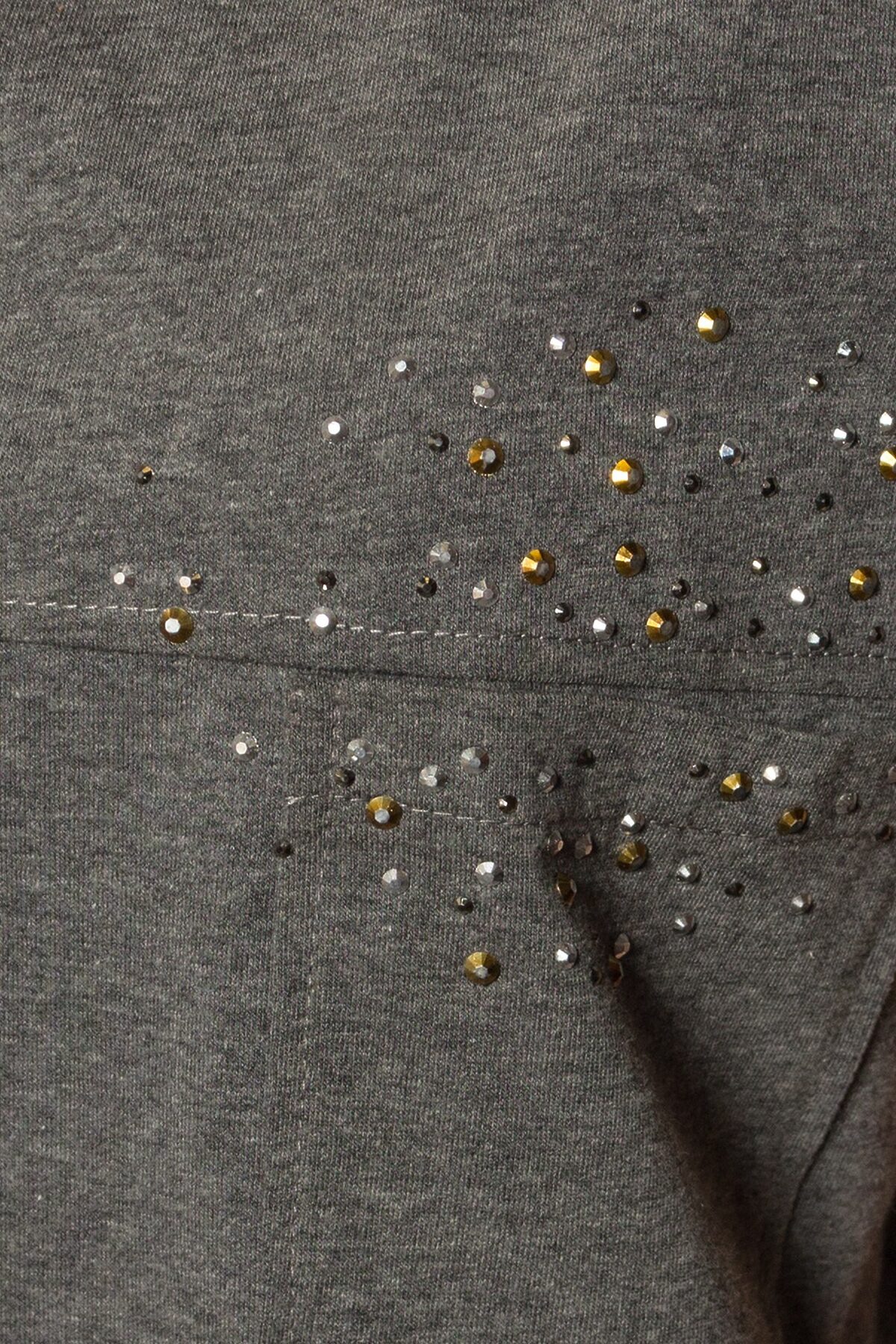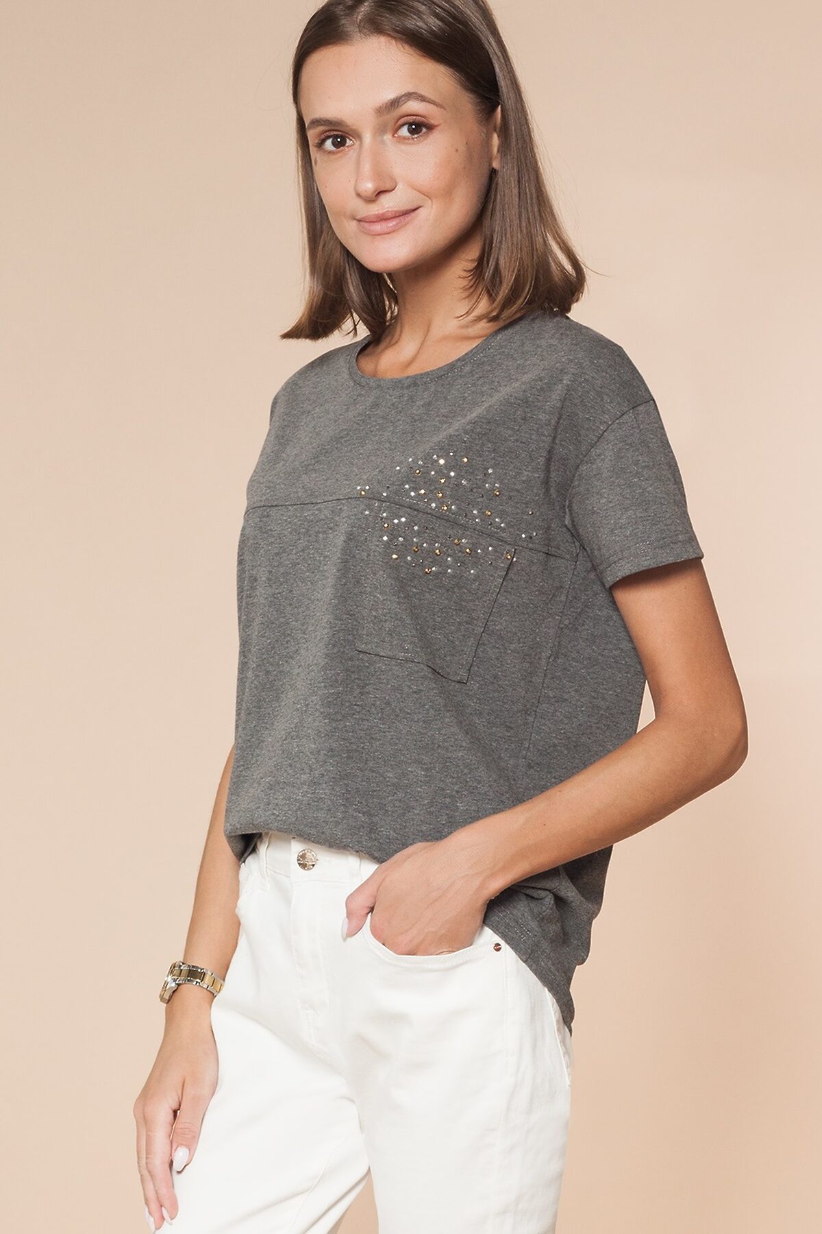 Футболка с кокеткой спереди. С добавлением кармашка. Кармашек и часть кокетки украшены асимметричной группой страз нескольких форм и расцветок. Рукав с отворотоми, зафиксированными закрепками.