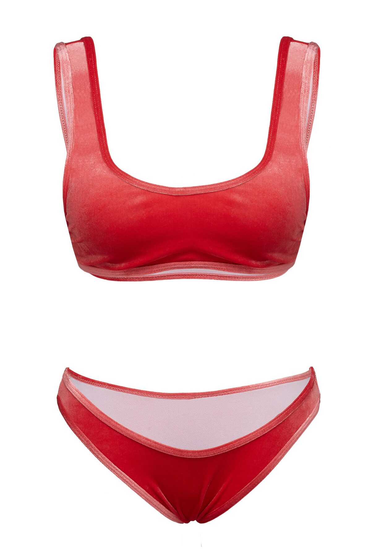Купальник выполнен из плотного велюра. Подкладка мягкая, приятная на ощупь. Верхняя часть купальника имеет форму топа с уплотненными чашечками, уплотнители съемные. Параметры модели на фото 88-60-88 см, рост - 166 см. На ней купальник размера S.