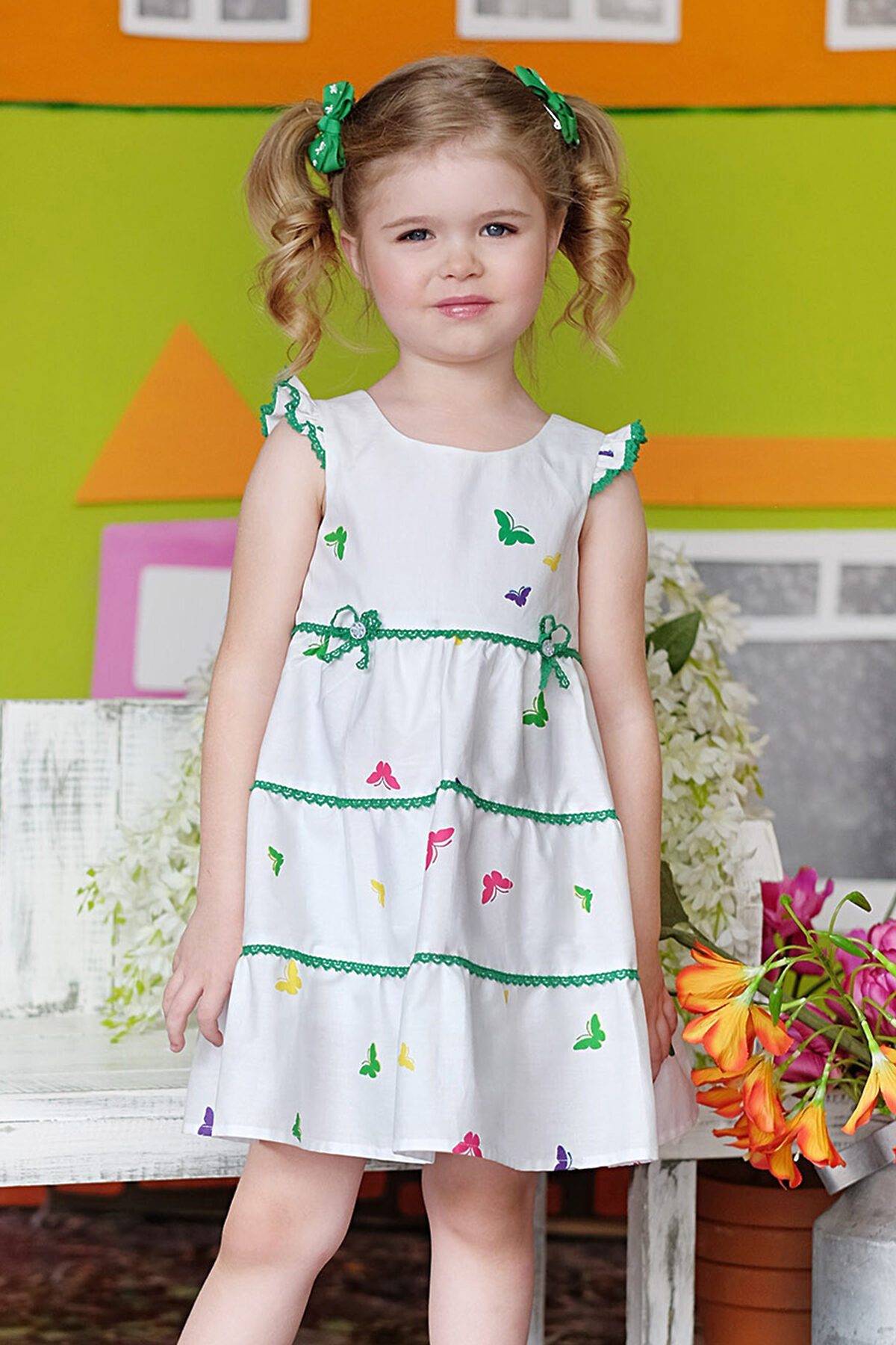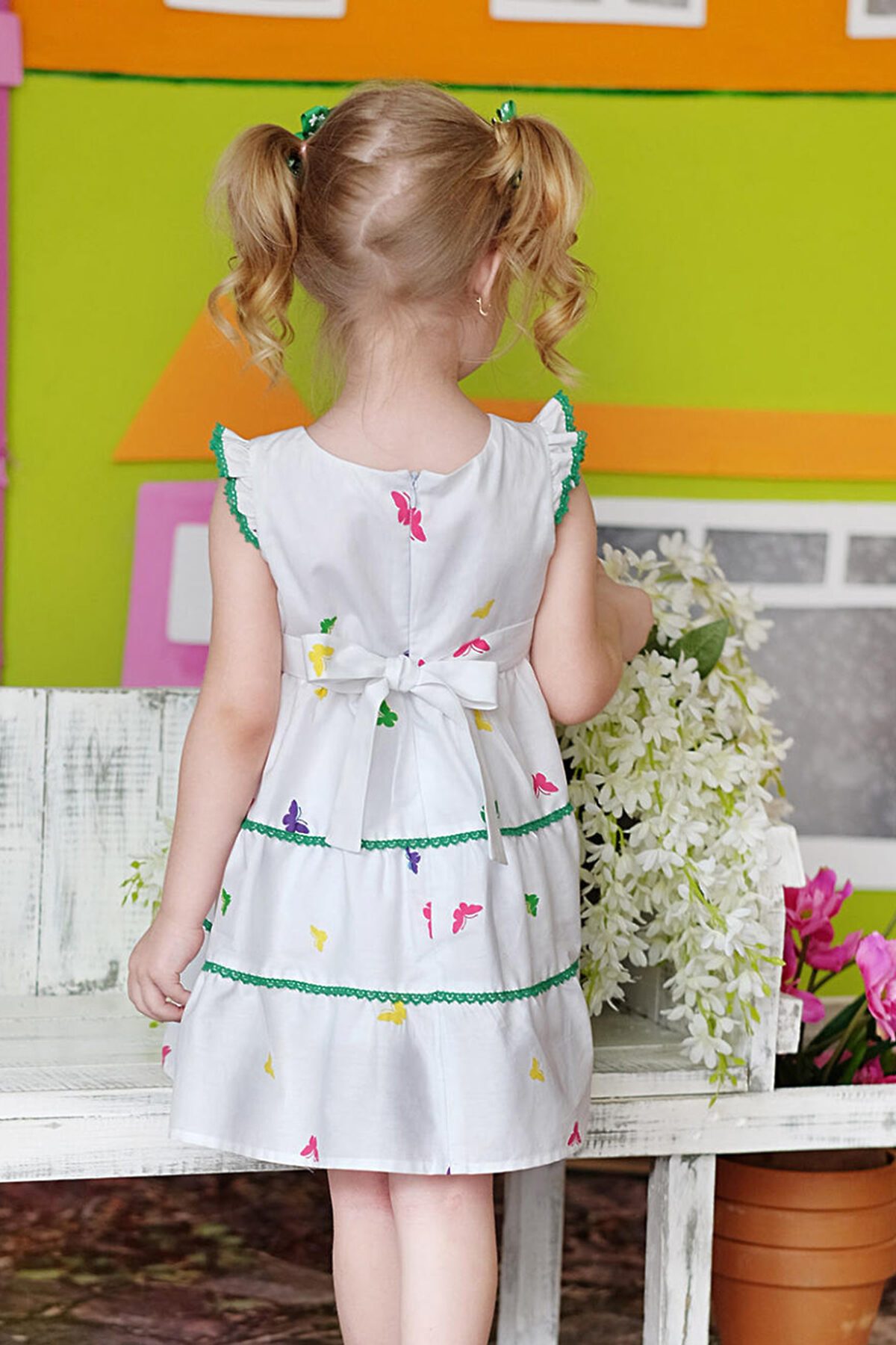 Милое платье для маленьких принцесс, выполнено из ткани с принтом "бабочки". Лиф с классическим круглым вырезом по горловине и рукавами-крылышками, модель с завышенной талией. Передняя часть лифа декорирована миниатюрными бантиками из тесьмы и пуговками, юбочка платья и края рукавов-крылышек также отделаны тесьмой. Платье застегивается сзади на потайную молнию и фиксируется поясом на талии. Изделие выполнено на хлопковом подкладе.