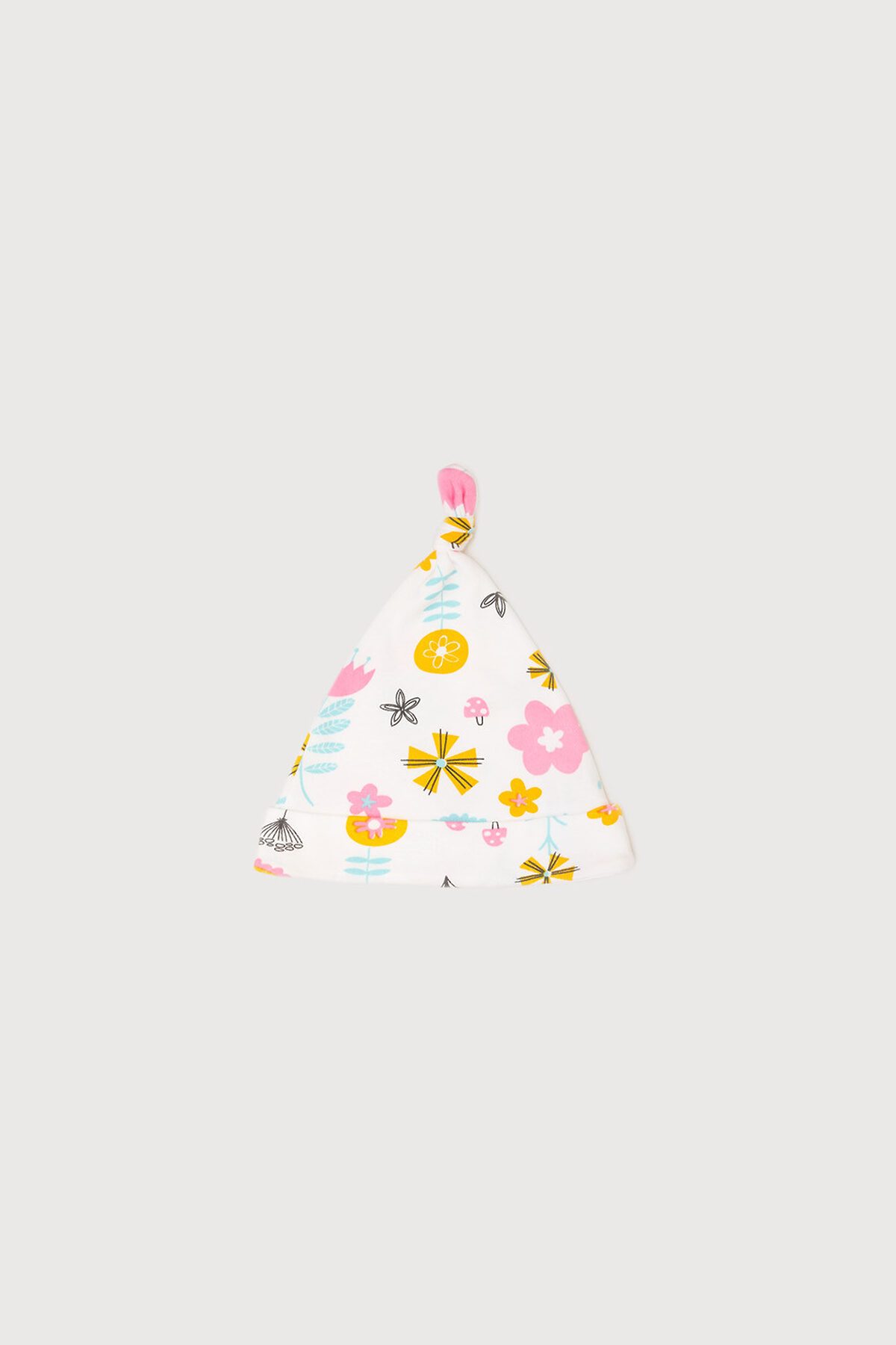 Шапочка двойная из однотонного хлопкового трикотажа интерлок, снизу отворот. Сверху декоративный узелок.